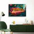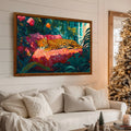 Poster Of Lush Tropical Paradise With Leopard Sleeping On Pink Floral Daybed Amid Exotic Foliage