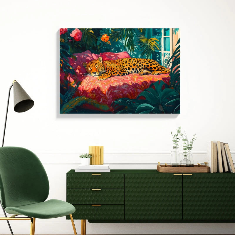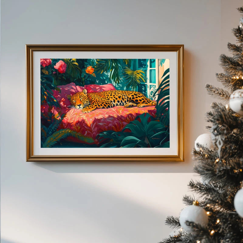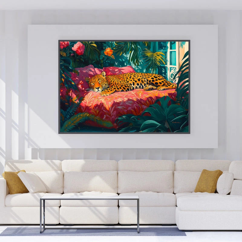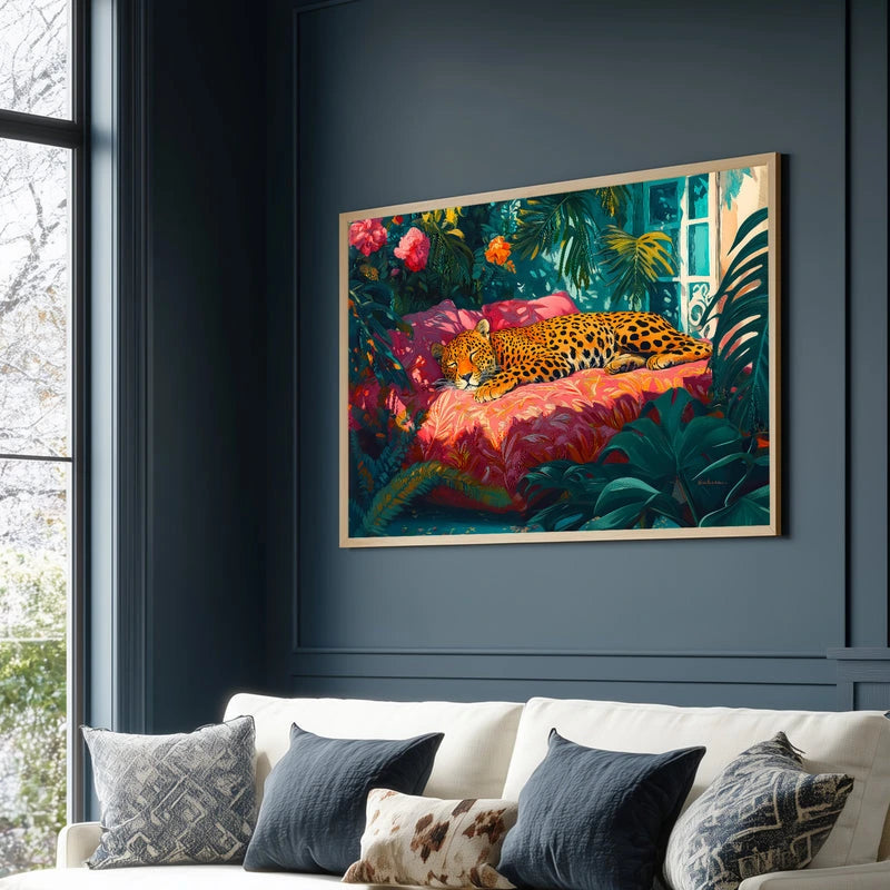 Escape to a wild wonderland with this whimsical poster featuring a lounging leopard living its best life on a fabulous pink floral daybed. Surrounded by lush tropical foliage and exotic blooms, this dreamy scene brings a splash of adventurous charm and vibrant personality to any room. Perfect for adding a touch of jungle-chic flair to bedrooms, living spaces, or creative studios. Let your imagination roam free with this playful celebration of nature's most glamorous side.