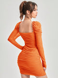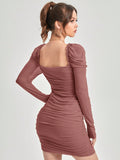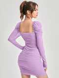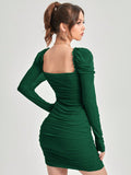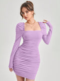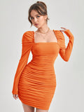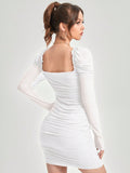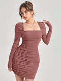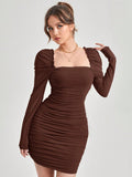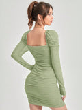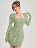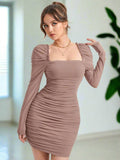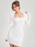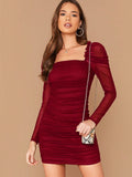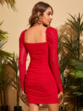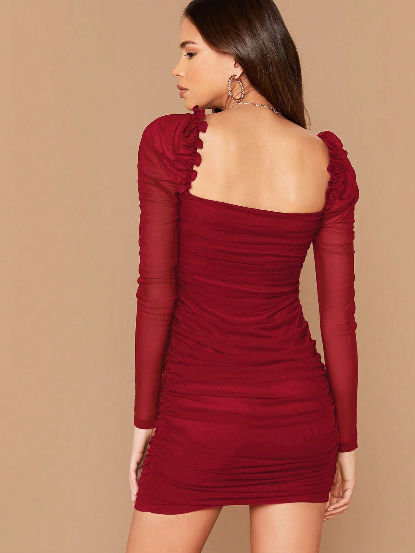 Radiant Ruched Mesh Overlay Dress with Frill Trim and Gigot Sleeves