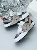 Sneakers, the perfect blend of style and versatility. These stylish women's shoes feature a unique patchwork design, making them a standout choice for any occasion. With their comfortable fit and eye-catching design, these sneakers are a must-have addition to any wardrobe."