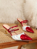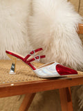 Red and White Colorblocked Pumps: High Heels with Heart-Shaped Rhinestone Buckle