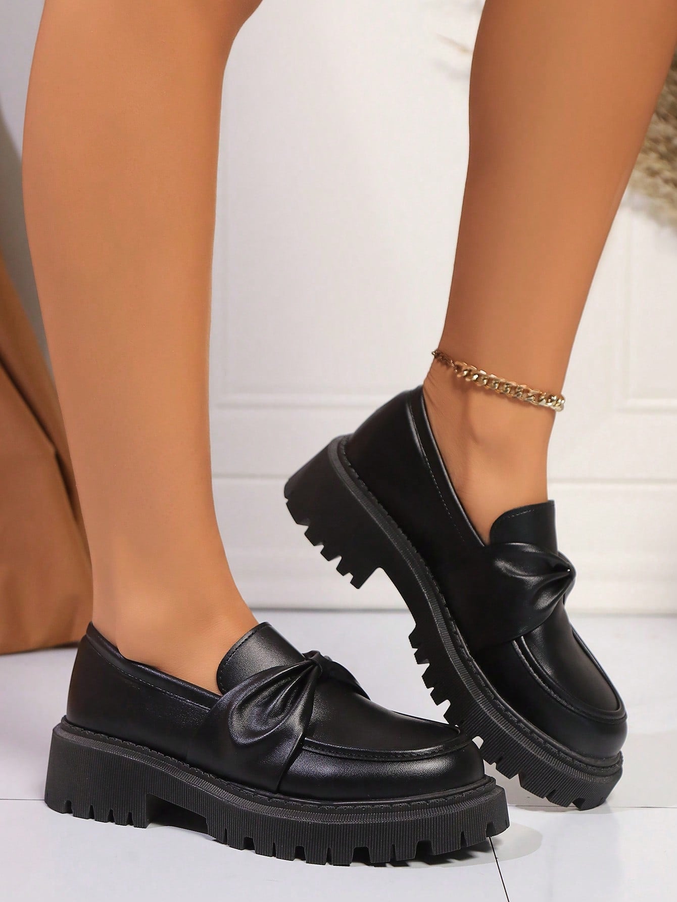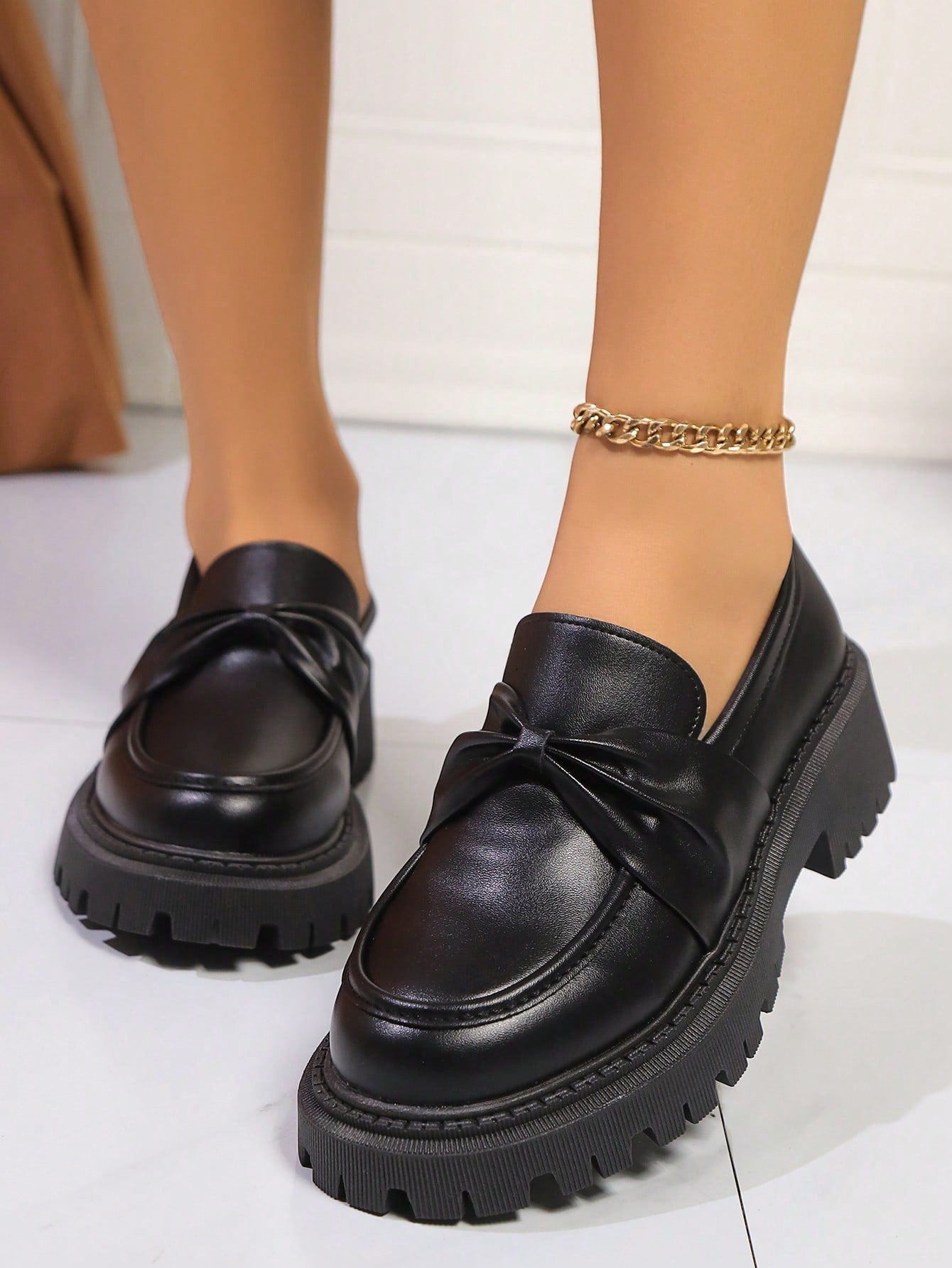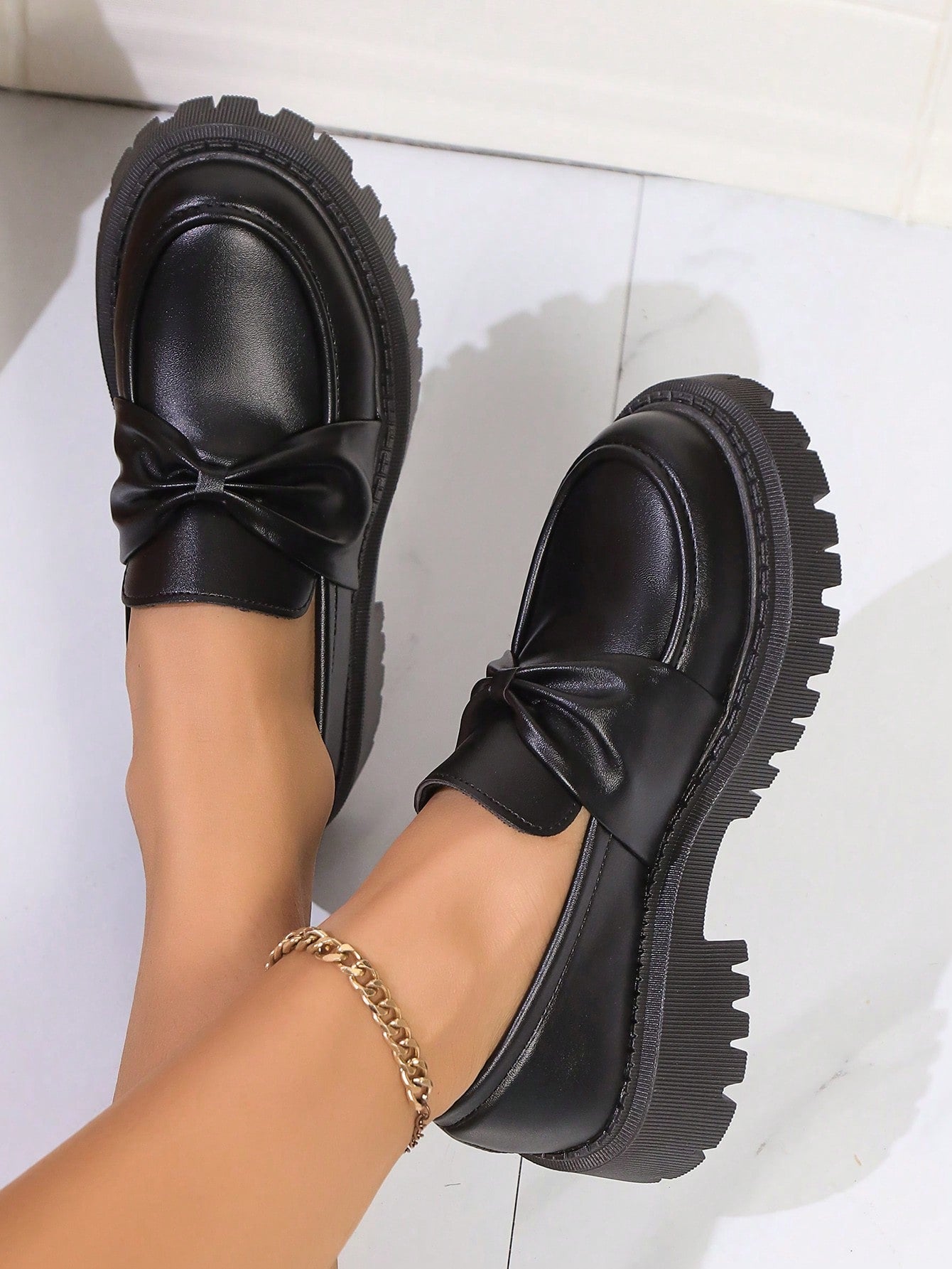 Retro Charm: Women's Chunky Heel Bow Tie Slip-On Loafers - Versatile Vintage Mary Janes