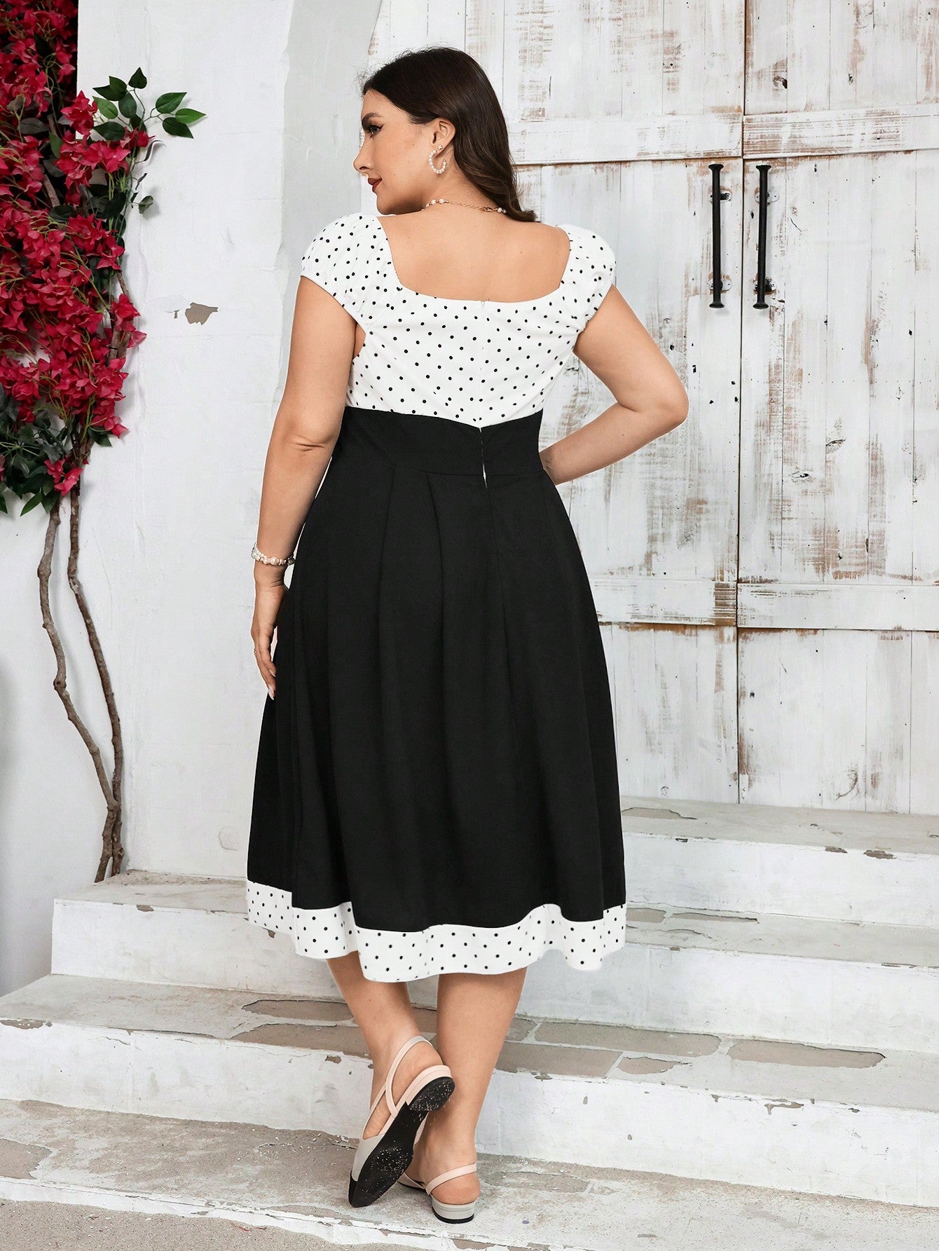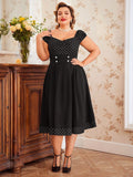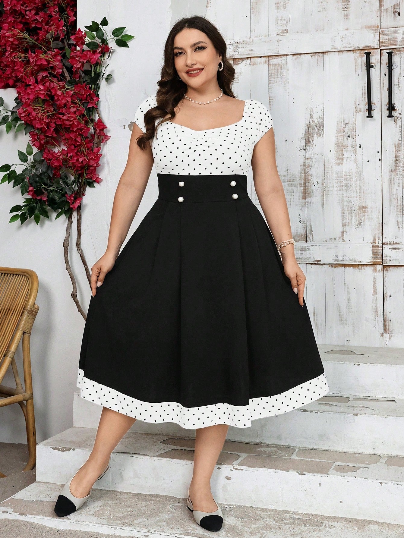 This Retro Chic polka dot dress features a vintage design with faux pearl accents and puff sleeves. It brings a touch of elegance and nostalgia to your wardrobe. Made with quality materials, its timeless style is sure to elevate your look. Perfect for any occasion, this dress will become a staple in your closet.