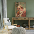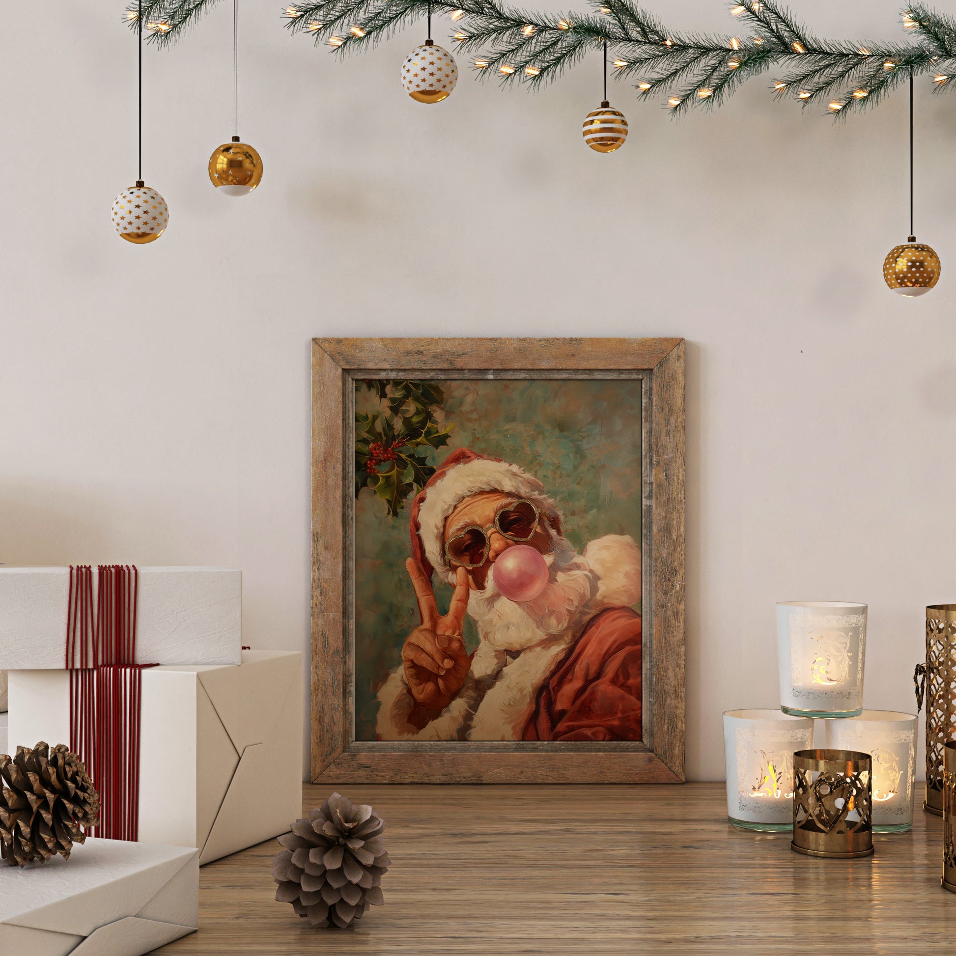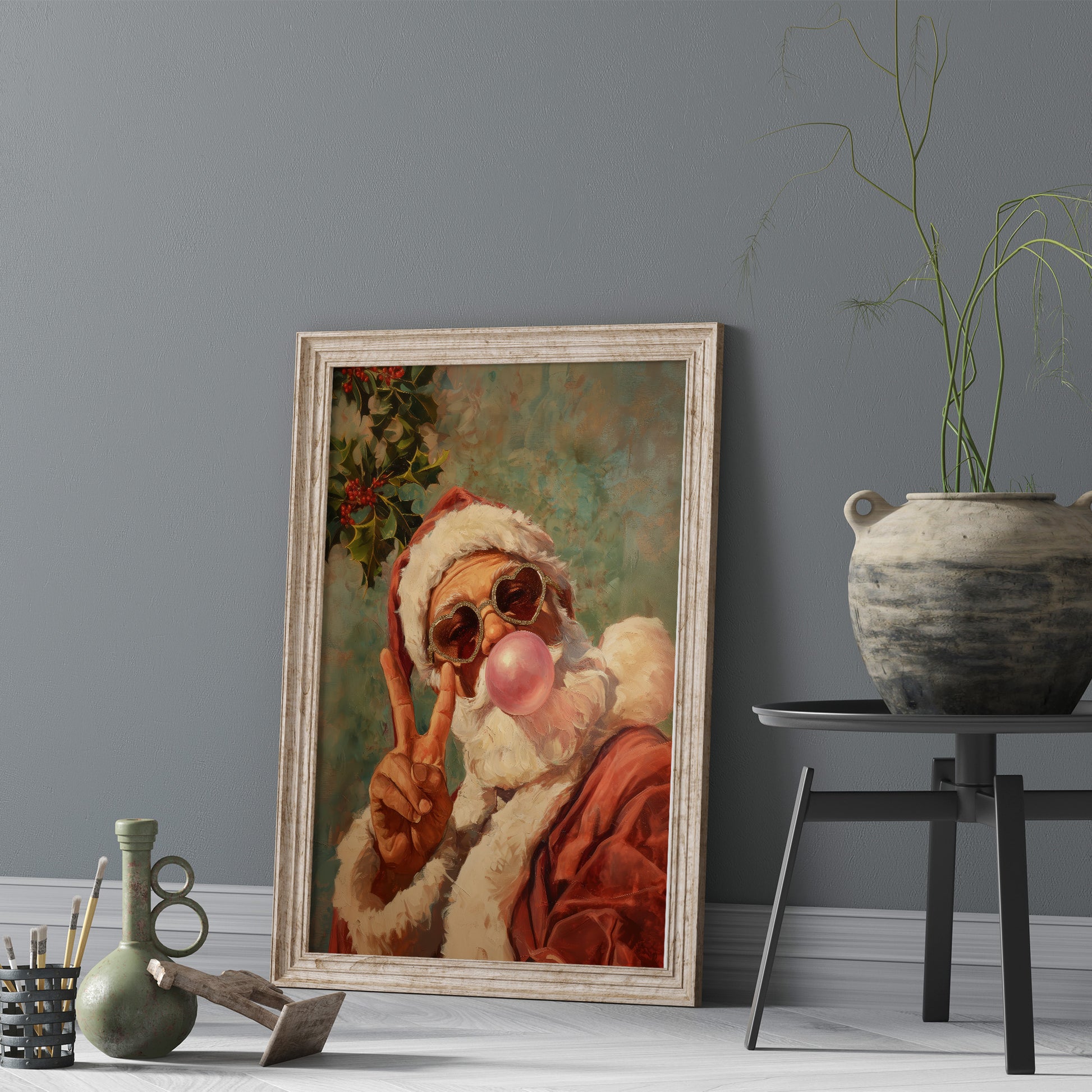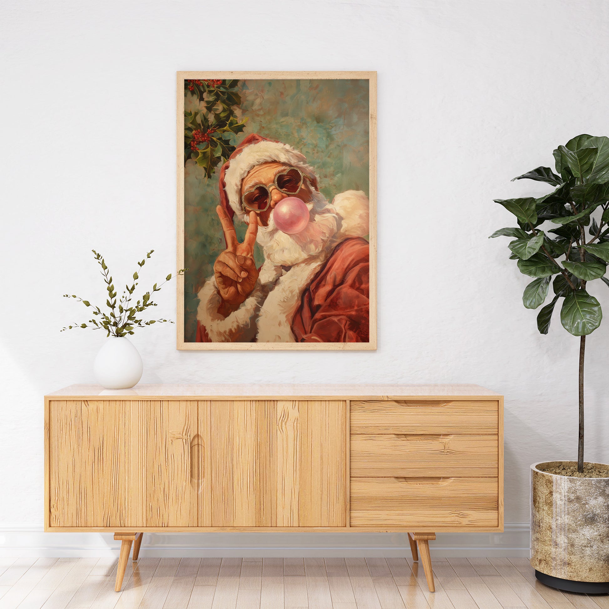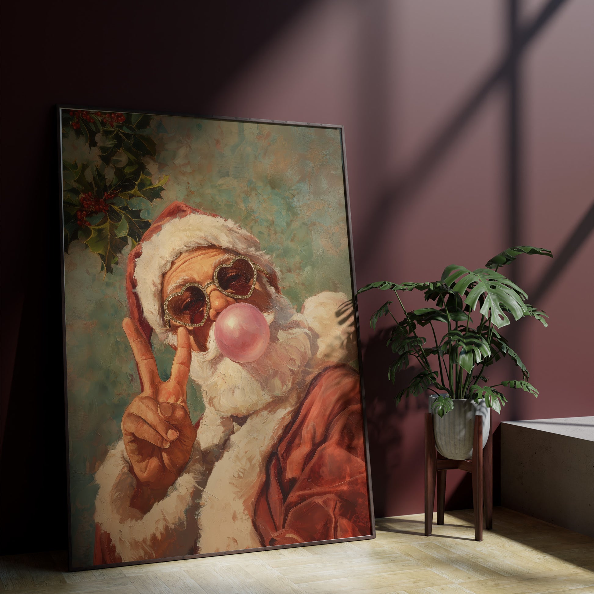 This vibrant retro-style Christmas artwork features a playful Santa Claus blowing a bubblegum bubble while wearing sparkling heart-shaped sunglasses and giving a peace sign. Painted in a warm, textured style, this fun and whimsical portrait brings a modern twist to classic holiday cheer. Perfect for festive home decor, Christmas gifts, seasonal wall art collections, or adding a humorous and stylish vibe to any room. Ideal for retro art lovers, holiday enthusiasts, and anyone seeking a standout Christmas print with personality.