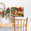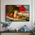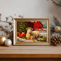 Rustic Christmas Sheep Art, Cozy Farmhouse Winter Scene with Red Barn & Tree, Holiday Gifts Illustration