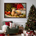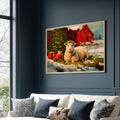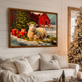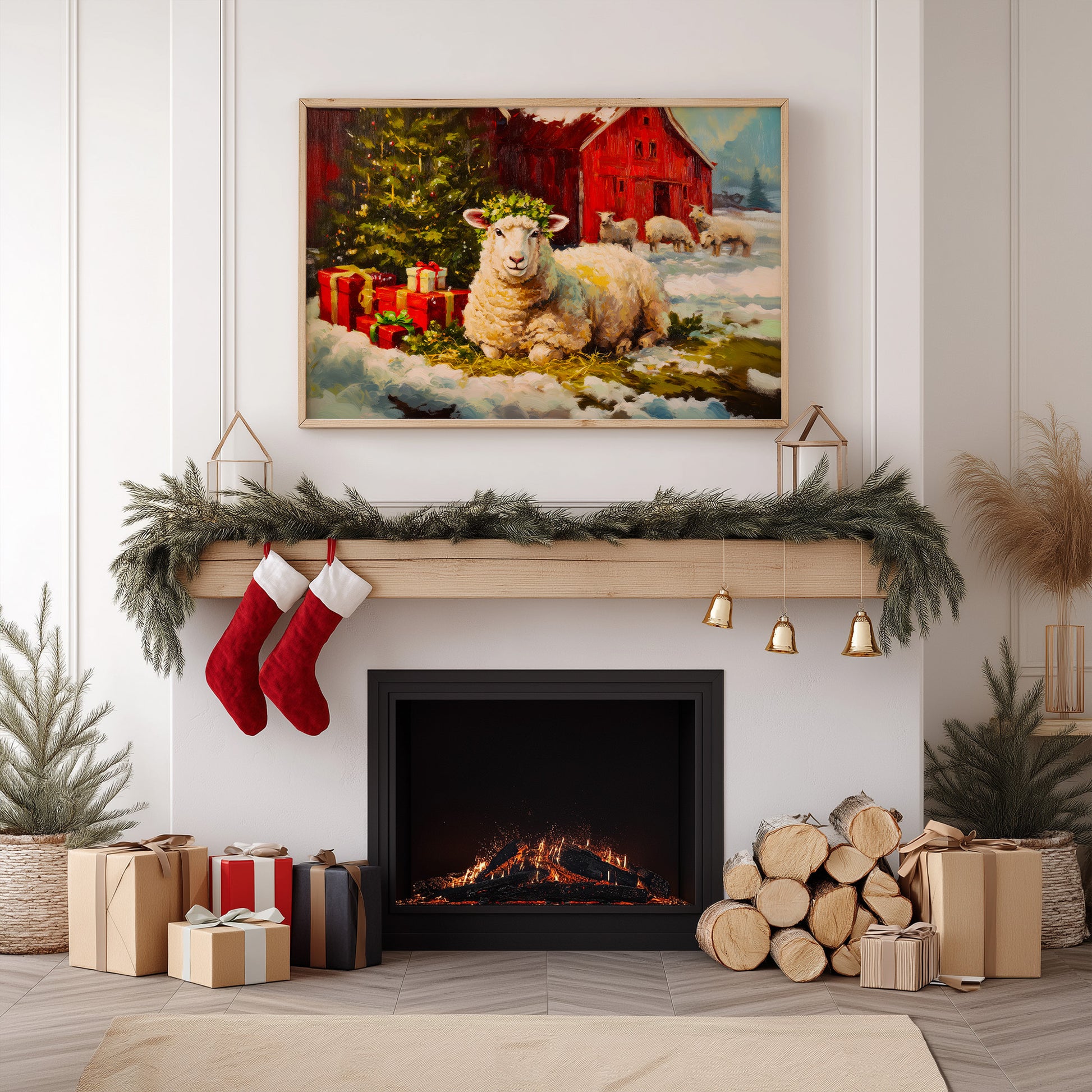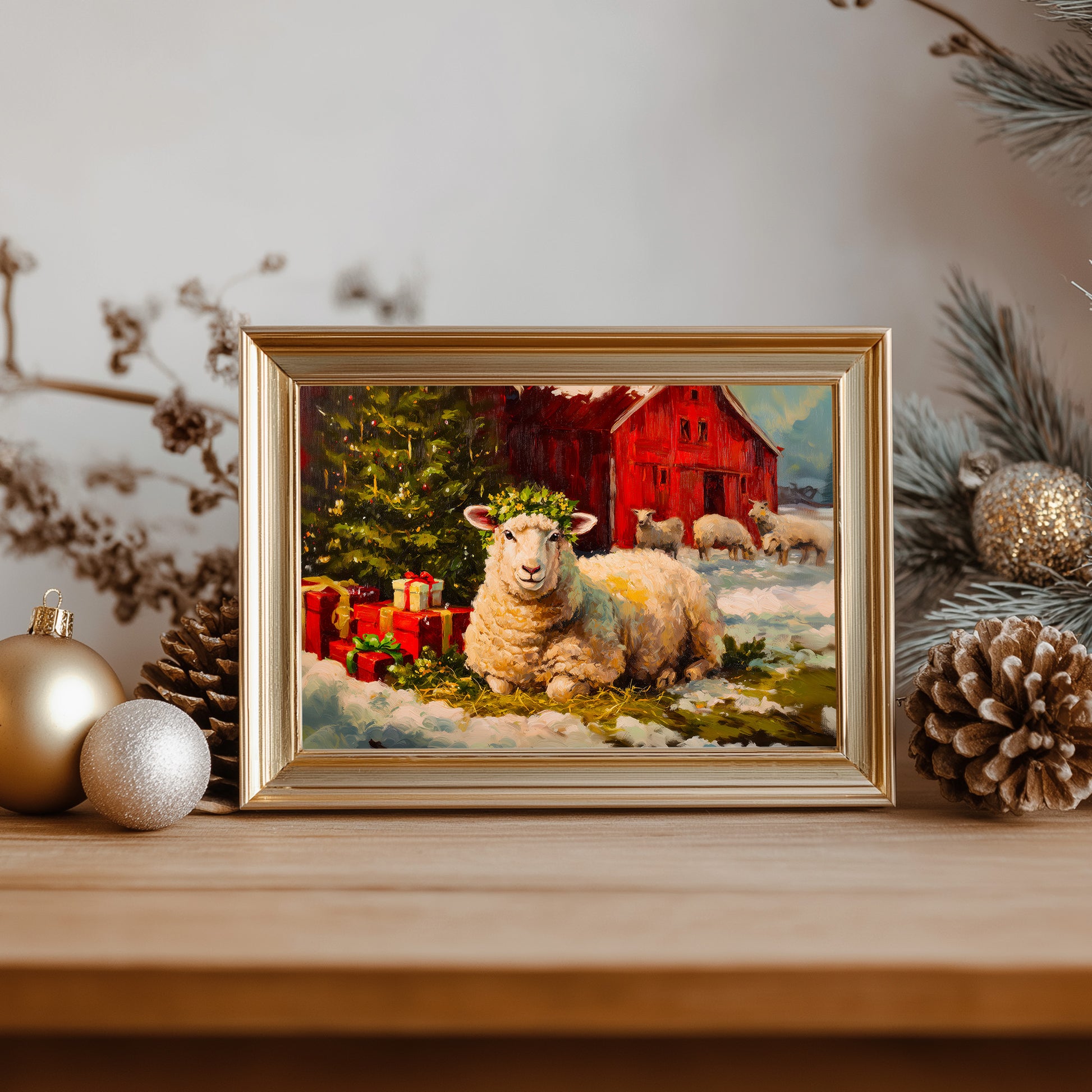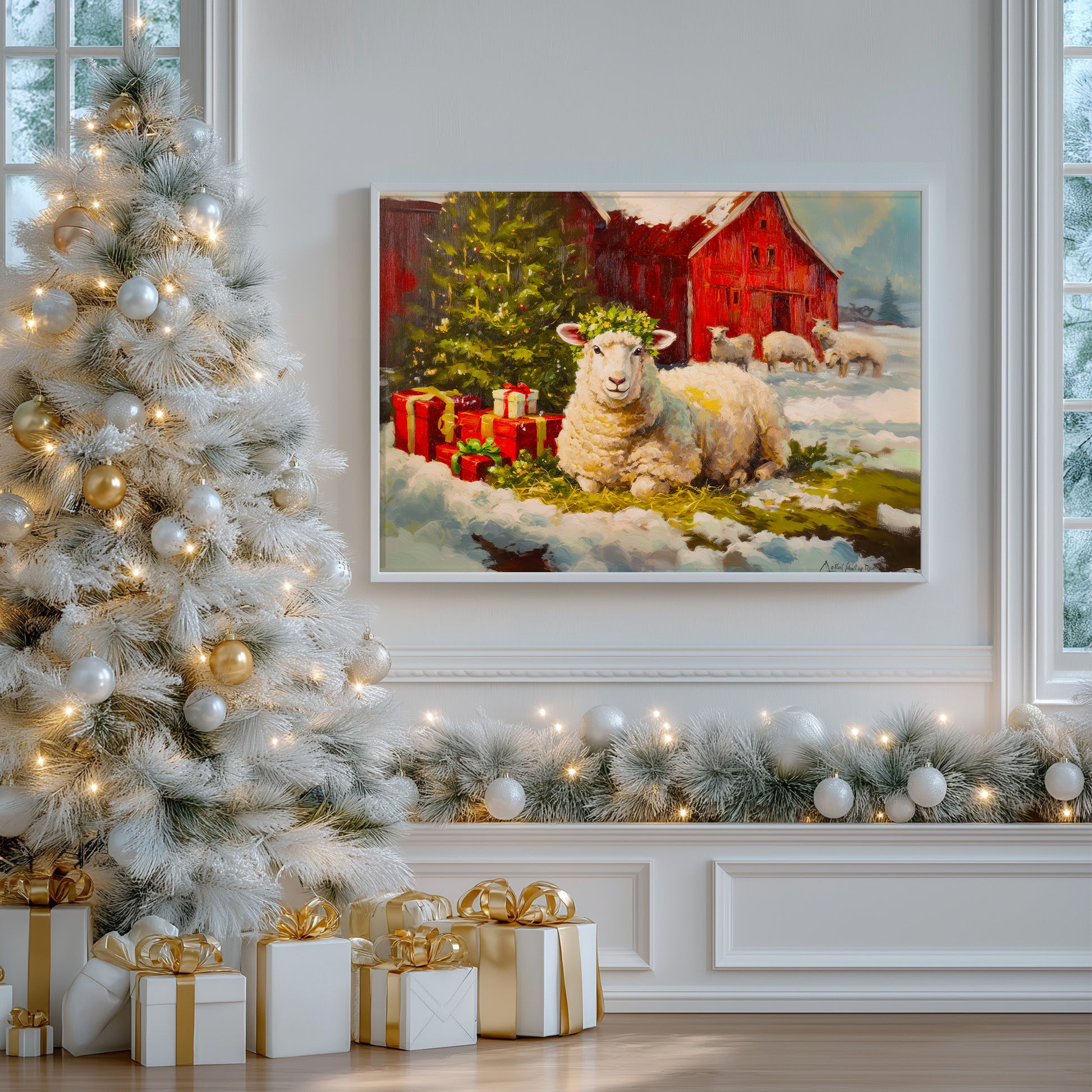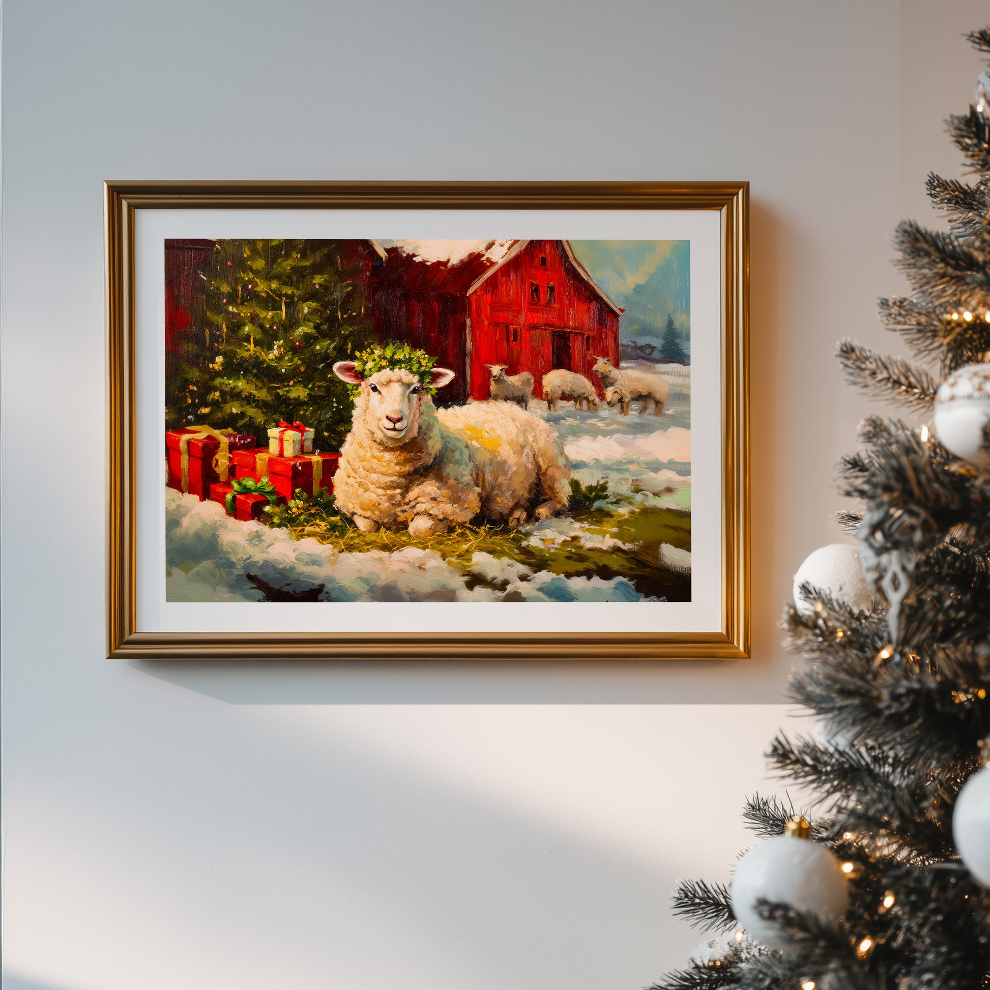 This charming Christmas farmhouse illustration features a fluffy sheep resting peacefully beside a decorated Christmas tree, surrounded by bright red holiday gifts. Behind the sheep stands a classic red barn dusted with snow, along with a few more sheep wandering in the background, creating a warm and rustic countryside atmosphere. The rich painterly textures, glowing highlights, and snowy landscape capture the magic of a cozy winter celebration. Perfect for farmhouse décor lovers, holiday gallery walls, entryways, kitchens, or seasonal home displays. High-resolution printable artwork ready for instant download and easy printing at home or through your preferred print service.
