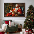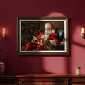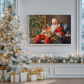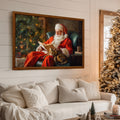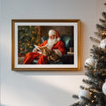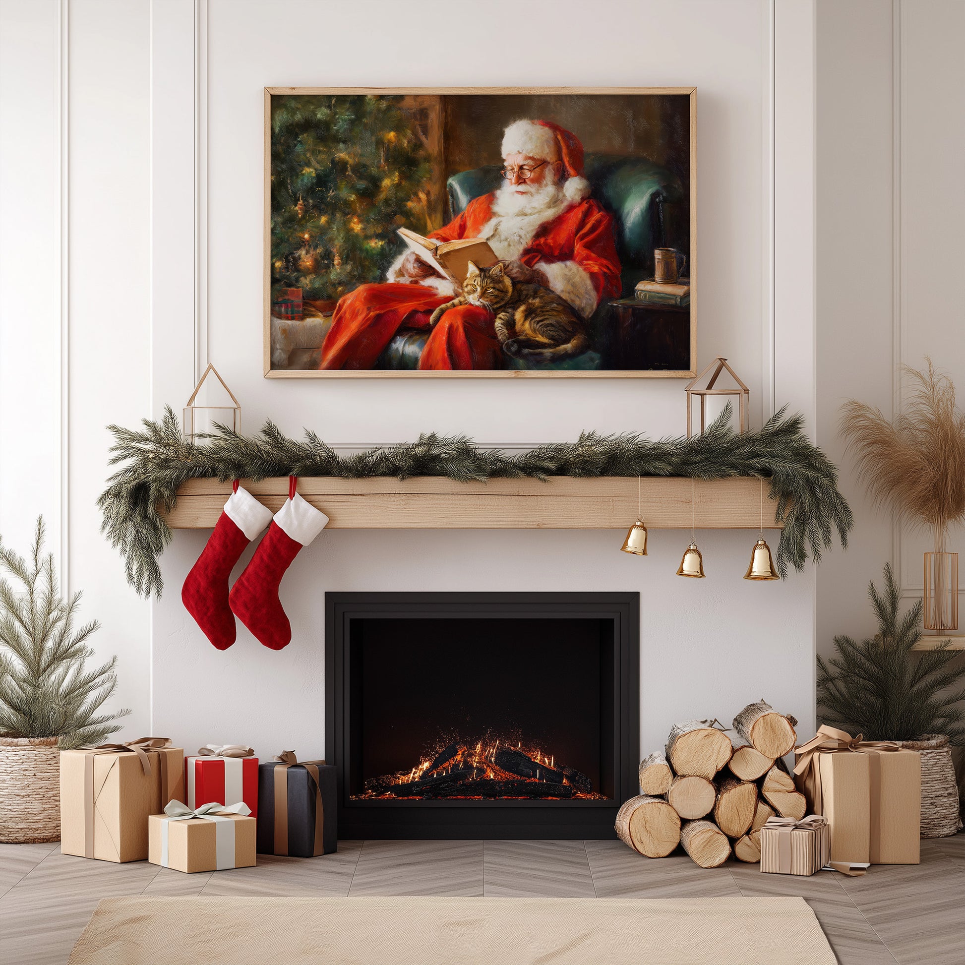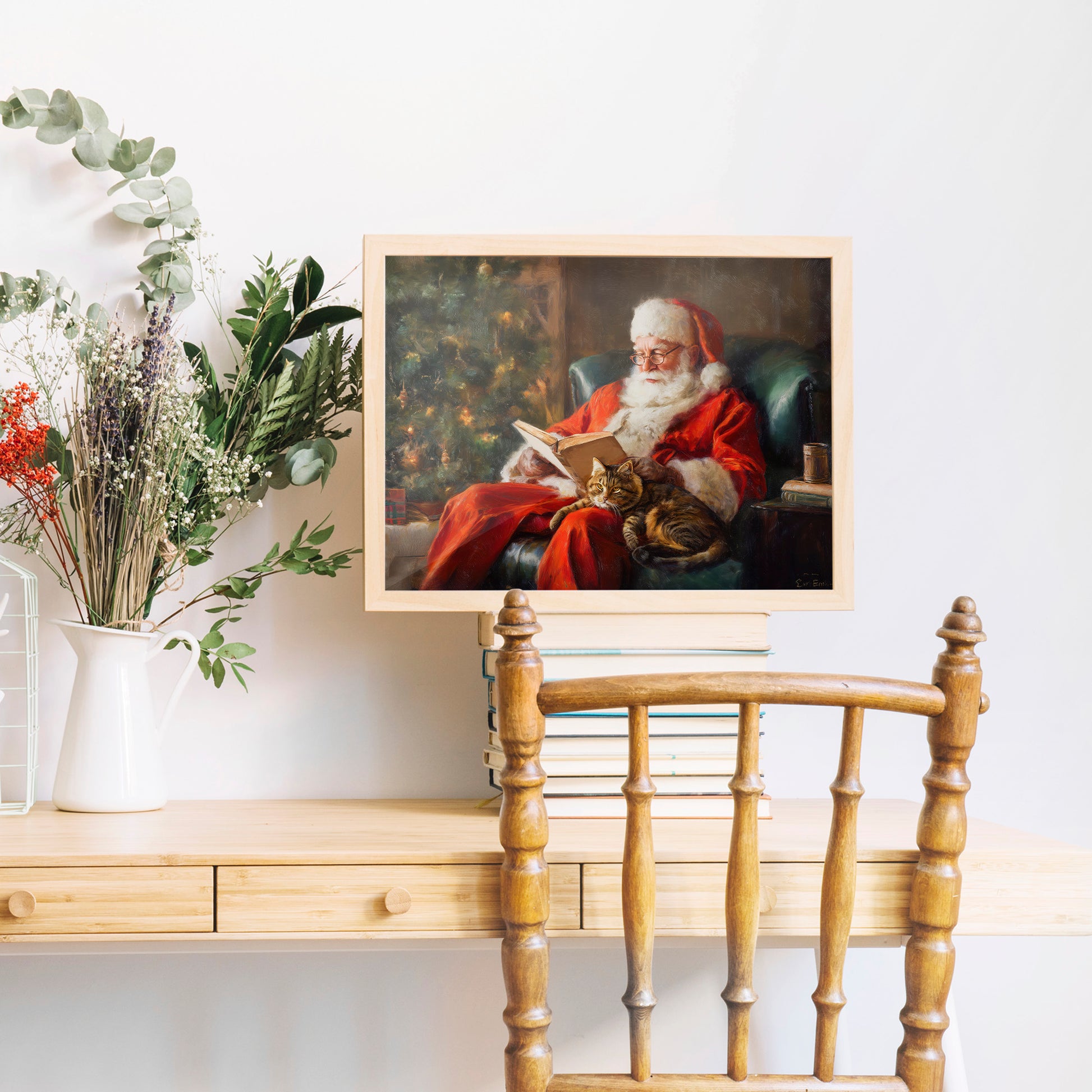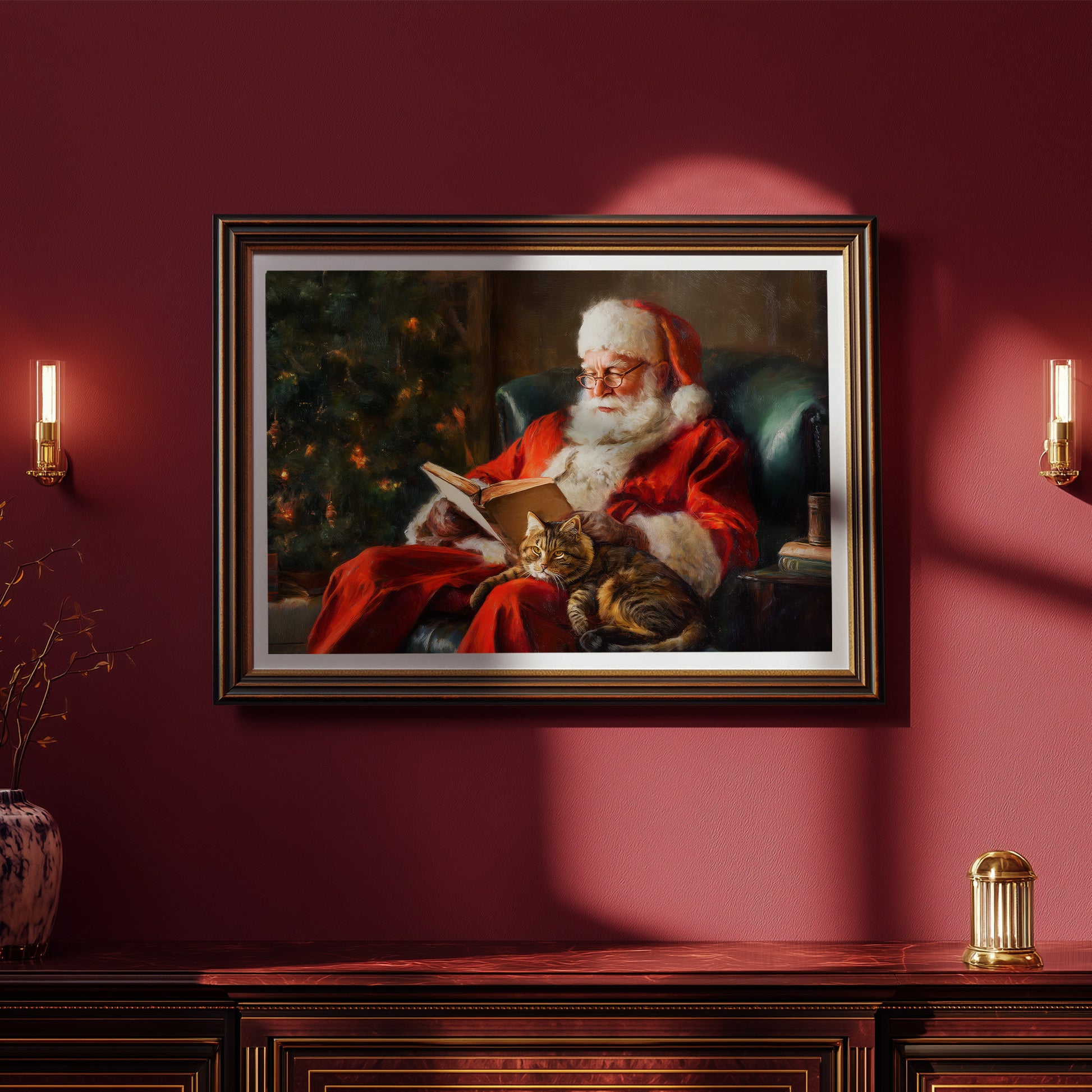 This warm and nostalgic Christmas illustration features Santa Claus relaxing in a cozy armchair beside a glowing Christmas tree, reading a book with a calm tabby cat resting on his lap. Soft golden lighting, rich painterly textures, and the peaceful holiday atmosphere make this artwork perfect for living rooms, reading nooks, libraries, pet-friendly homes, and seasonal wall decor. Ideal as a Christmas gift for cat lovers, book lovers, or anyone who enjoys vintage holiday art. High-resolution digital download ready to print at home or through any professional printing service for best results.