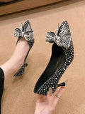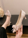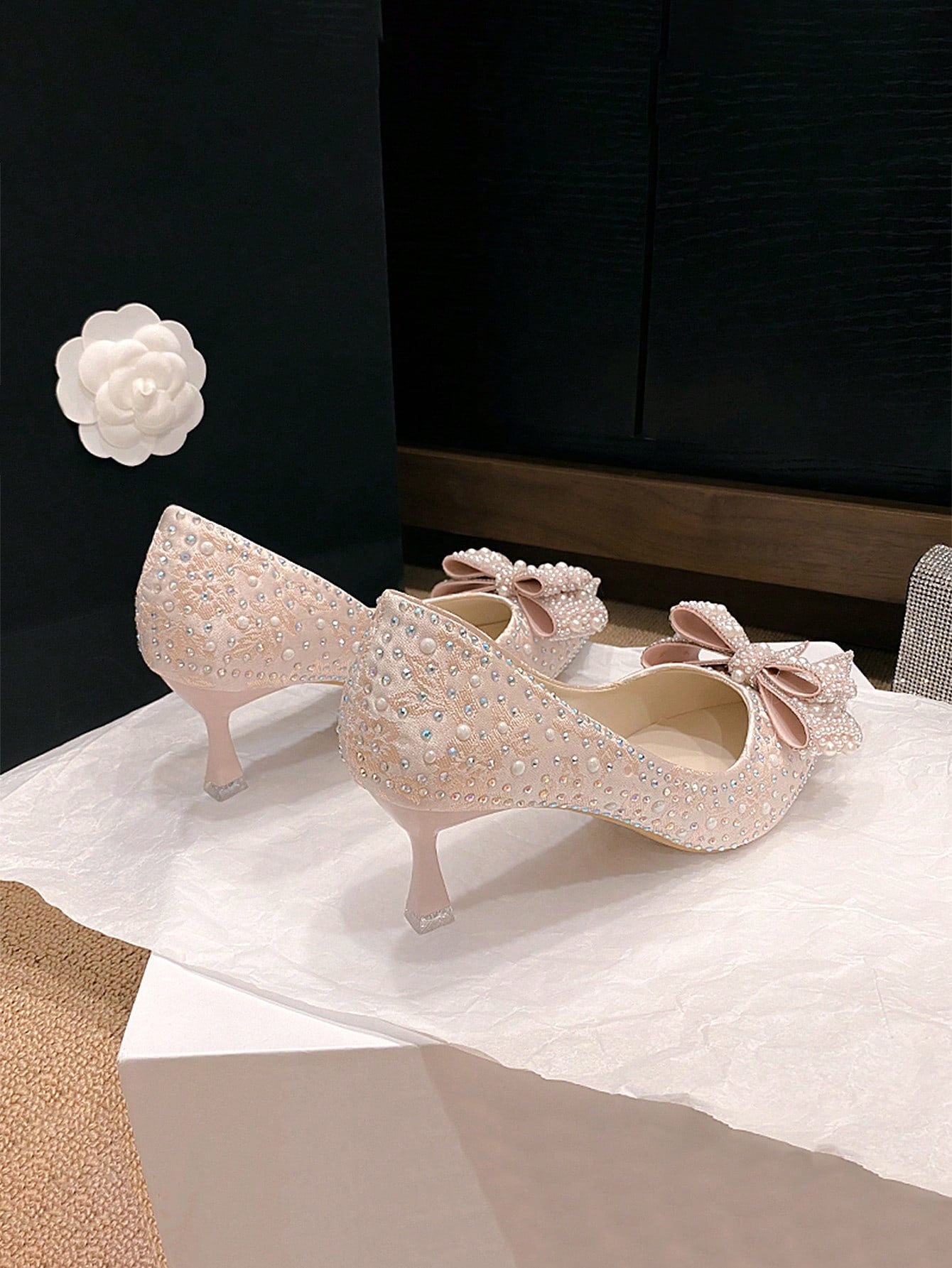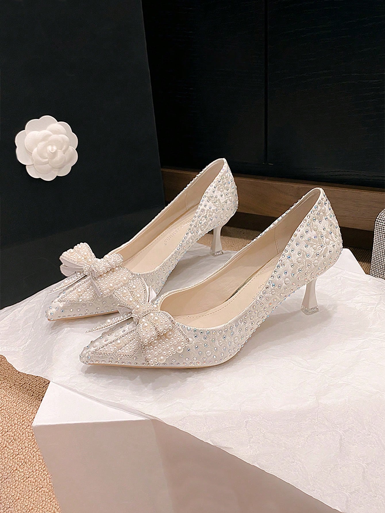 Elevate your style with Shimmer & Shine: Holographic Pearl Bow Pointed-Toe Mini High Heels. The holographic pearls and pointed-toe design add a touch of glamour to your look. With a mini heel, these heels are both fashionable and comfortable. Perfect for special occasions or adding some shimmer to your everyday look.