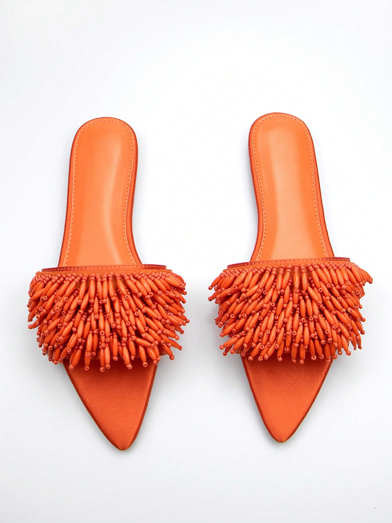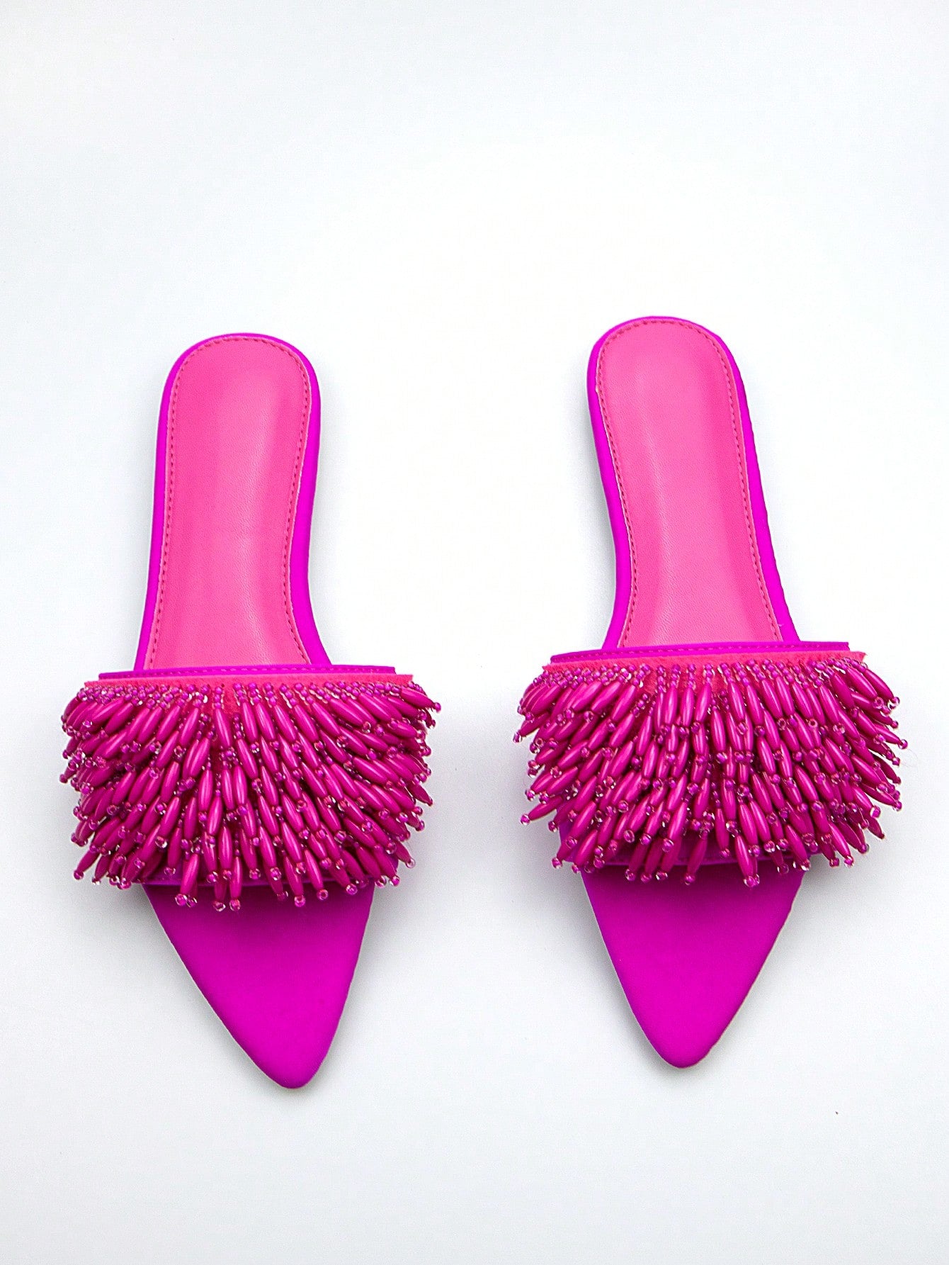 Step into luxury with Shimmery Elegance: Beaded Satin Slippers for Women. These stunning shoes are perfect for glamorous parties and special occasions, providing both style and comfort. The intricate beadwork and satin material add an elegant touch to any outfit. Elevate your look with these must-have slippers.