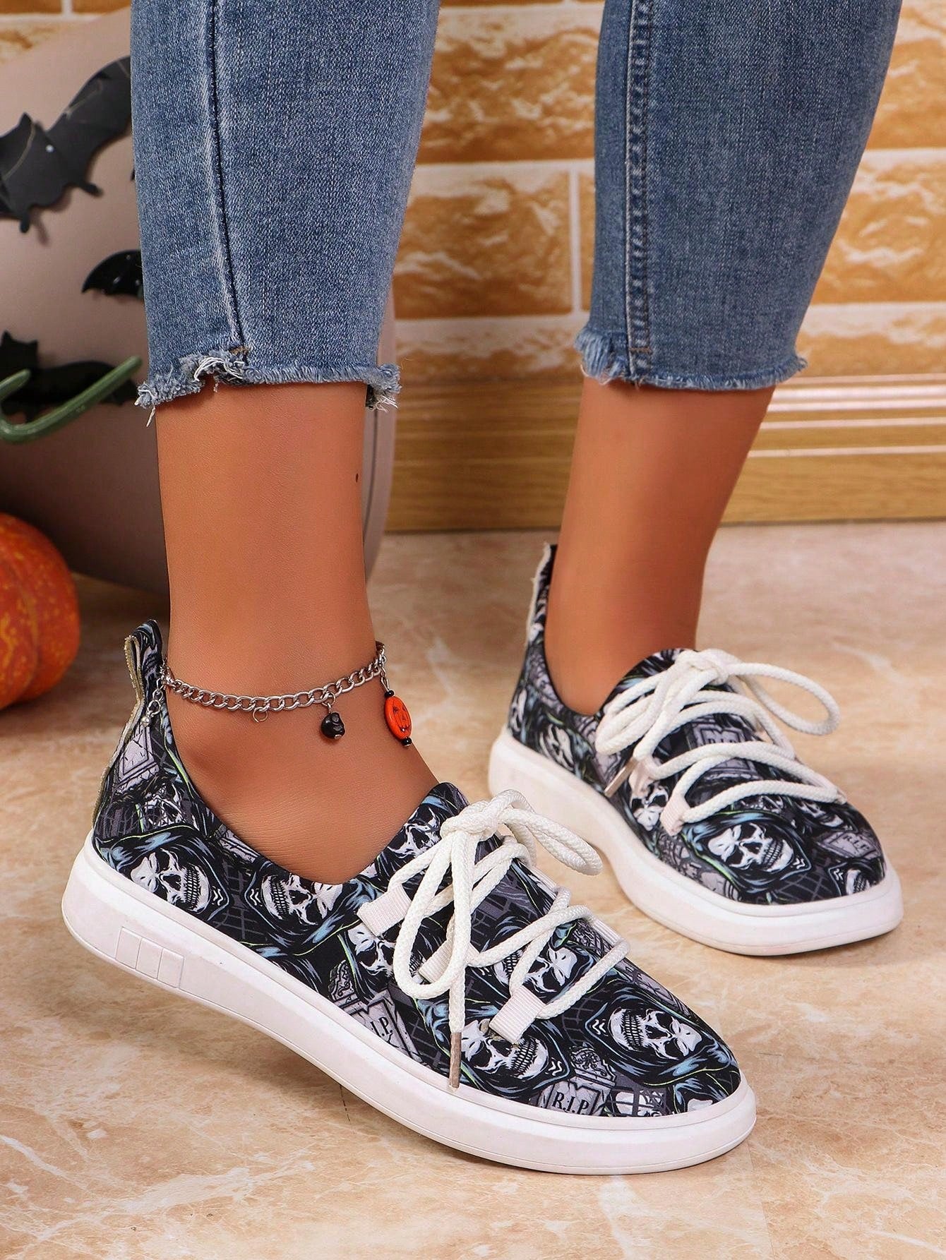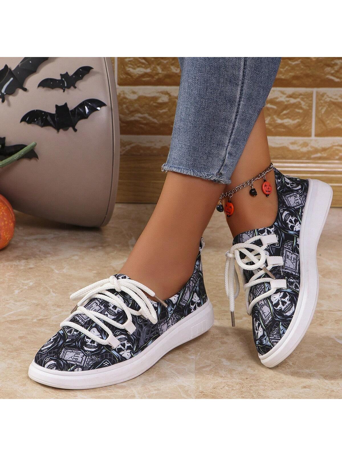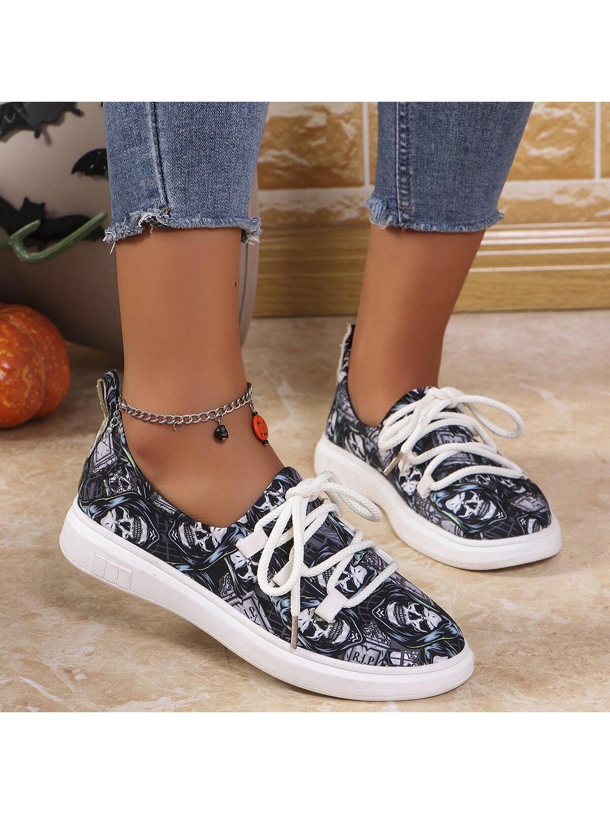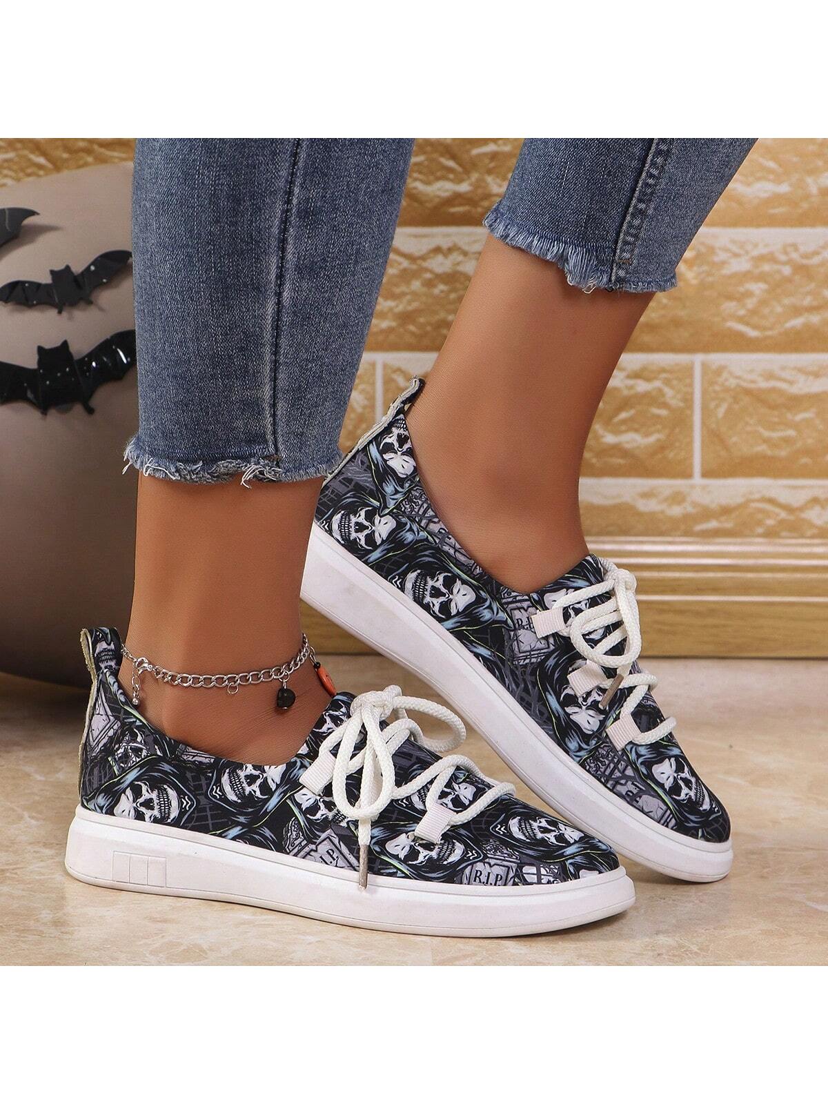 Skull Print Lace-Up Sneakers: Spooky Style for Halloween 2024