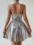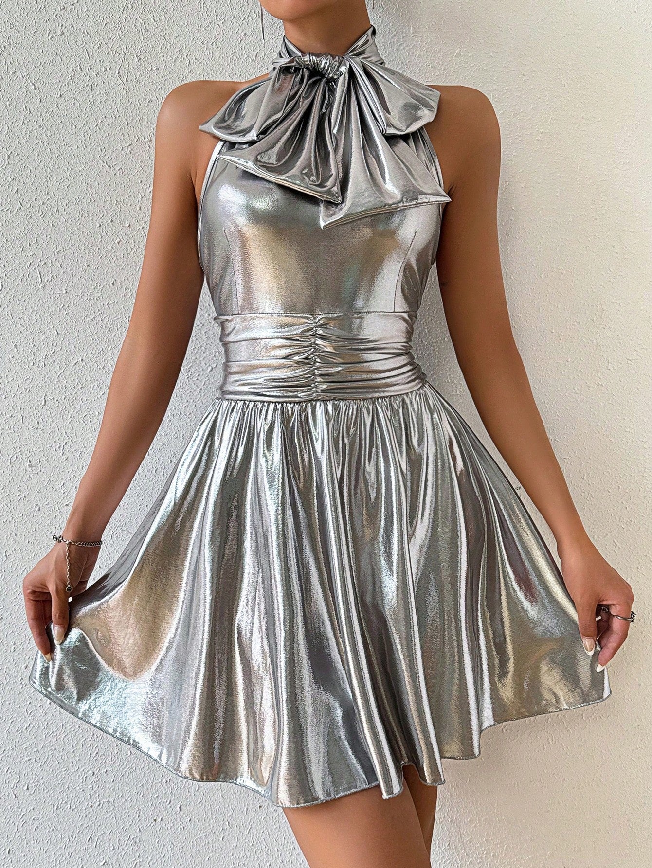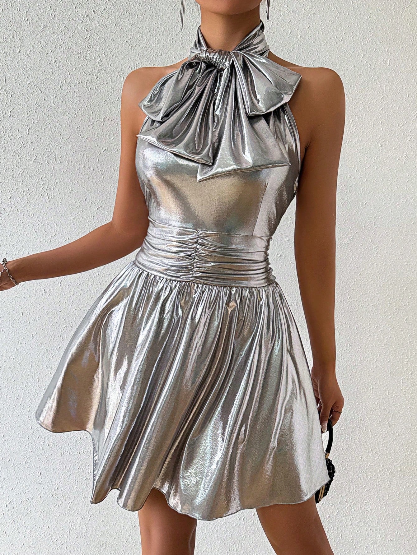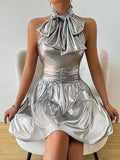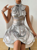 Sleek Silver Bowknot Belted Mini Dress: A Chic Addition to Your Wardrobe