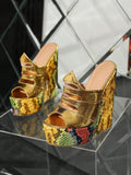 Step up your fashion game with our Snake Print Color Block Platform Sandal. Elevate your style with the super high heel, adding height and confidence to any look. The unique snake print and color block design make a statement, while the platform adds stability and comfort. Whether dressing up or down, these sandals will take your outfit to the next level.