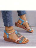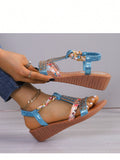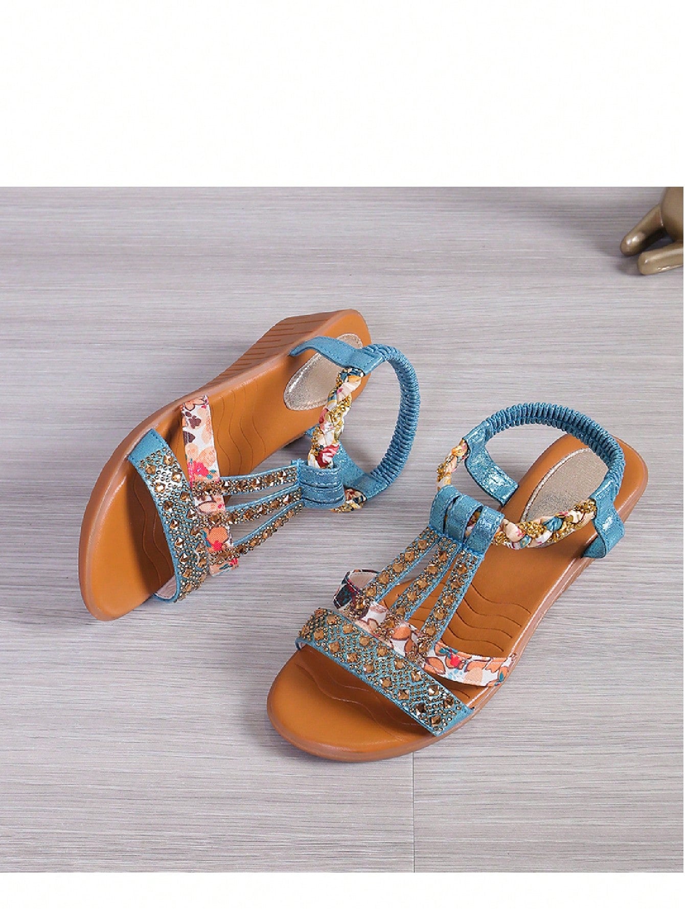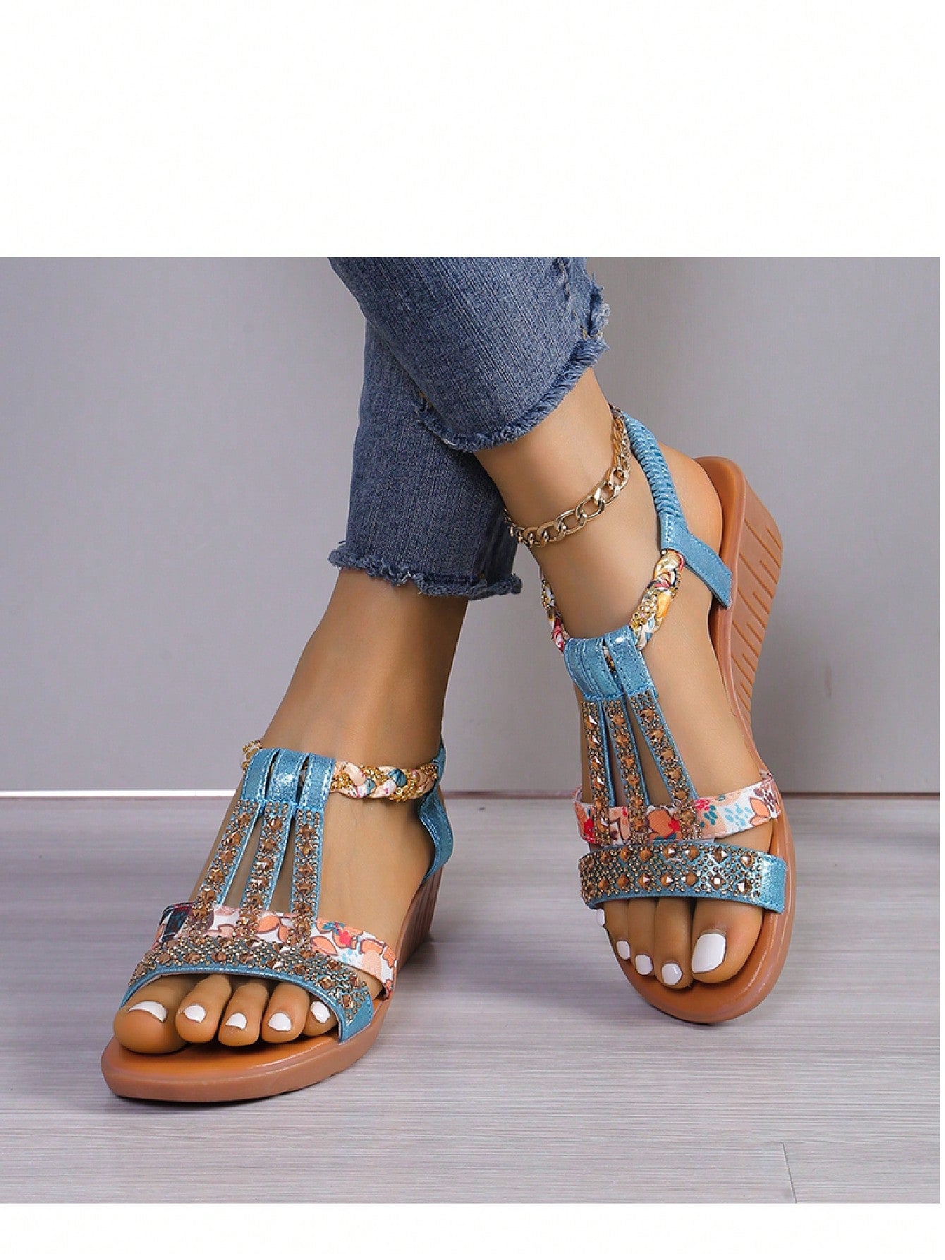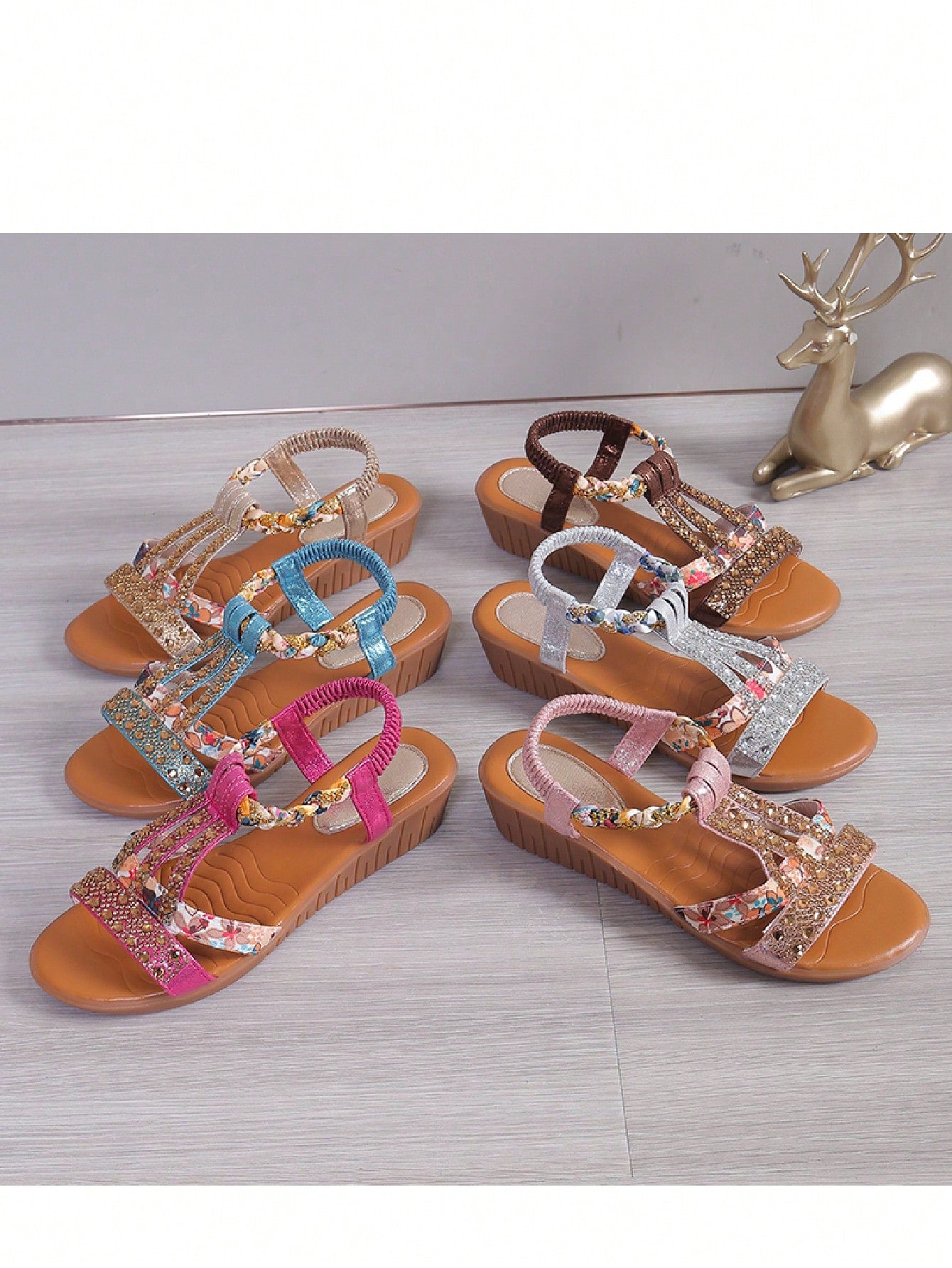 Sparkling Comfort: Women's Bohemian Rhinestone Wedge Sandals with Woven Elastic Band
