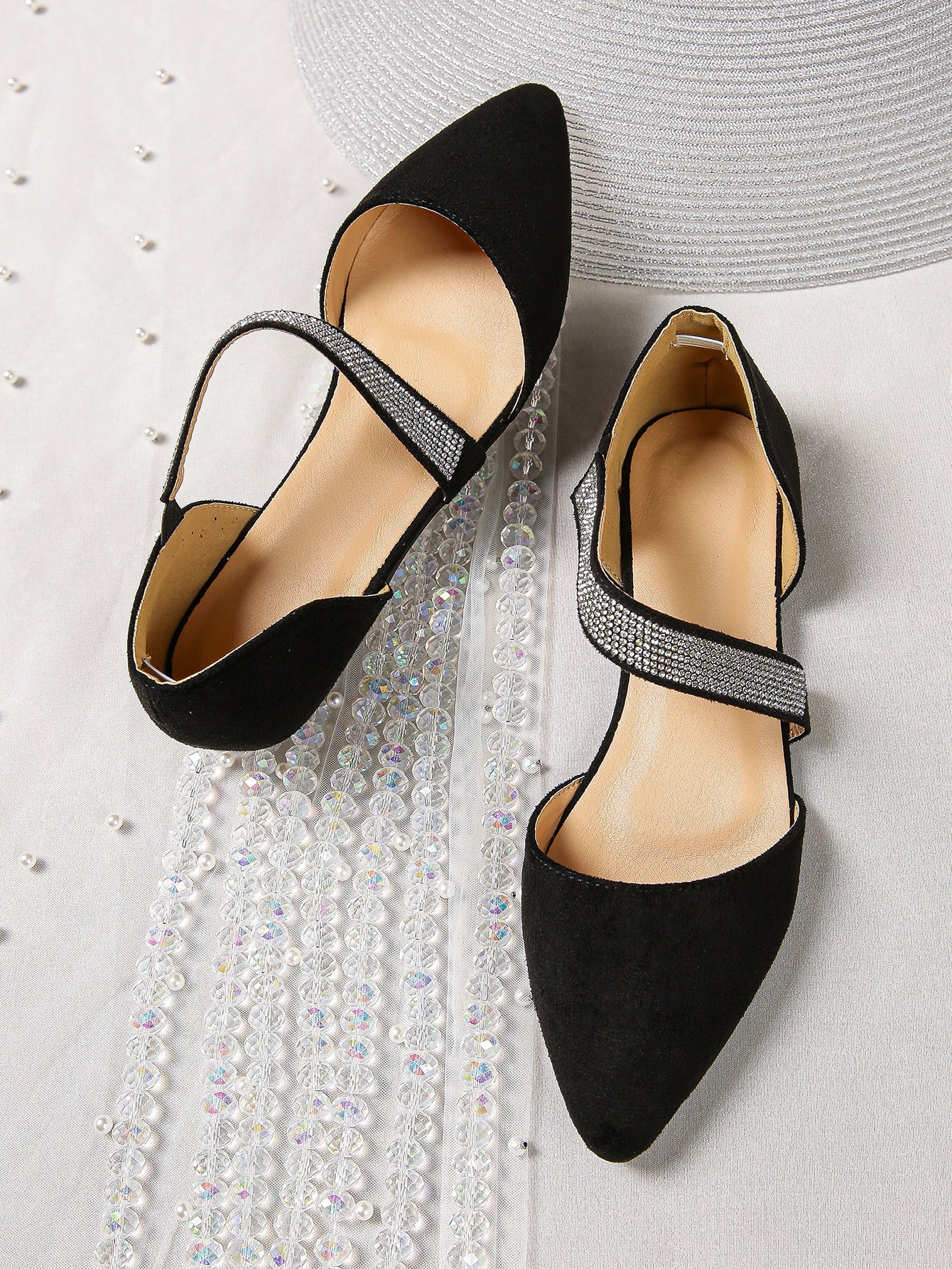 Elevate your style with our Sparkling Rhinestone Strappy Flats. Made with black suedette for a touch of elegance, the contrast color adds a fashionable twist to these shoes. With sparkling rhinestones for some subtle glam, these flats are perfect for any occasion.