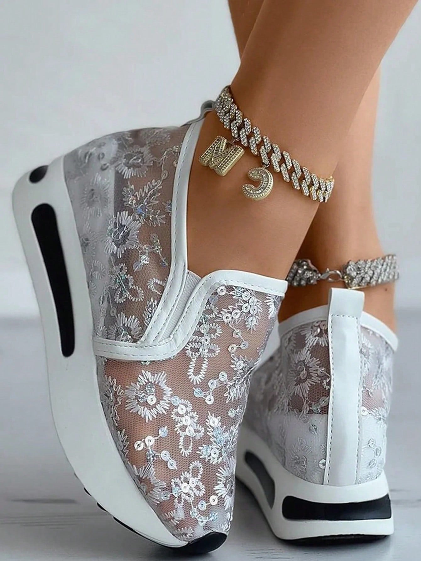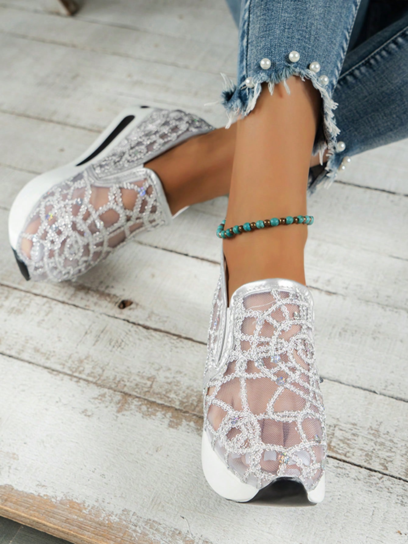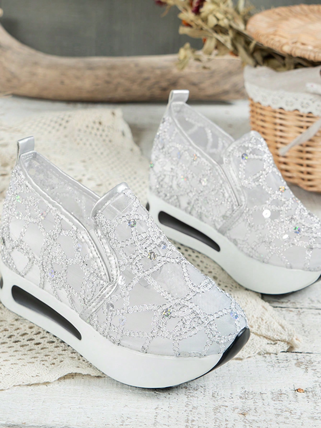 sneakers. The perfect combination of comfort and fashion, these sneakers will add a touch of glam to any outfit. With their slip-on design and wedge heel, they are both practical and stylish. Experience the perfect blend of sport and sparkle with our sneakers."