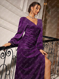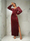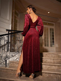 Introducing the Sparkling Surplice: Glitter Dress. This stunning dress features a surplice design with sparkling glitter details and elegant bishop sleeves. The split thigh adds a touch of sophistication and style. Perfect for any special occasion or a night out.