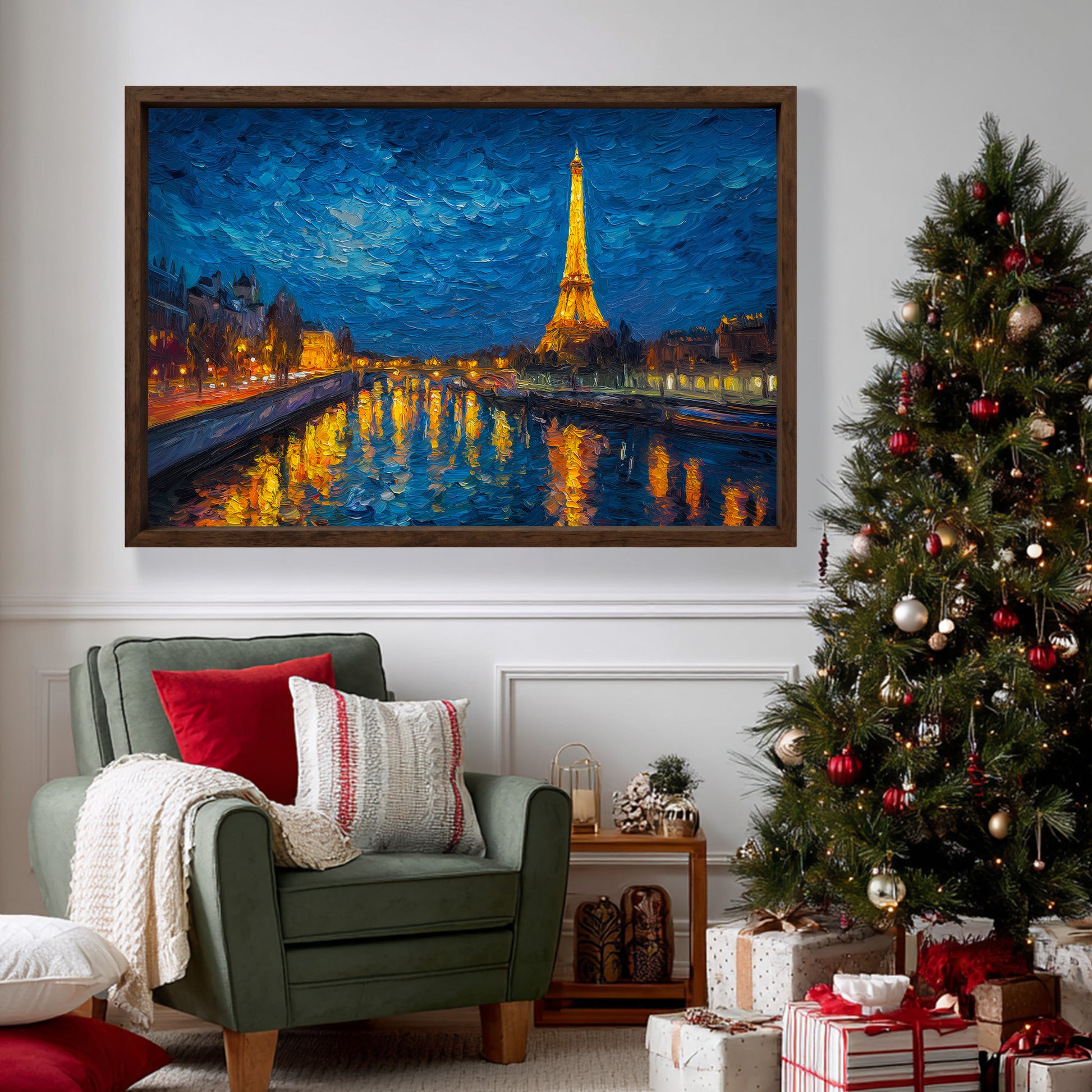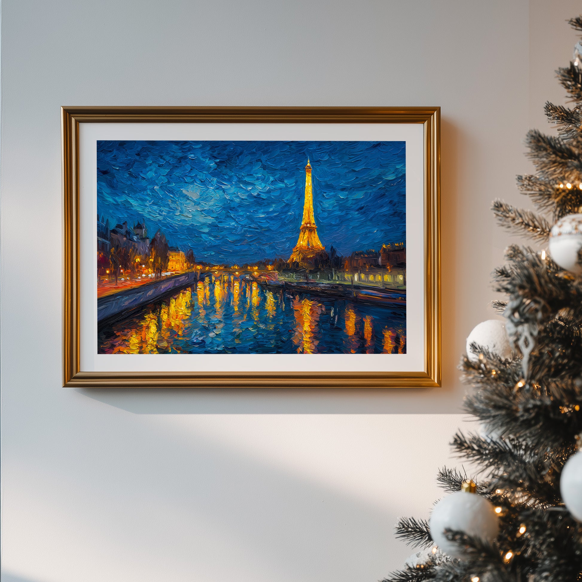 A mesmerizing and romantic impasto oil painting of the Eiffel Tower at night, standing tall against a swirling, deep blue starry sky. The golden lights of the tower and the Parisian city streets reflect beautifully on the tranquil surface of the Seine River. With thick, expressive brushstrokes and a rich color palette of navy blue, gold, and warm amber, this artwork captures the magical essence of the "City of Light." This evocative piece is perfect for creating a cozy and sophisticated atmosphere in a master bedroom, a luxury living room, or a private study.
