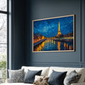 Starry Night Paris Eiffel Tower Oil Painting Glowing City Lights Reflecting On Seine River