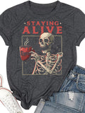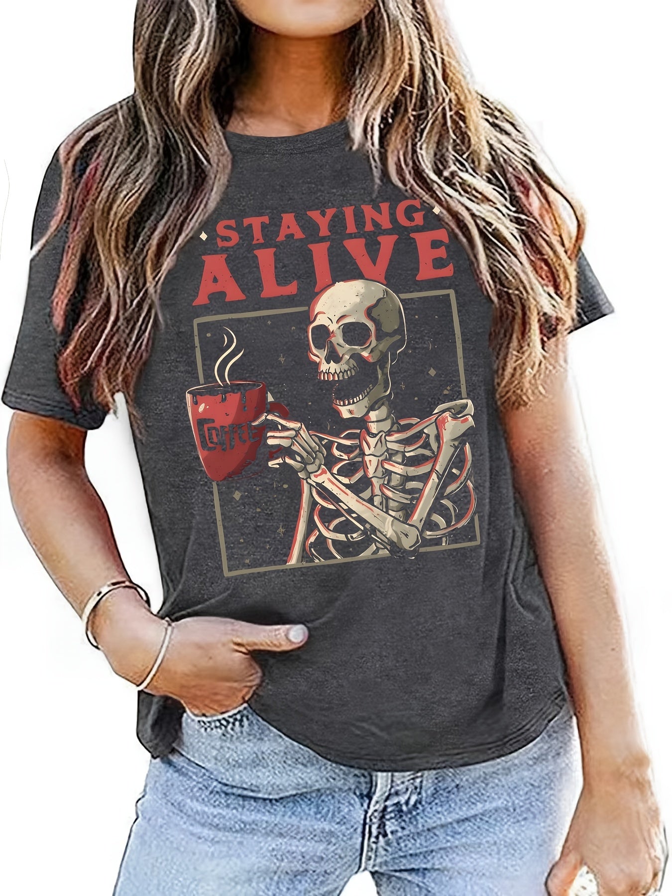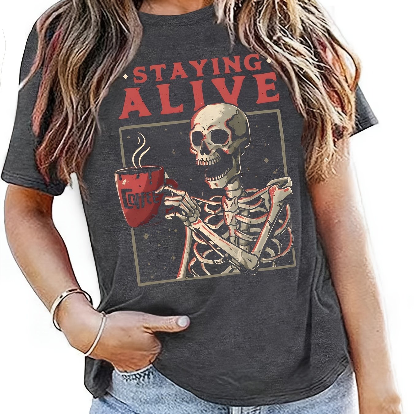 Stylish and Trendy: Skeleton Letter Print Crew Neck T-Shirt for the Fashion-Forward Women