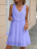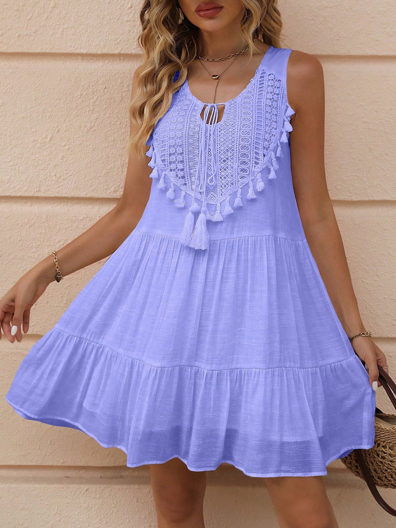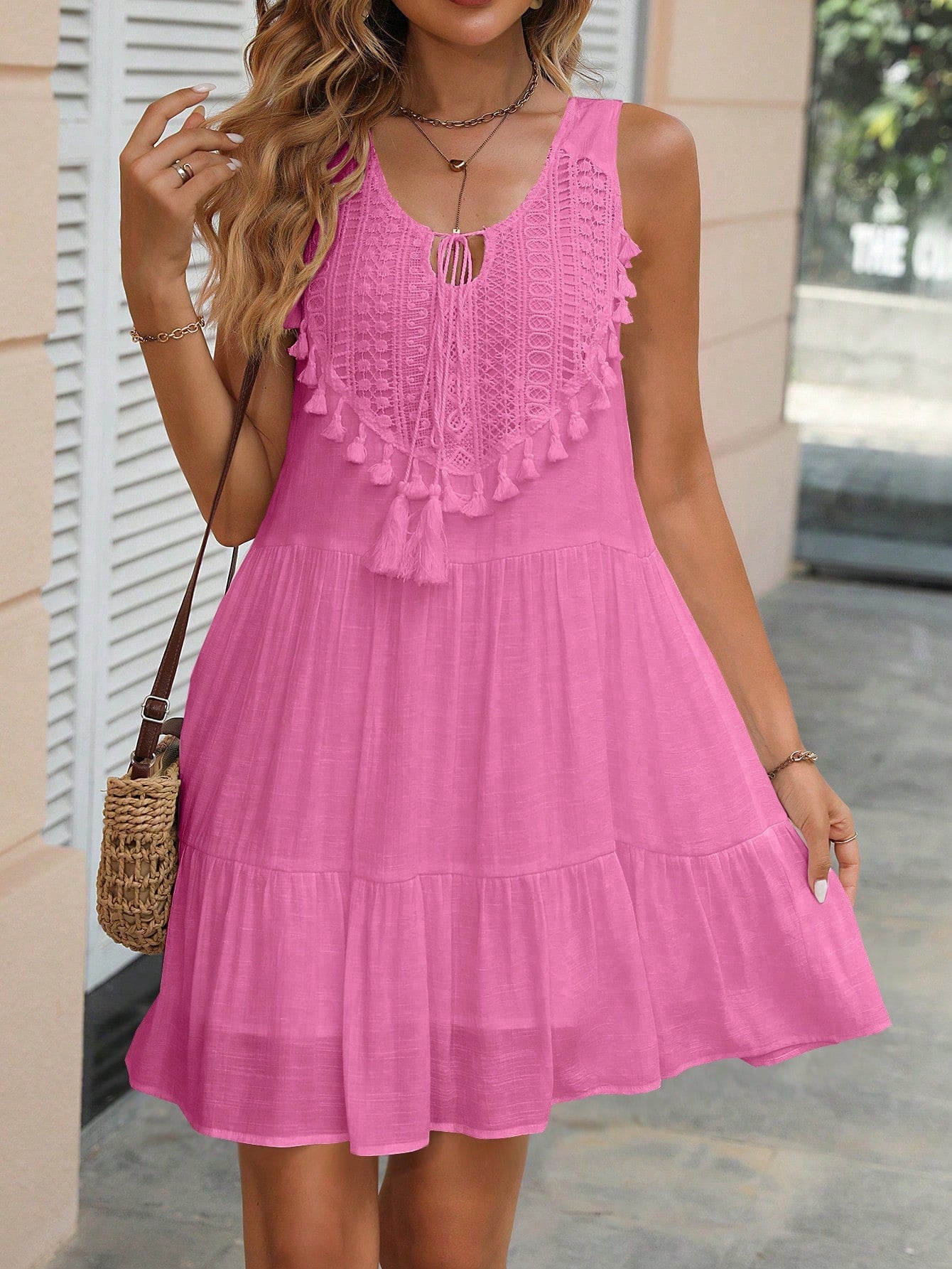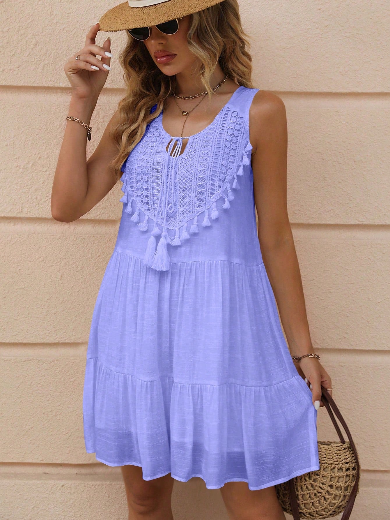 Sun-Kissed Elegance: Lace Splicing Tassel Detail Ruffle Hem Midi Dress for Summer