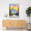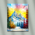 Vibrant Impasto Oil Painting Of Snow-Capped Mountains Surrounded By Colorful Forest Foliage Under A Golden Yellow Sky