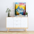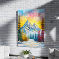 A visually striking and highly textured impasto oil painting depicting a majestic mountain landscape. The snow-capped peaks are rendered with thick, expressive palette knife strokes in blues and whites. The scene is framed by a foreground of colorful trees and bushes in vivid shades of green, yellow-gold, blue, and deep red. A wide, bright golden yellow and pink sky dominates the background, giving the entire artwork a dramatic, maximalist, and fantastical glow. This piece is perfect for those seeking bold, colorful nature art, or statement pieces with high texture and vibrant contrast.