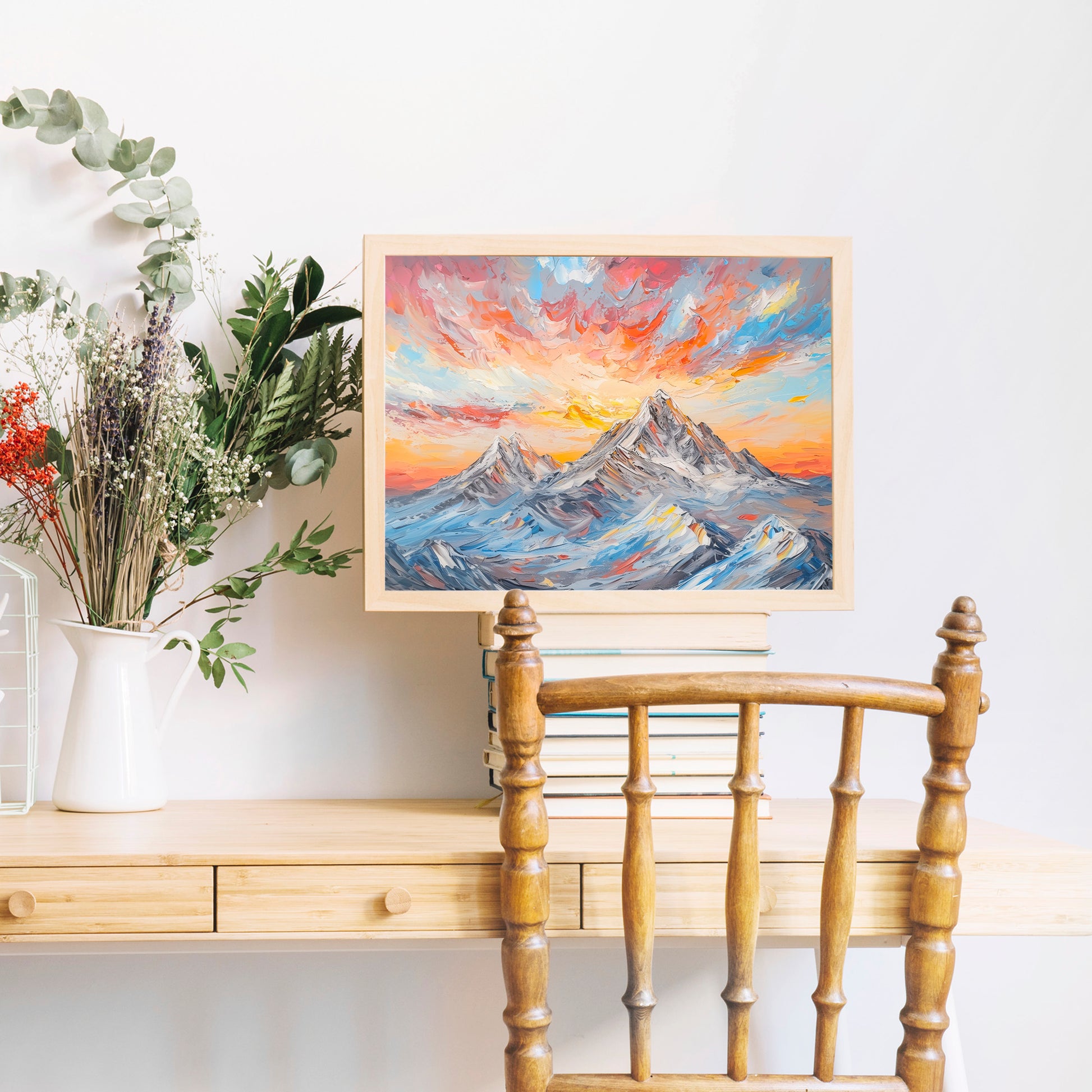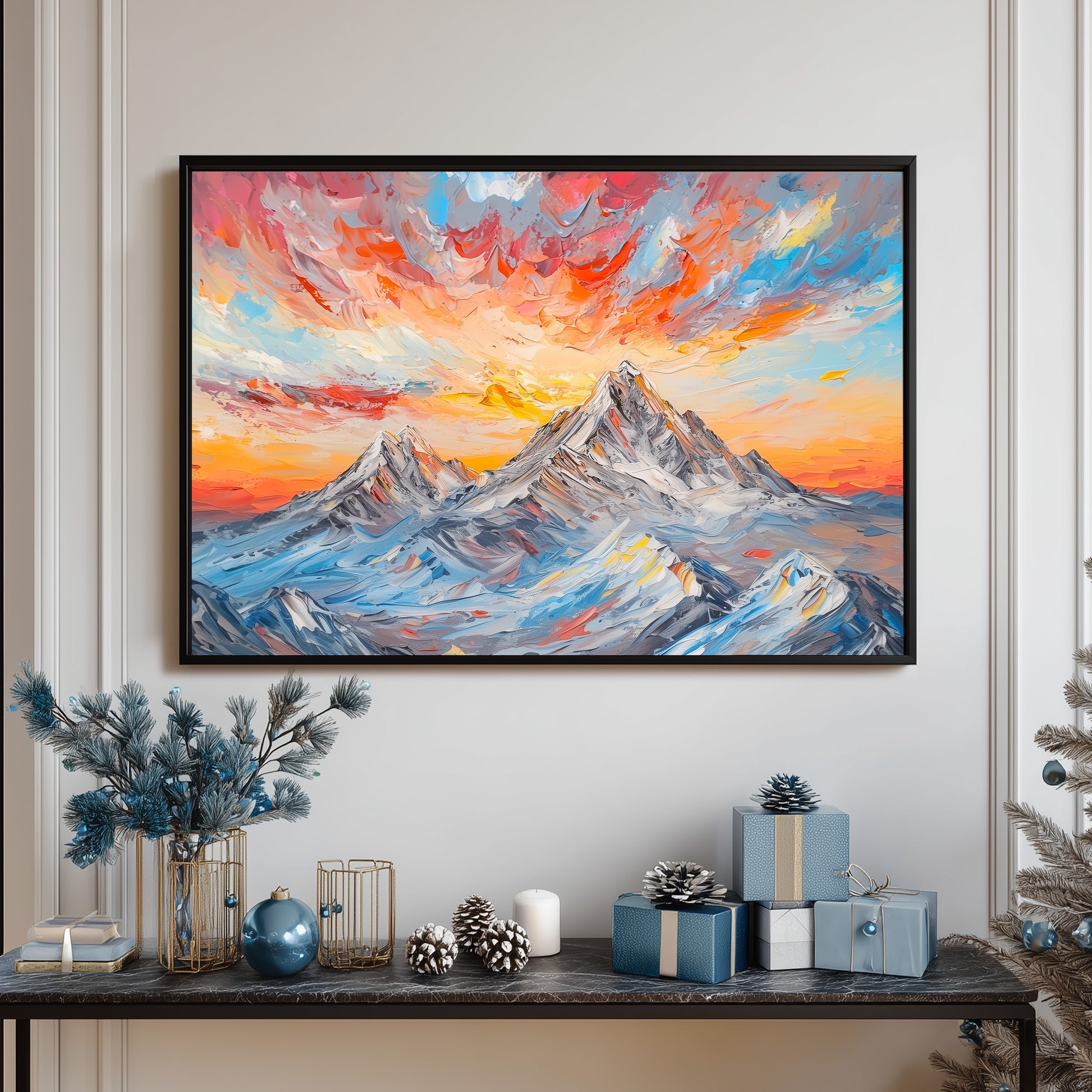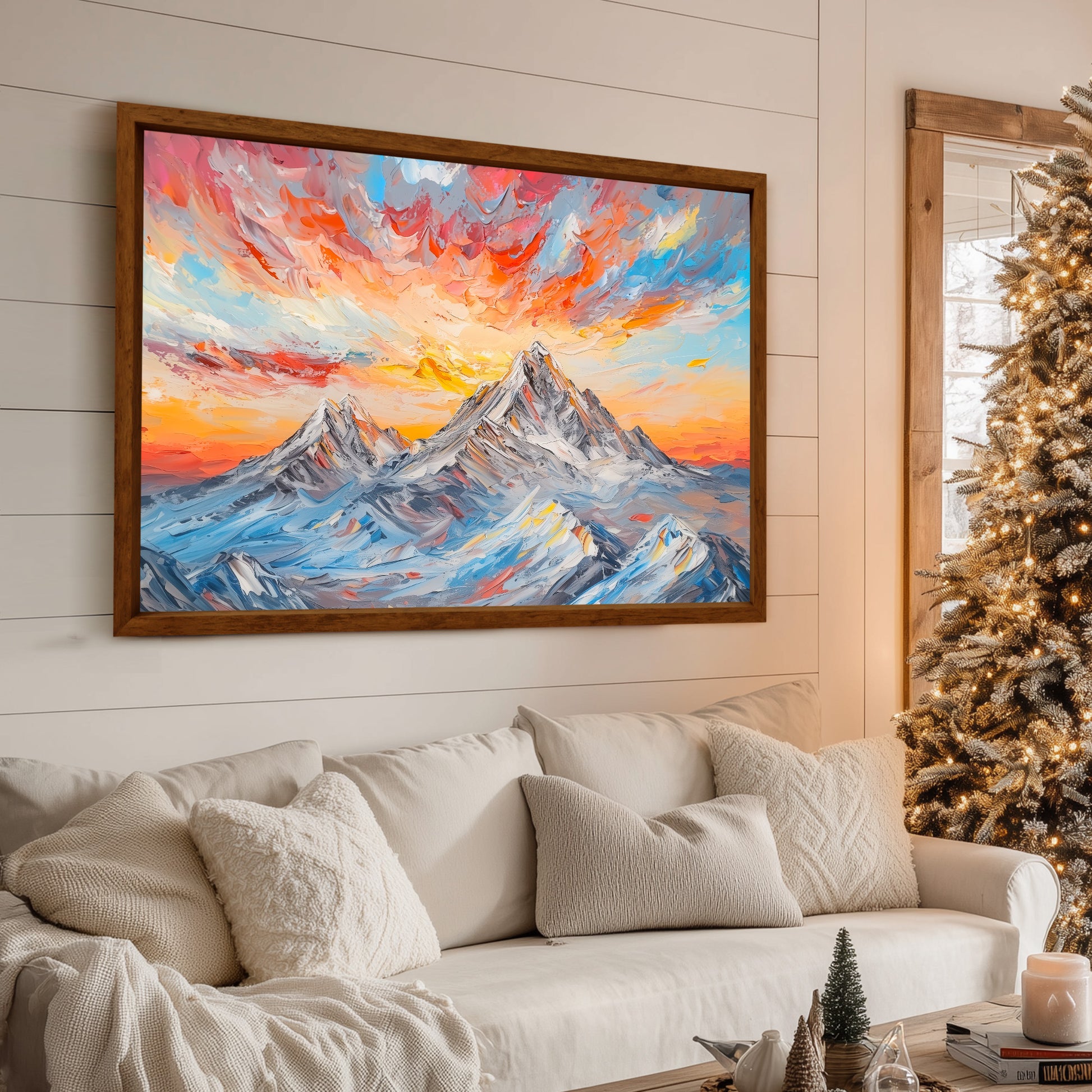 A breathtaking impasto oil painting capturing majestic snow-capped mountain peaks during a vivid sunset. The sky is a dramatic explosion of fiery oranges, deep pinks, and warm yellows, contrasting with the cool blues and crisp whites of the rugged terrain. Thick, textured palette knife strokes create a sense of movement and energy throughout the piece. This powerful mountain landscape is perfect for bringing a sense of natural grandeur and vibrant color to any modern living room or office space.
