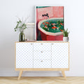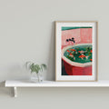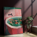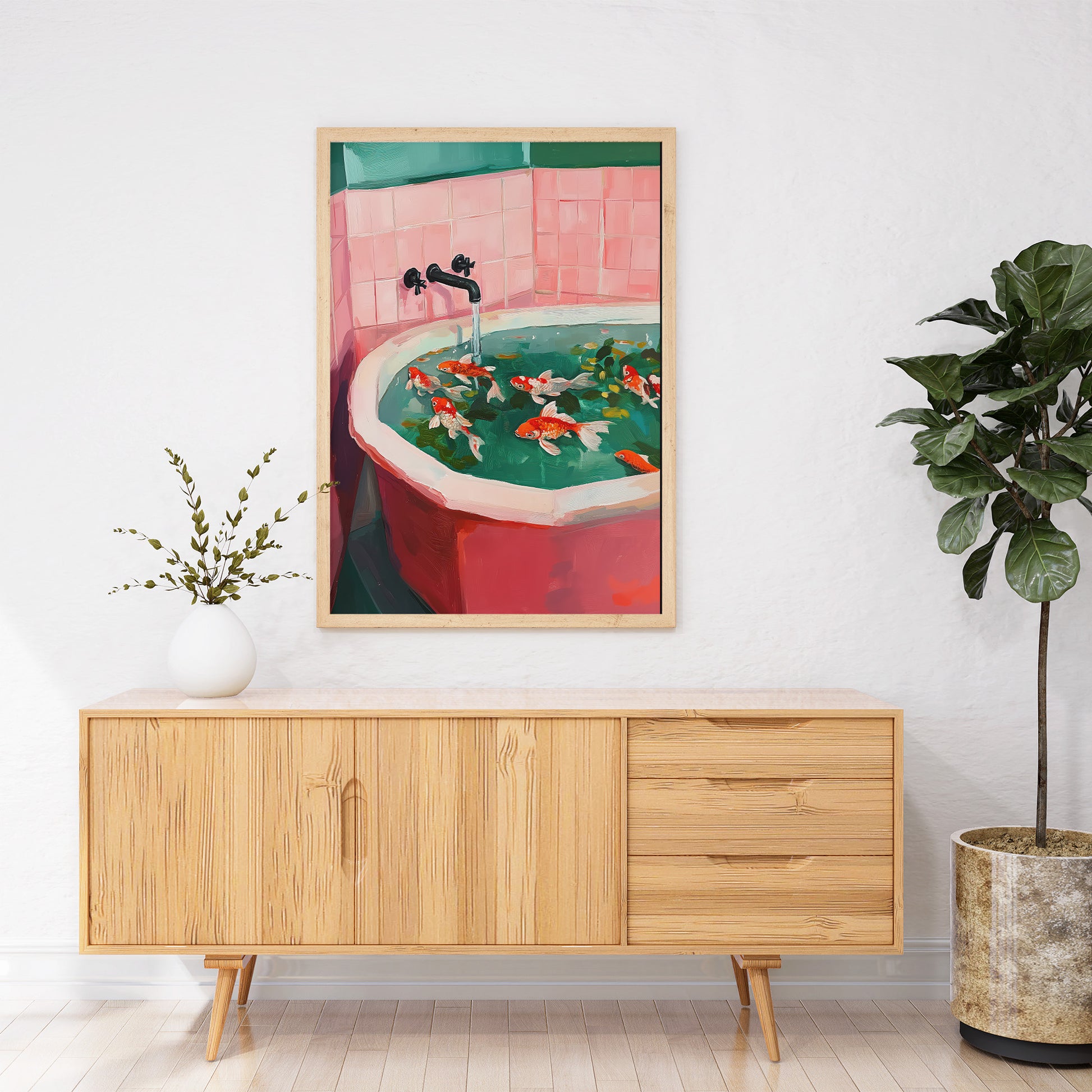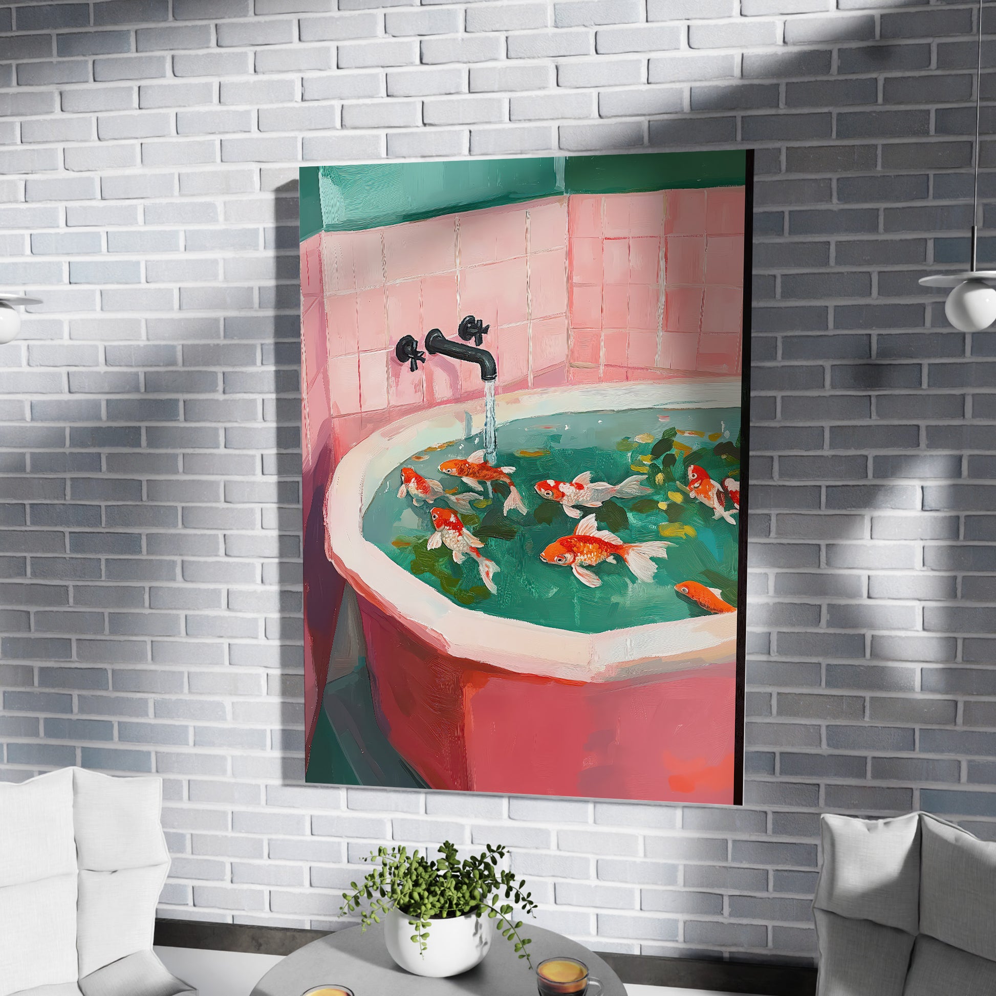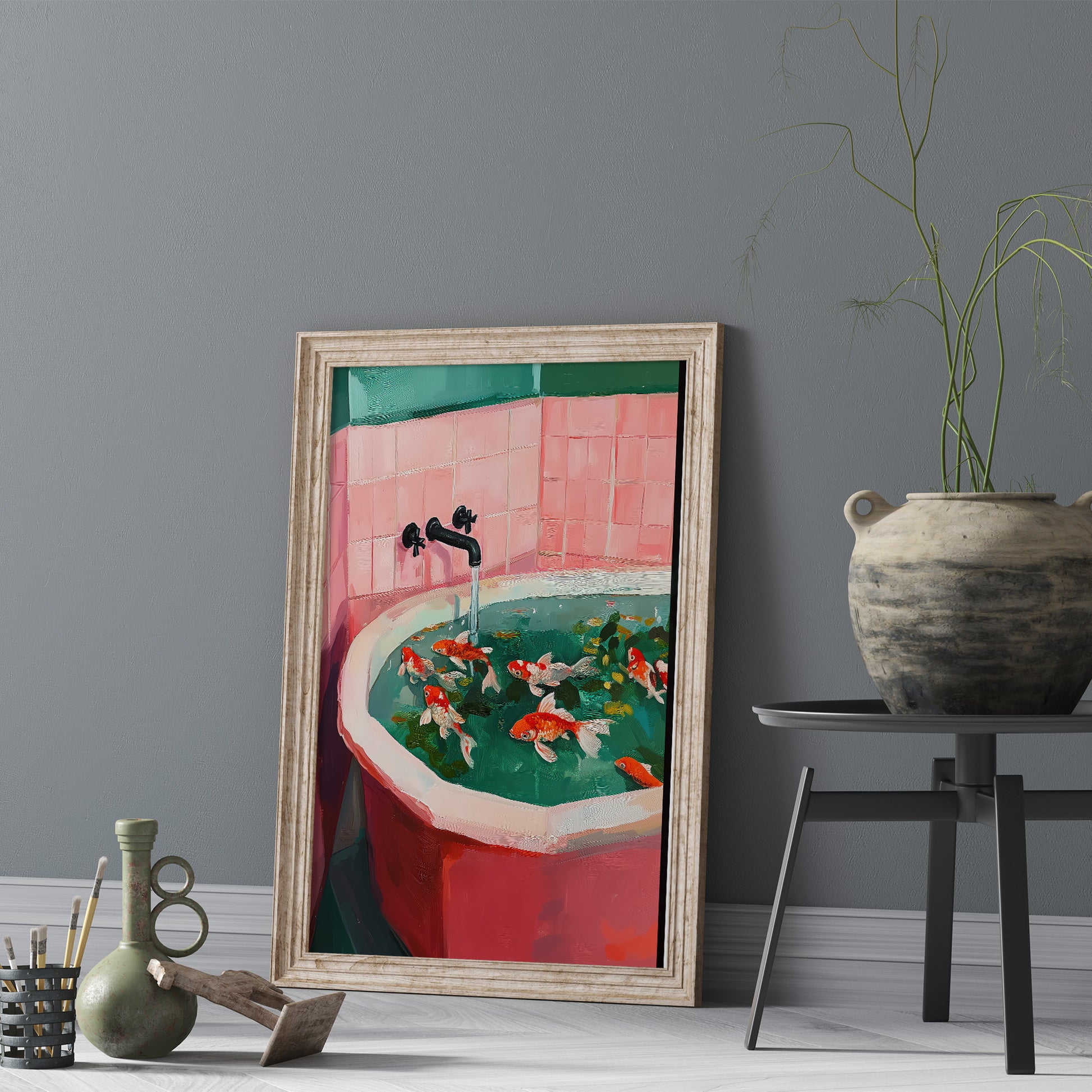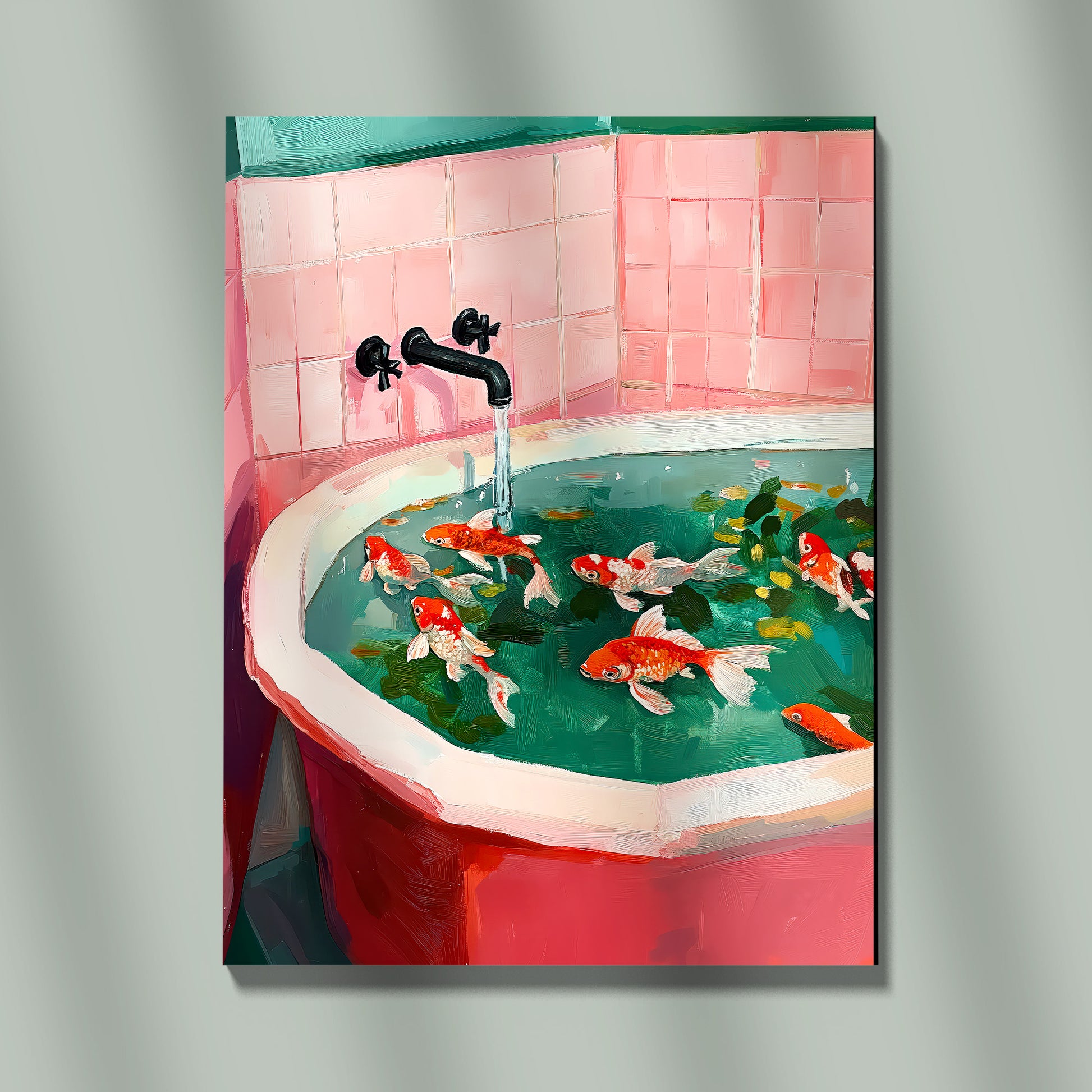 A whimsical and vividly painted scene features a retro-style pink bathtub filled with serene green-tinted water where a lively group of bright orange-and-white koi fish swim gracefully. Soft, expressive brushstrokes give the entire composition a dreamy painterly feel, while green leaves floating on the water add a natural touch that contrasts beautifully with the warm pink tiles. The black faucet above the tub continues to pour water, adding motion and freshness to the artwork.