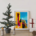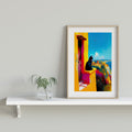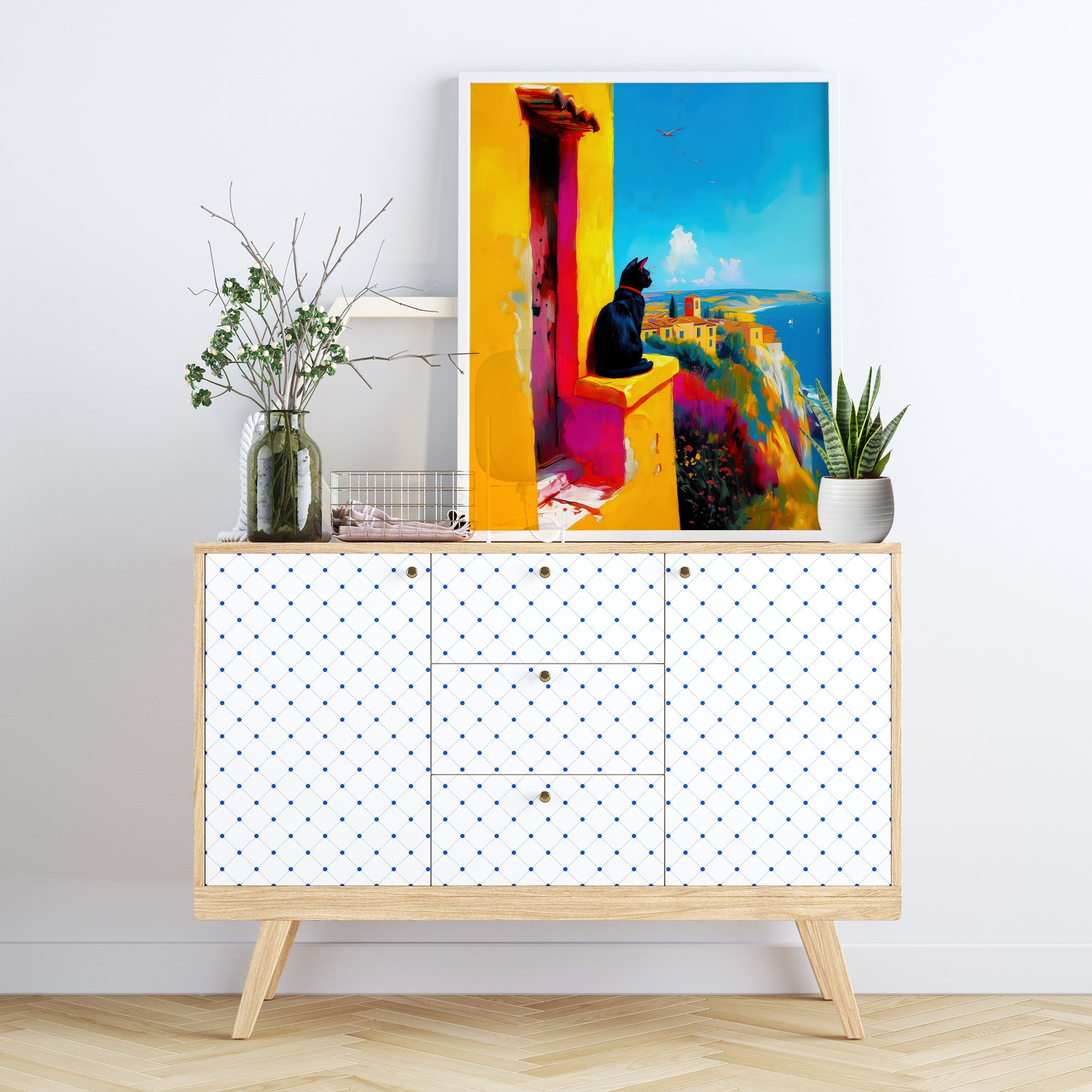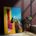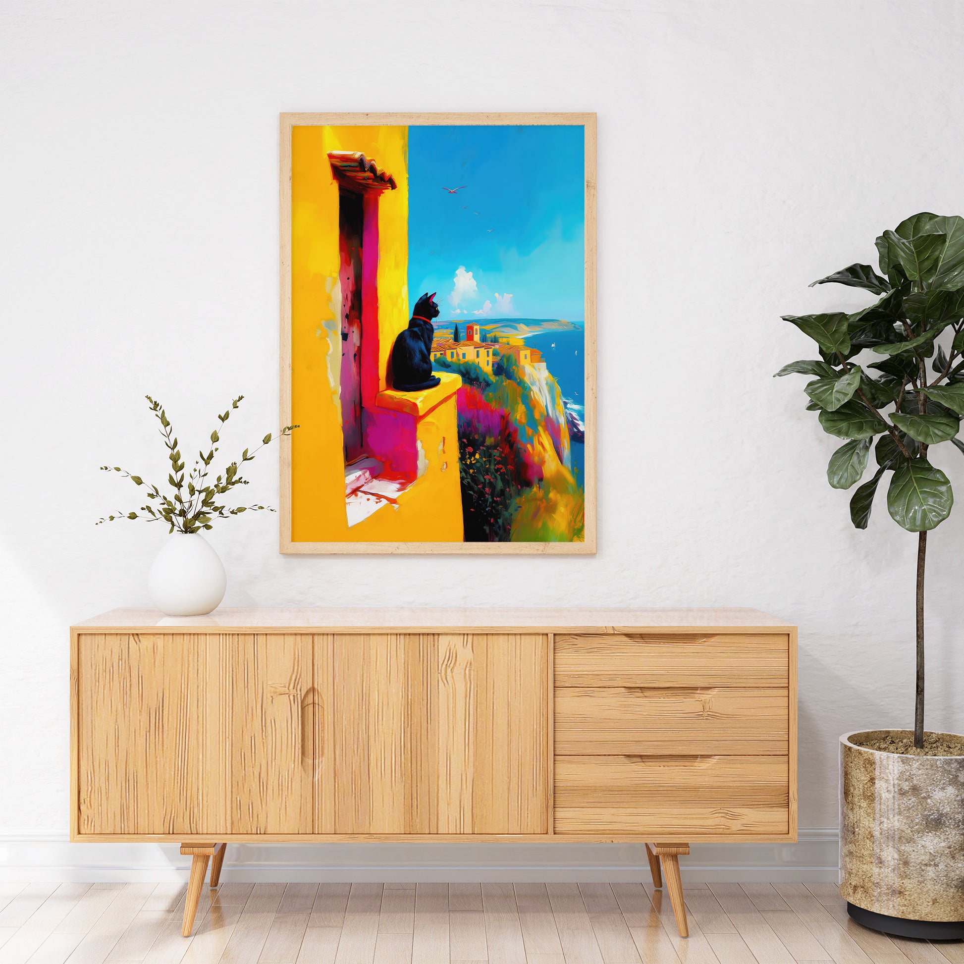 Vibrant Mediterranean Seascape Painting With Black Cat On A Yellow Balcony Overlooking Colorful Coastal Town