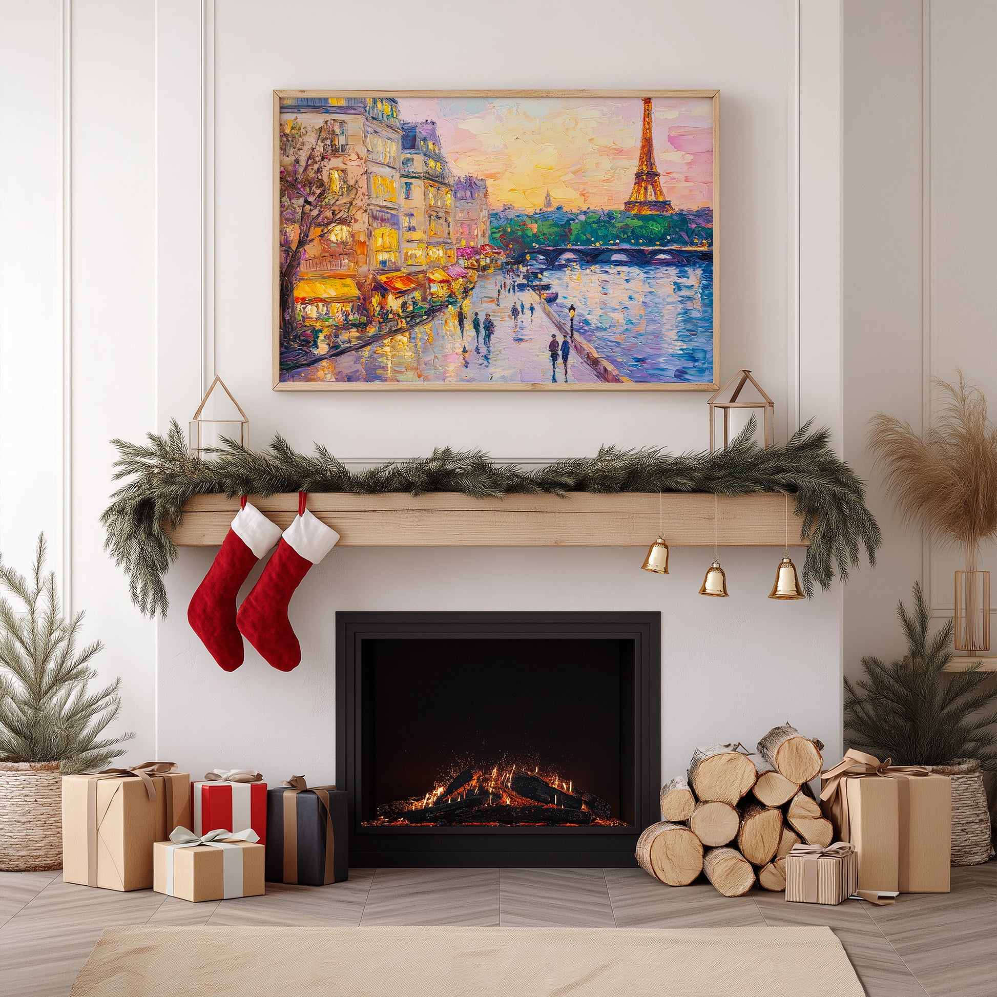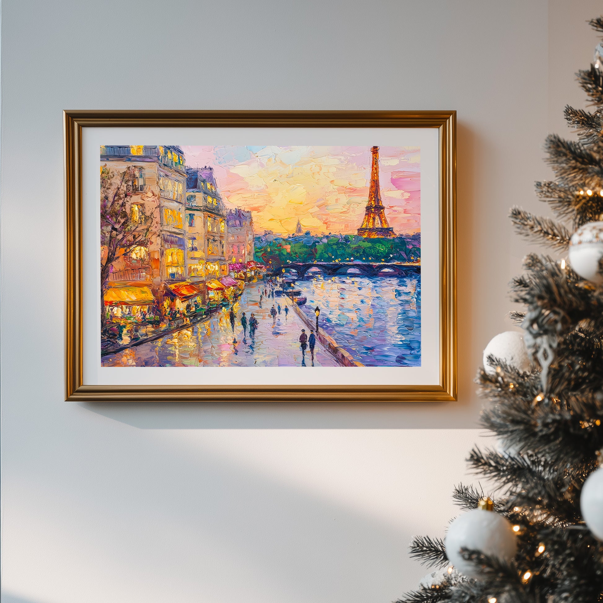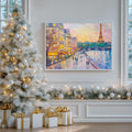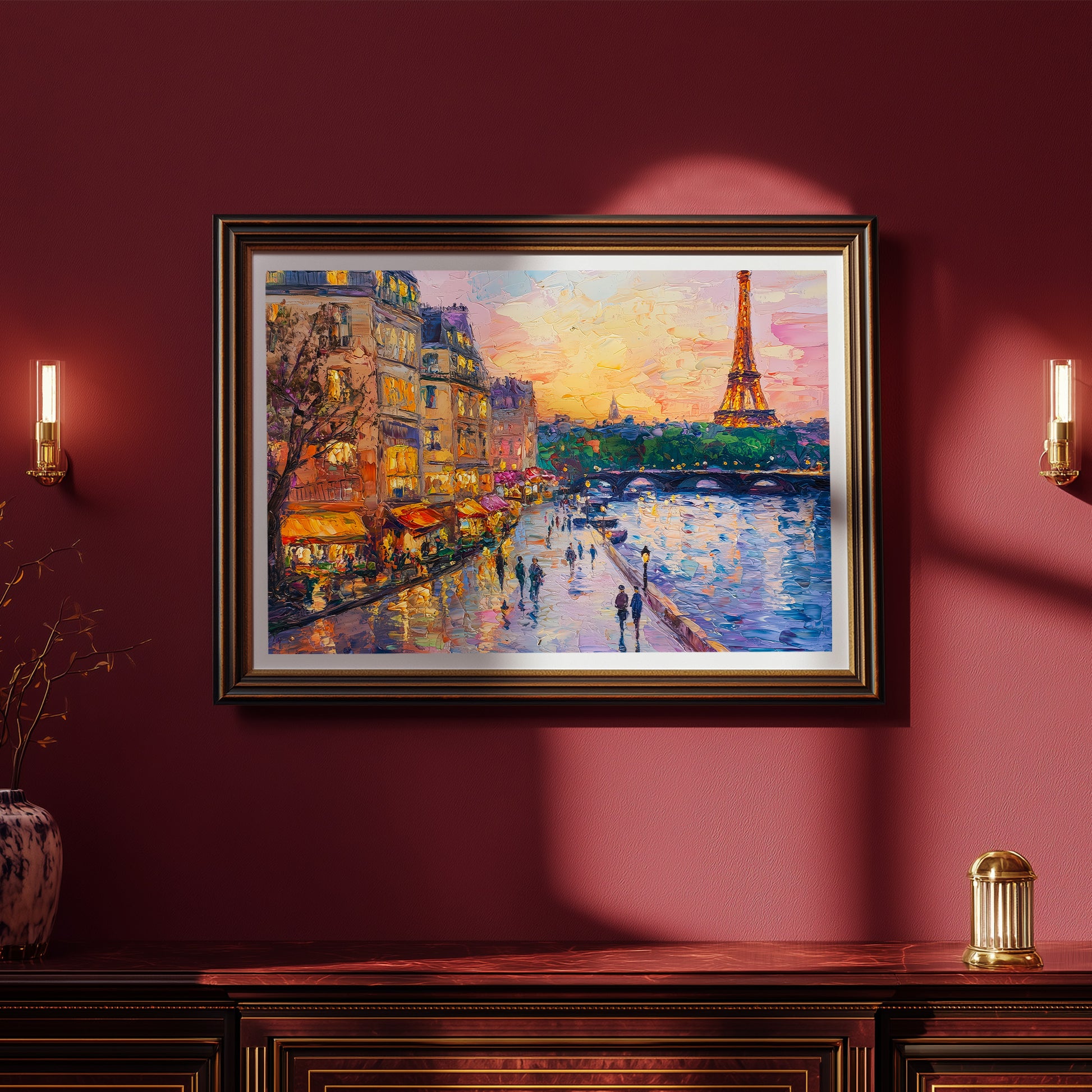 A stunning and lively impasto oil painting capturing a classic Parisian evening along the Seine River. The artwork features the iconic Eiffel Tower glowing against a warm sunset sky, with charming street-side cafes, glowing yellow awnings, and people strolling along the riverbank. Thick, textured brushstrokes and a rich color palette of gold, pink, and deep blue bring the "City of Light" to life with romantic energy. This expressive piece is an ideal focal point for a sophisticated living room, a master bedroom, or a travel-inspired gallery, evoking the timeless elegance of France.