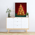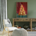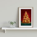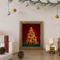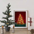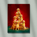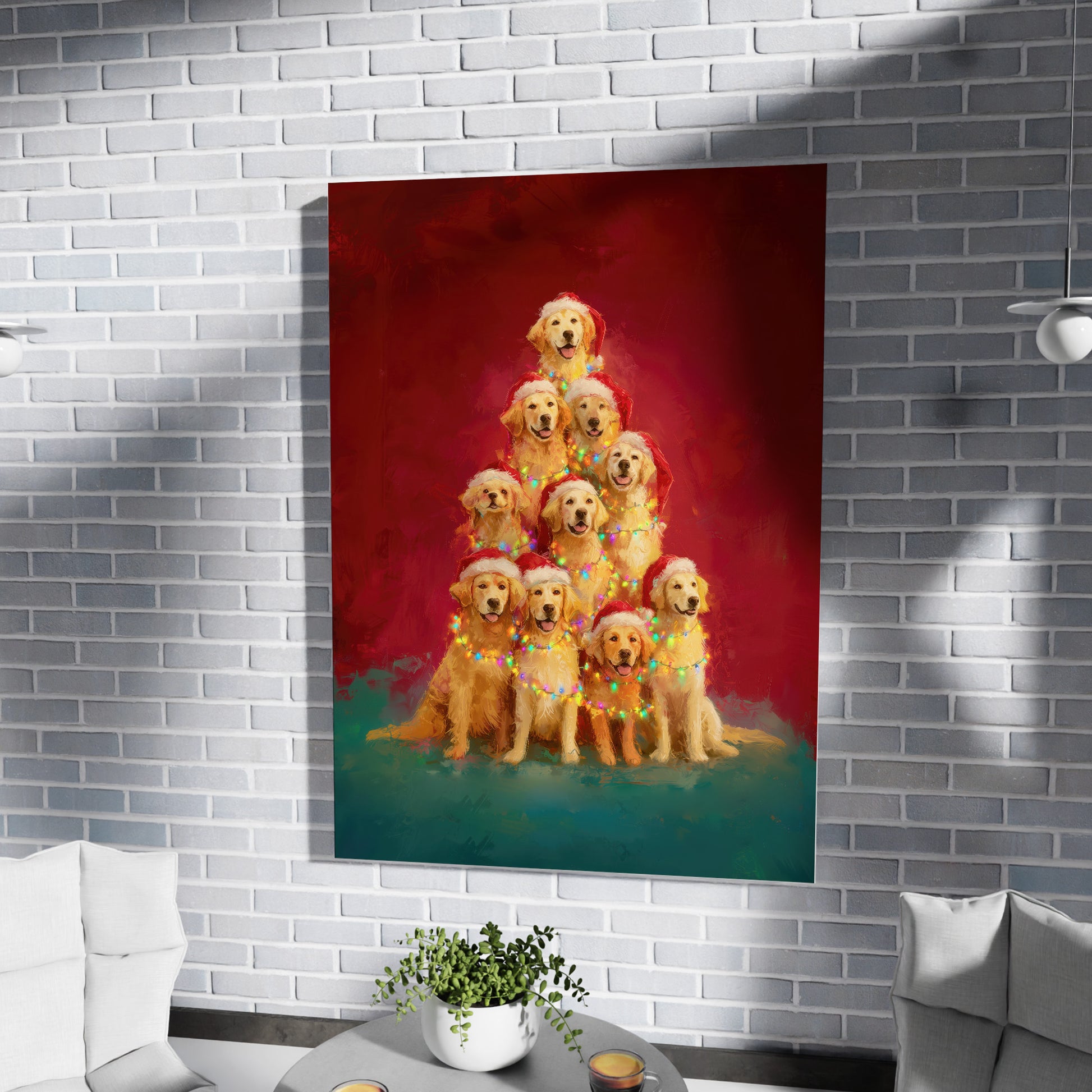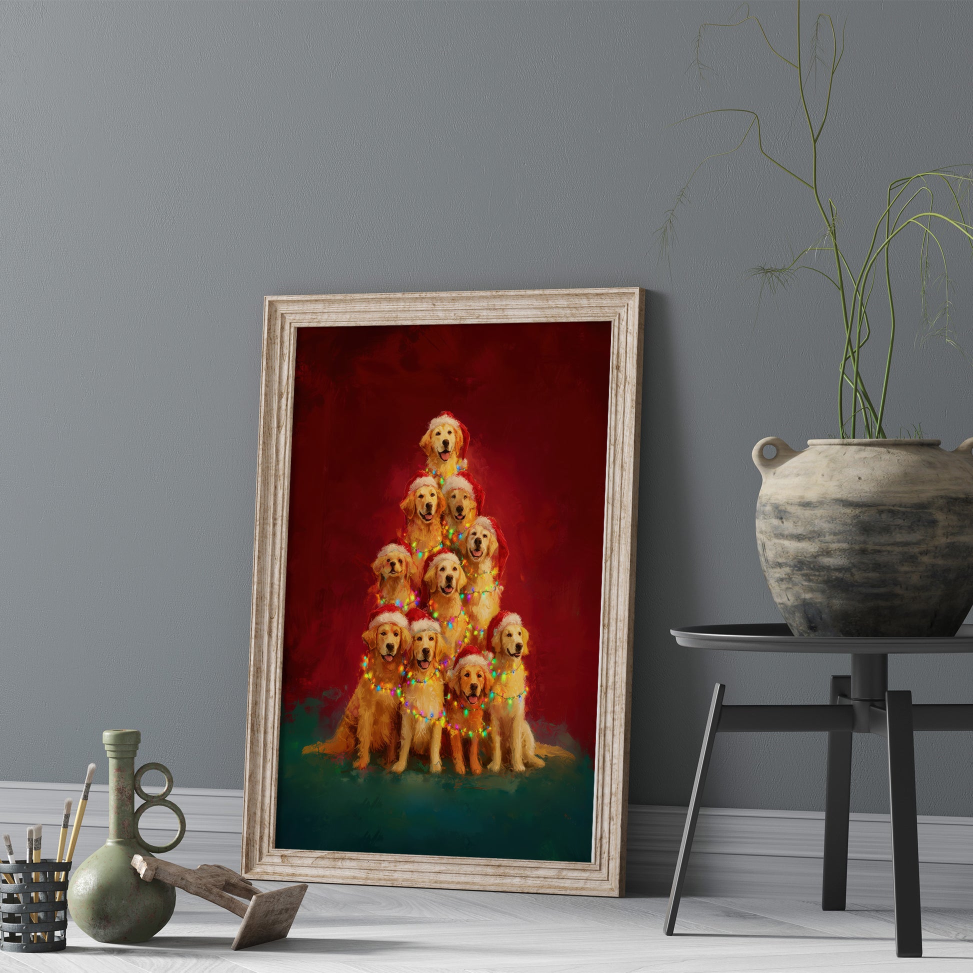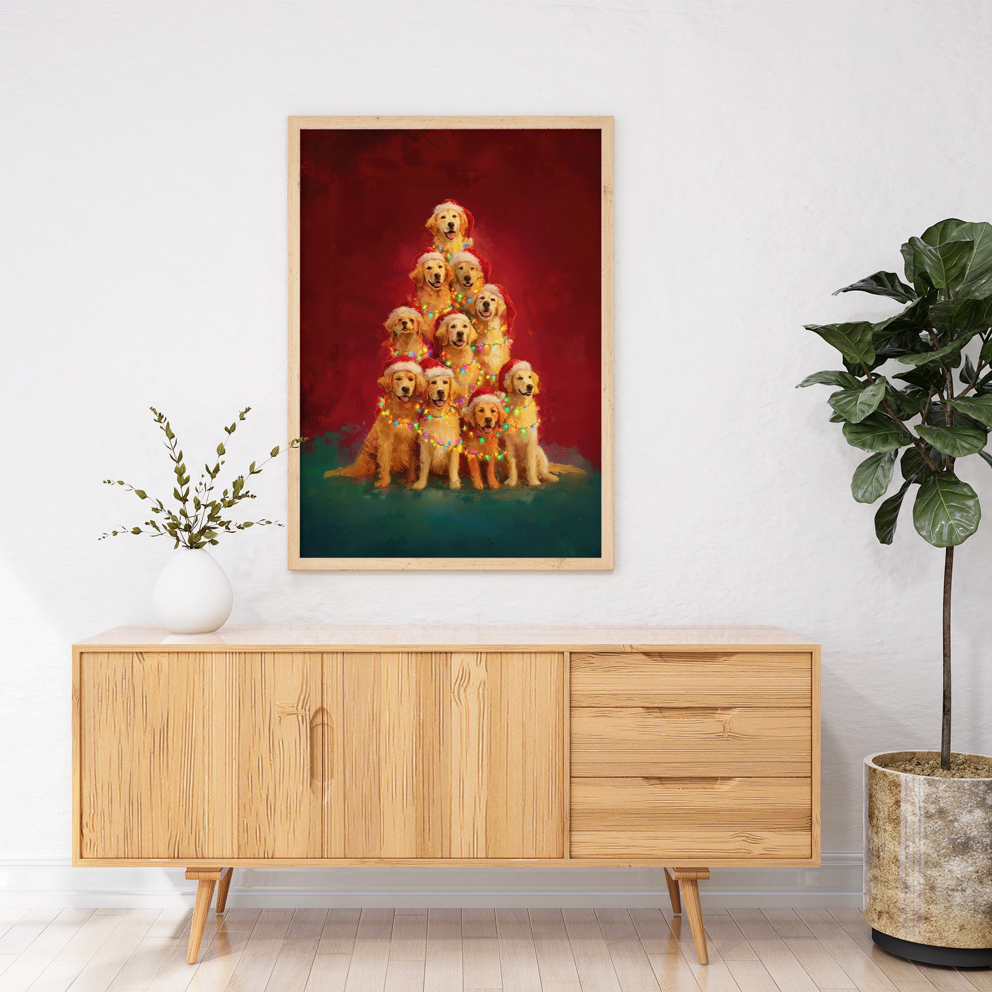 This charming holiday artwork features a joyful pyramid of Golden Retrievers stacked like a Christmas tree, each wearing a Santa hat and wrapped in glowing festive lights. The rich red background enhances the warm, cozy holiday spirit, making this print perfect for Christmas décor, dog lovers, and festive home styling. Ideal for seasonal wall art, gift giving, and anyone who adores Golden Retrievers and whimsical Christmas scenes.