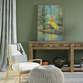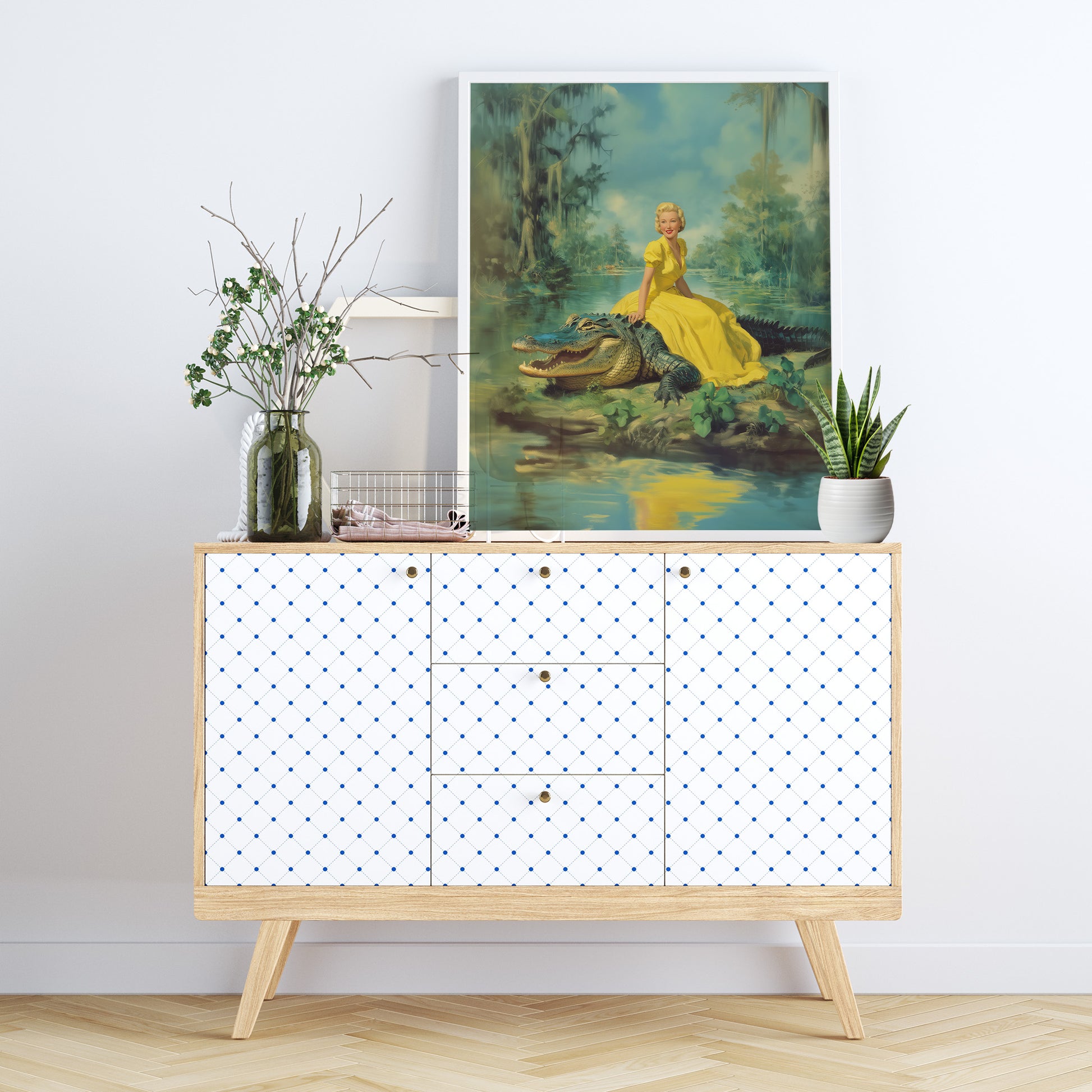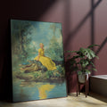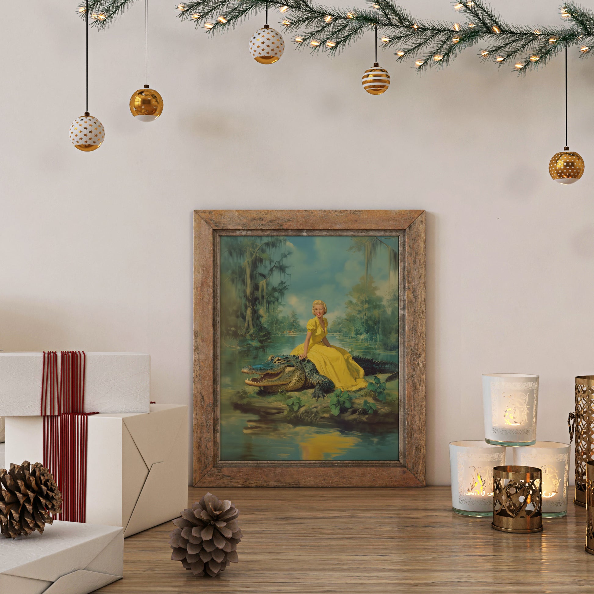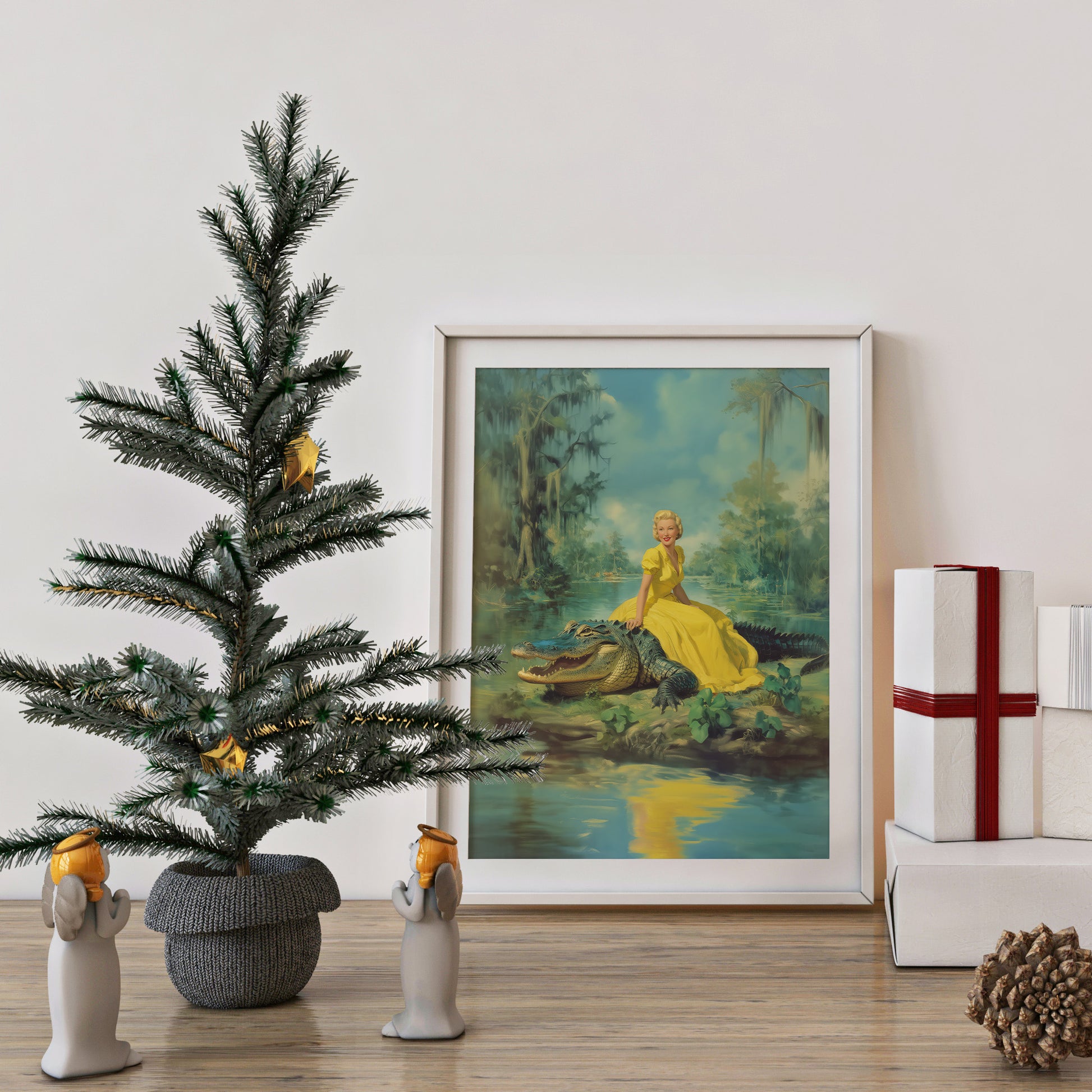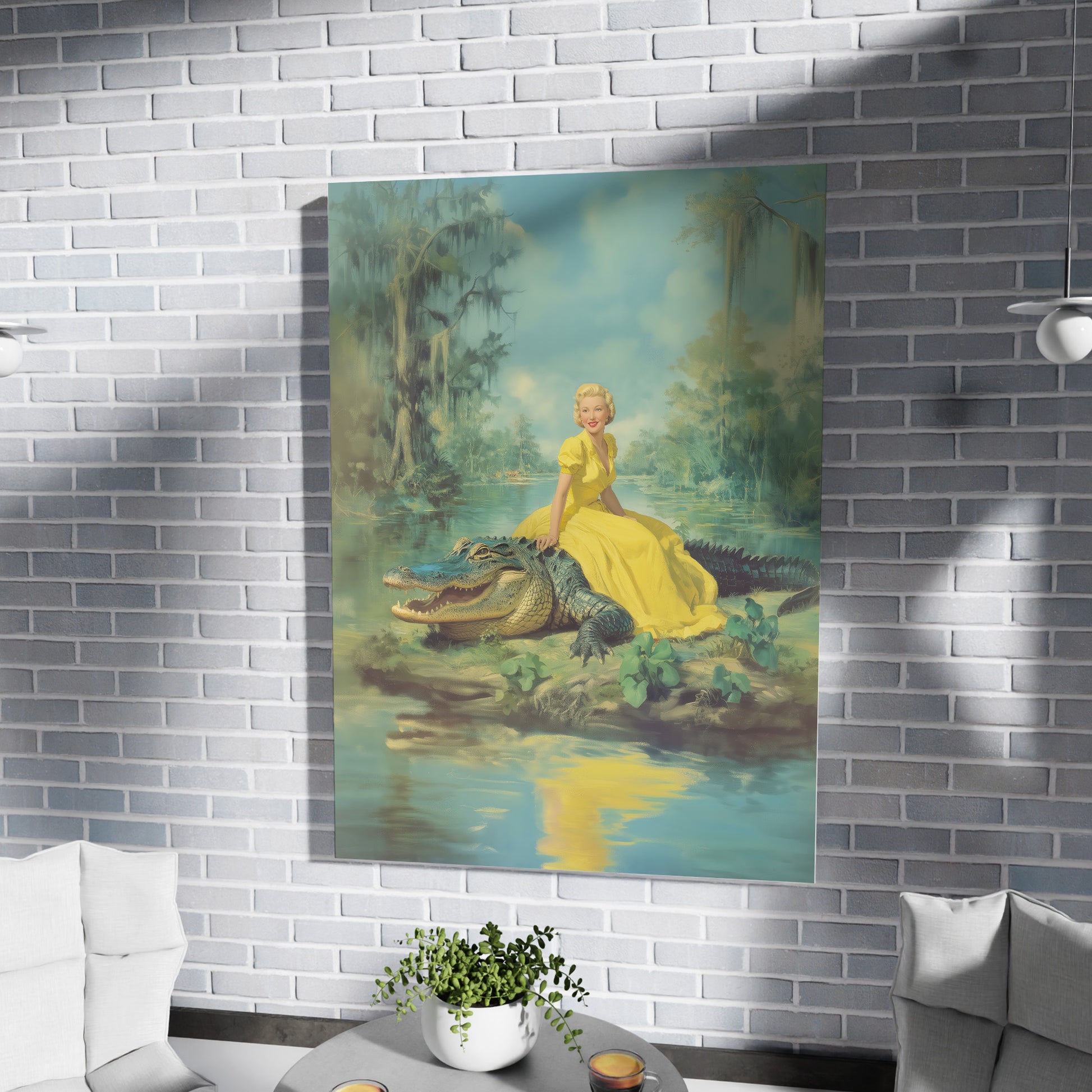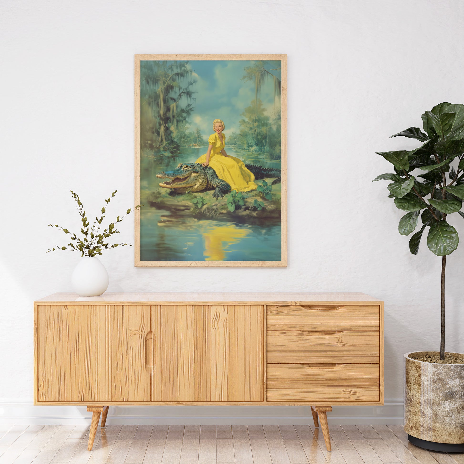 A captivating painting blending vintage pin-up style with dramatic Southern Gothic elements. A smiling blonde woman in a vibrant, puff-sleeved yellow dress sits confidently atop a massive American alligator resting on a muddy bank. The scene is set in a mysterious, misty Louisiana bayou or swamp, characterized by drooping Spanish moss, murky water reflections, and lush, ethereal greenery. The art style is polished and illustrative, evoking the glamour of 1950s posters while maintaining a sense of adventure and subtle danger. The contrast between the bright yellow dress and the subdued, teal-green background makes the subject pop, creating a truly unique and bold piece.
