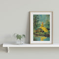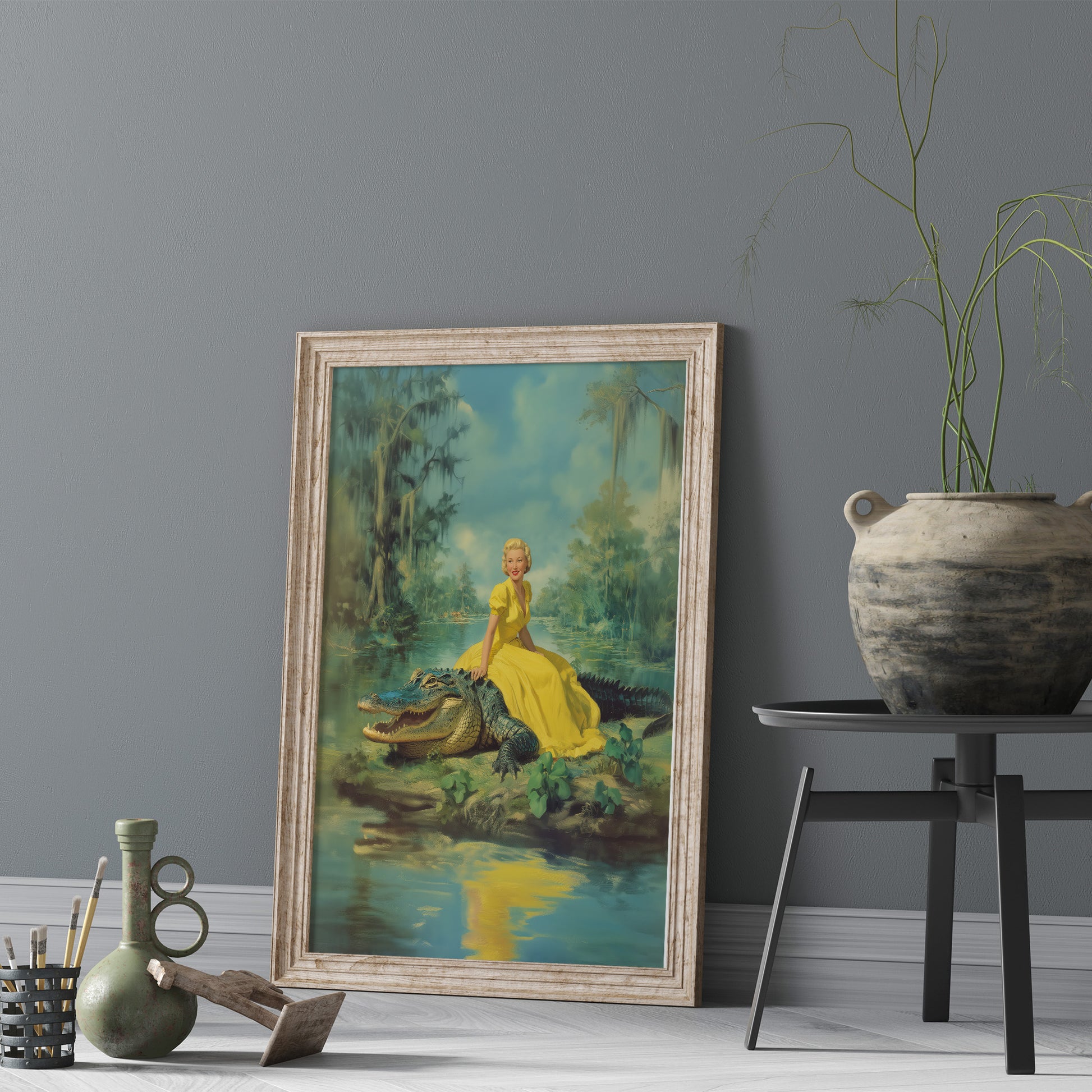 Vintage Pin-Up Art: Blonde Woman In Bright Yellow Dress Posing Fearlessly On A Large Alligator In A Misty Bayou Swamp