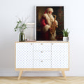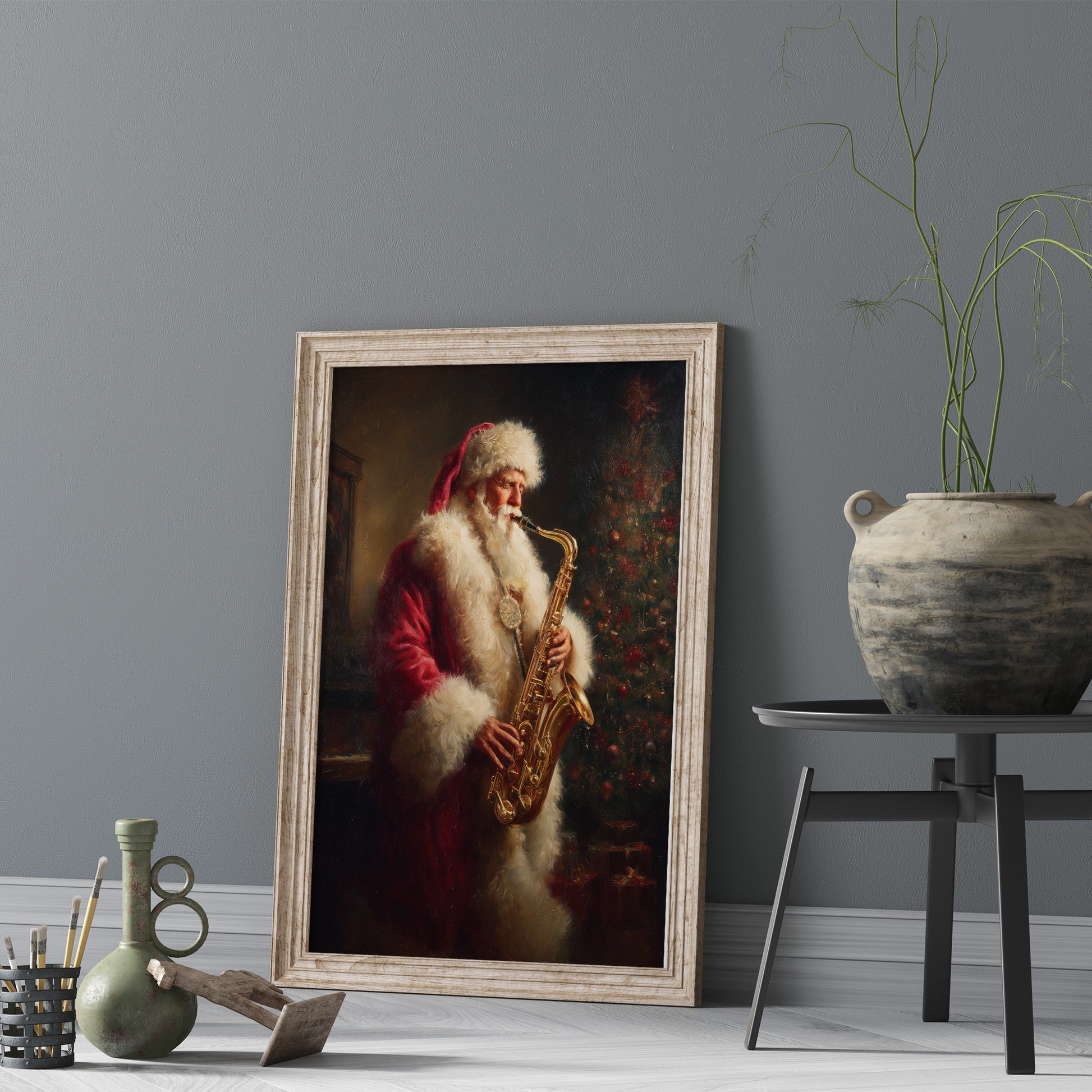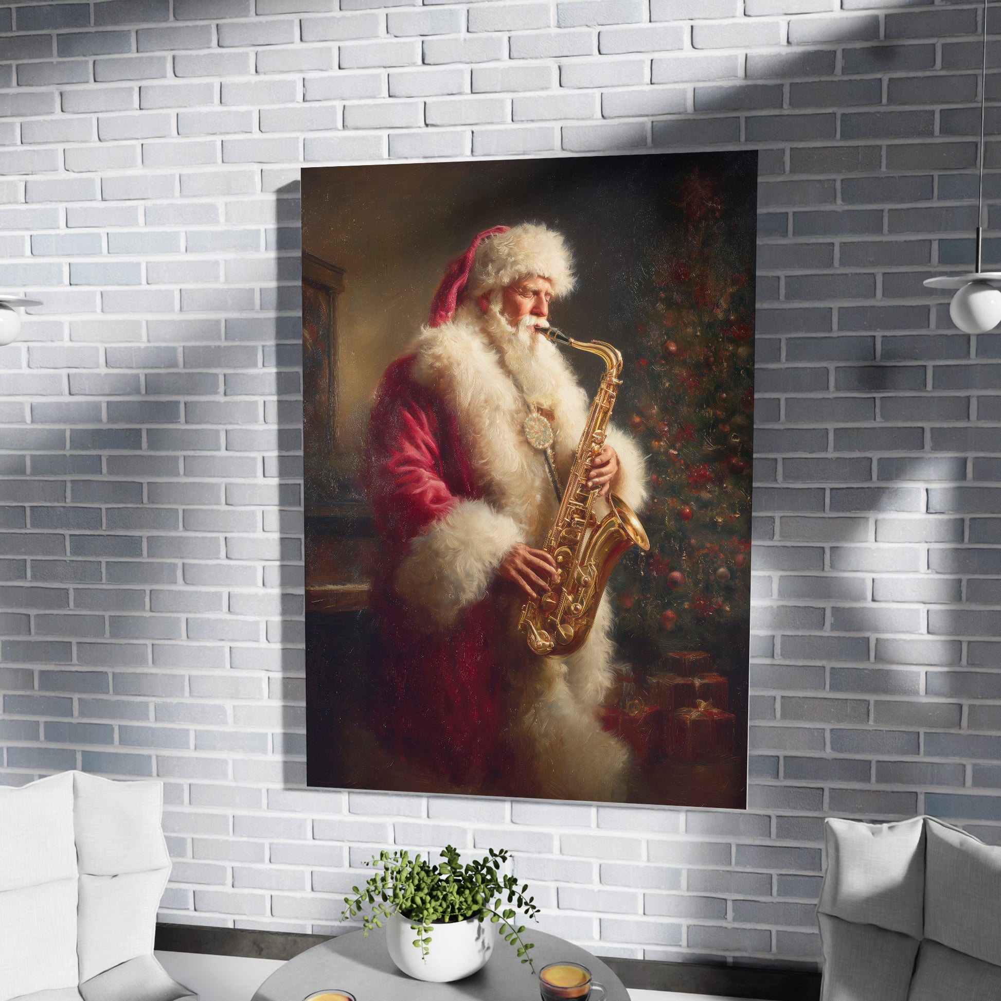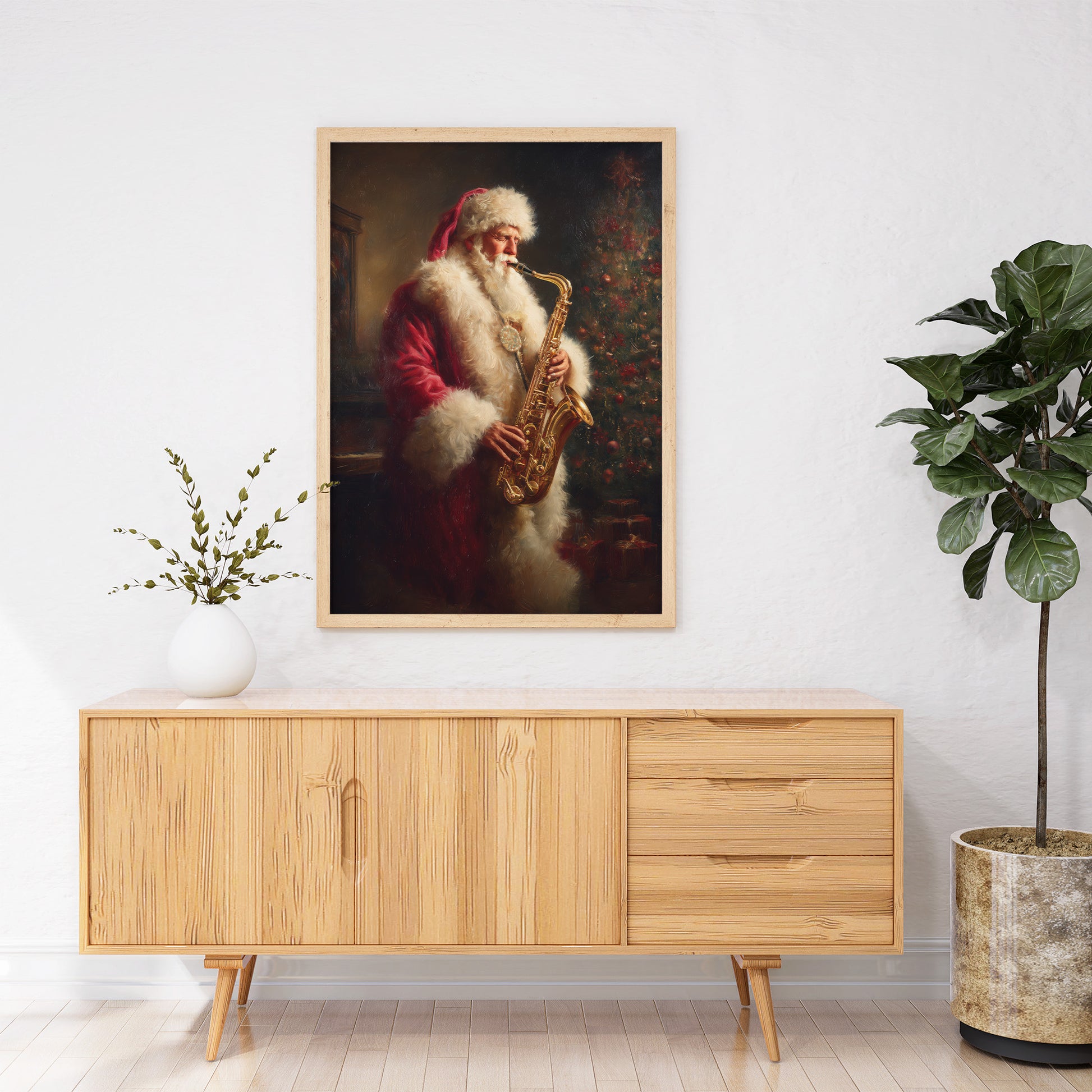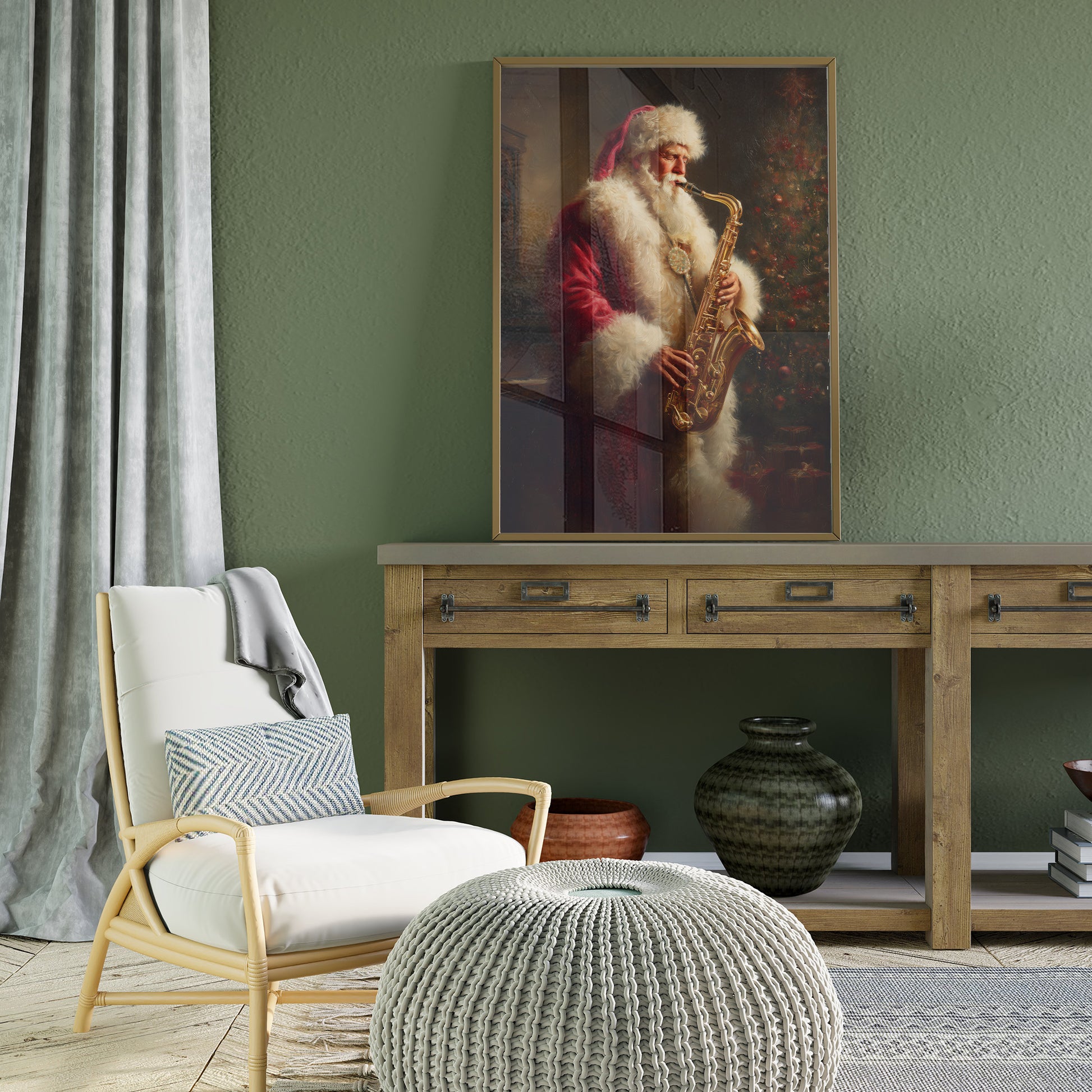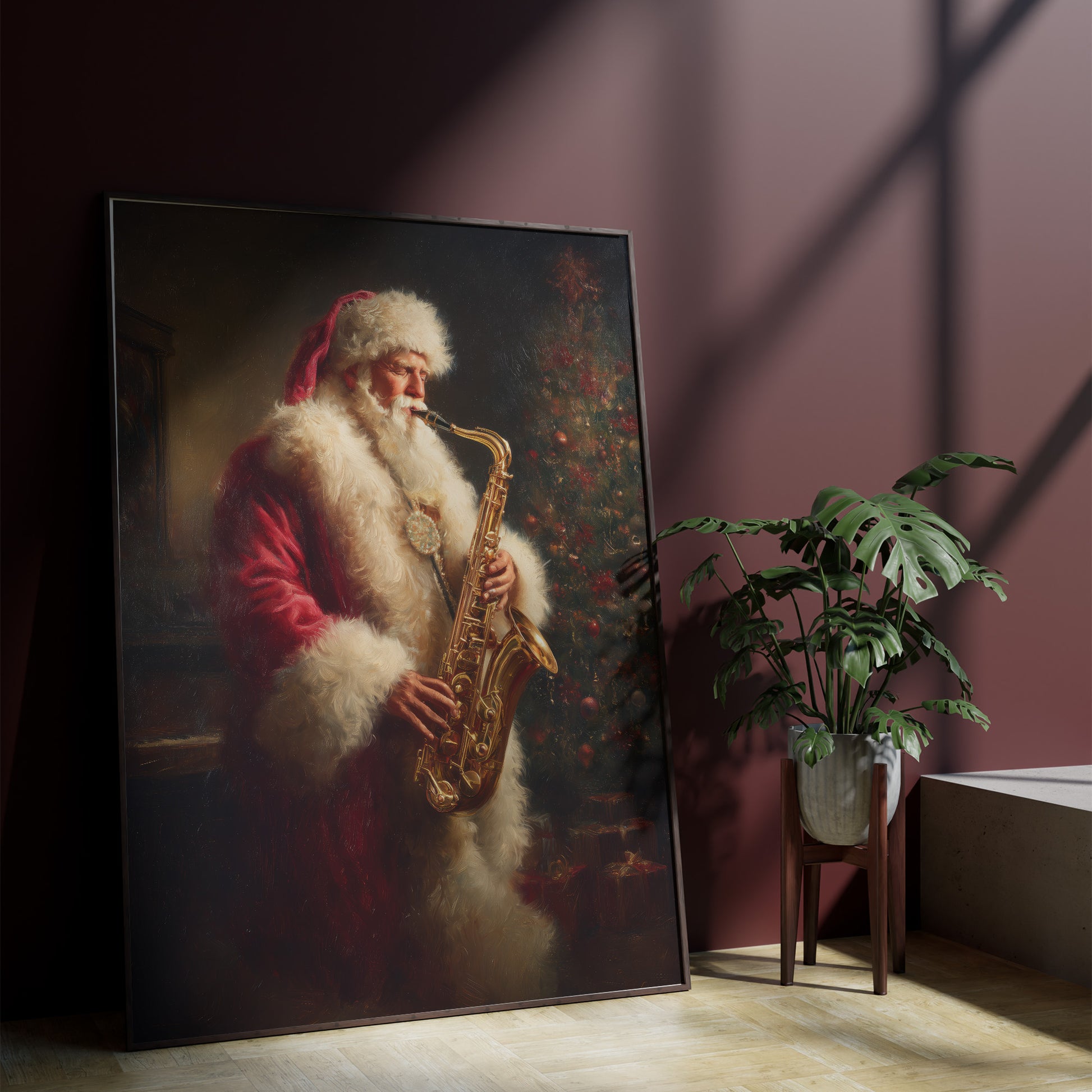This artwork features a beautifully detailed vintage-style Santa Claus playing a golden saxophone beside a warmly lit Christmas tree. The rich colors, soft lighting, and classic festive atmosphere make it a perfect holiday wall decor piece for music lovers, Christmas enthusiasts, and vintage art collectors. Ideal for living rooms, studios, holiday displays, or as a thoughtful seasonal gift.