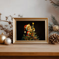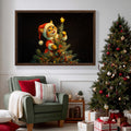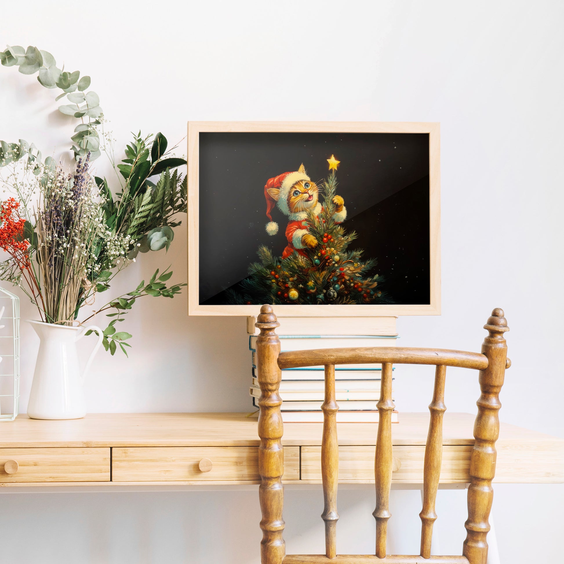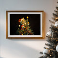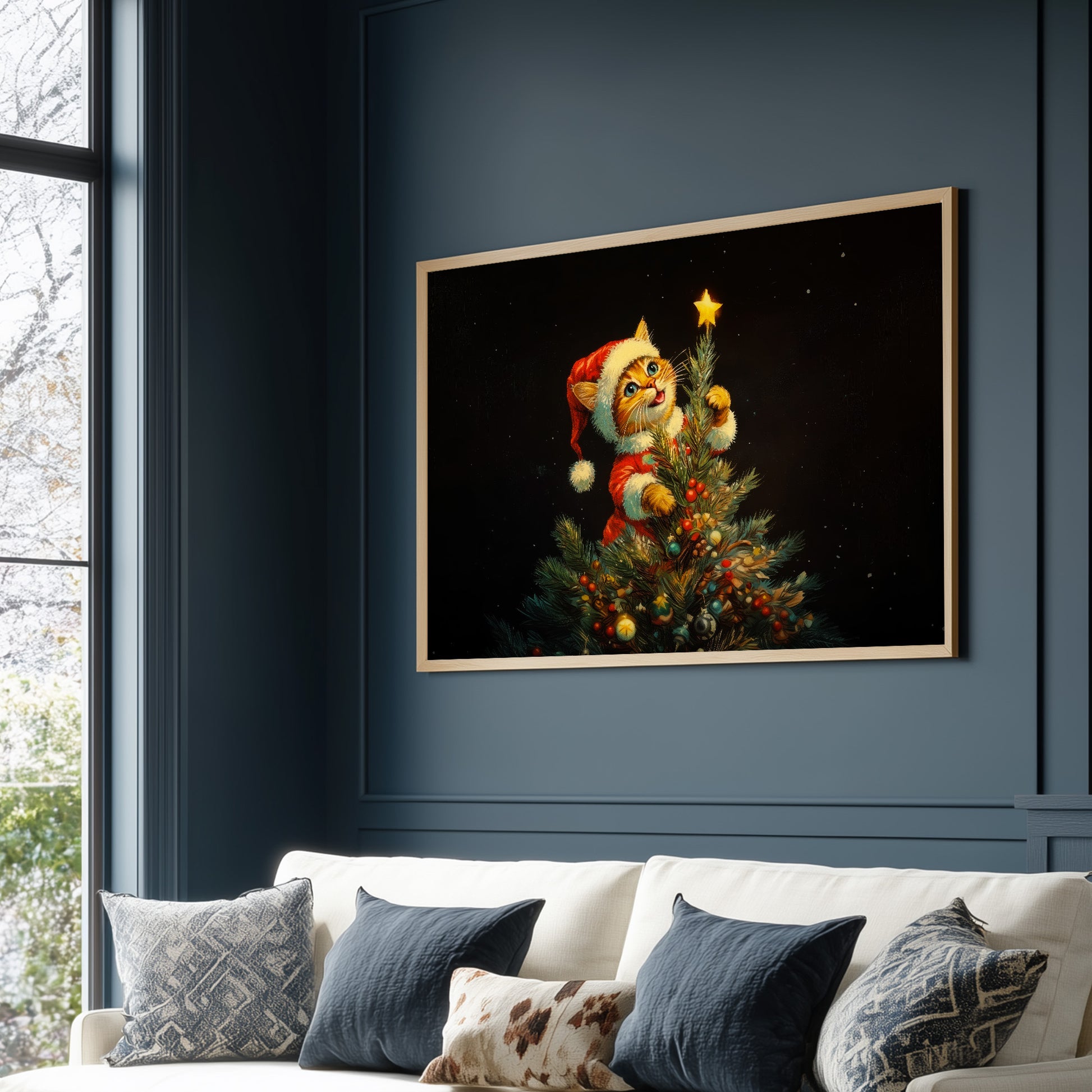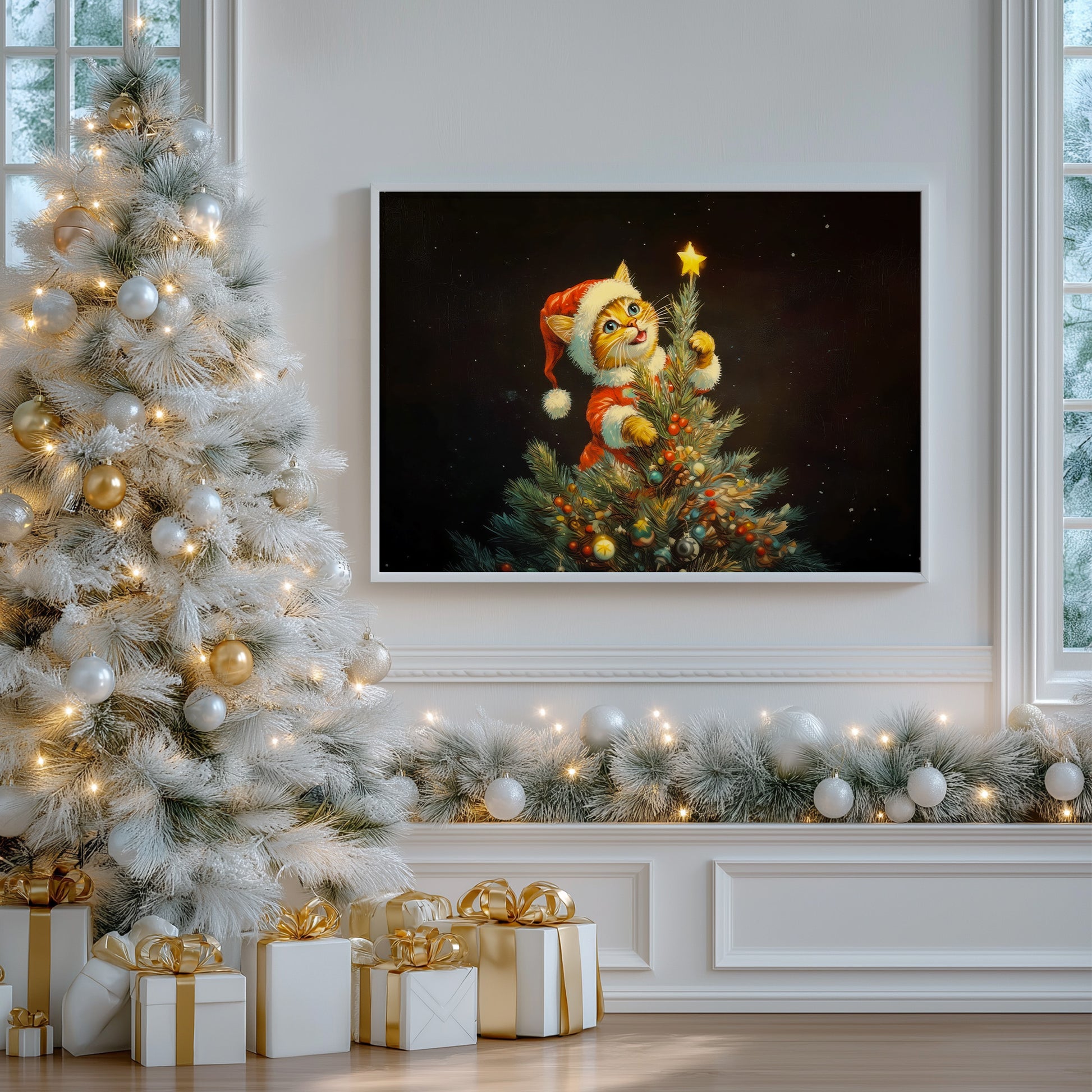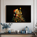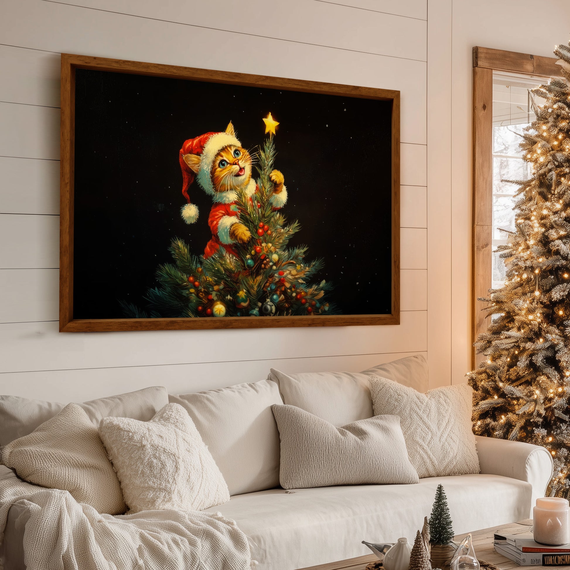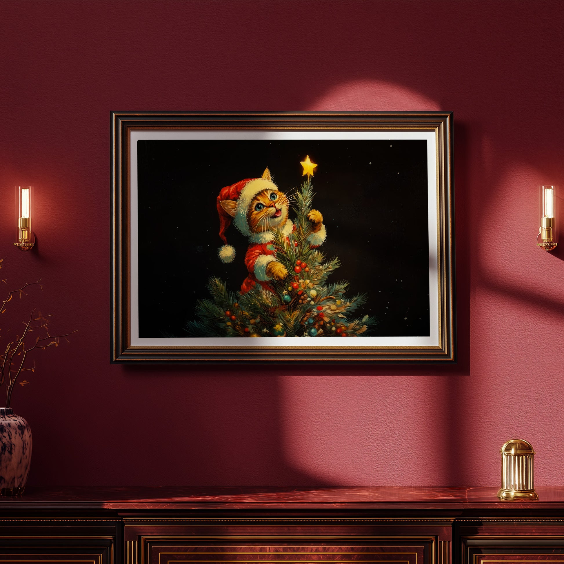 This charming Christmas artwork captures an adorable kitten dressed in a Santa outfit as it climbs the Christmas tree, reaching up to place a glowing star on top. The deep black background makes the warm lights and bright ornaments pop, creating a magical holiday ambiance. Perfect for festive home décor, gifting, or adding a touch of seasonal whimsy to any room, this print brings joy, warmth, and Christmas cheer to your space.