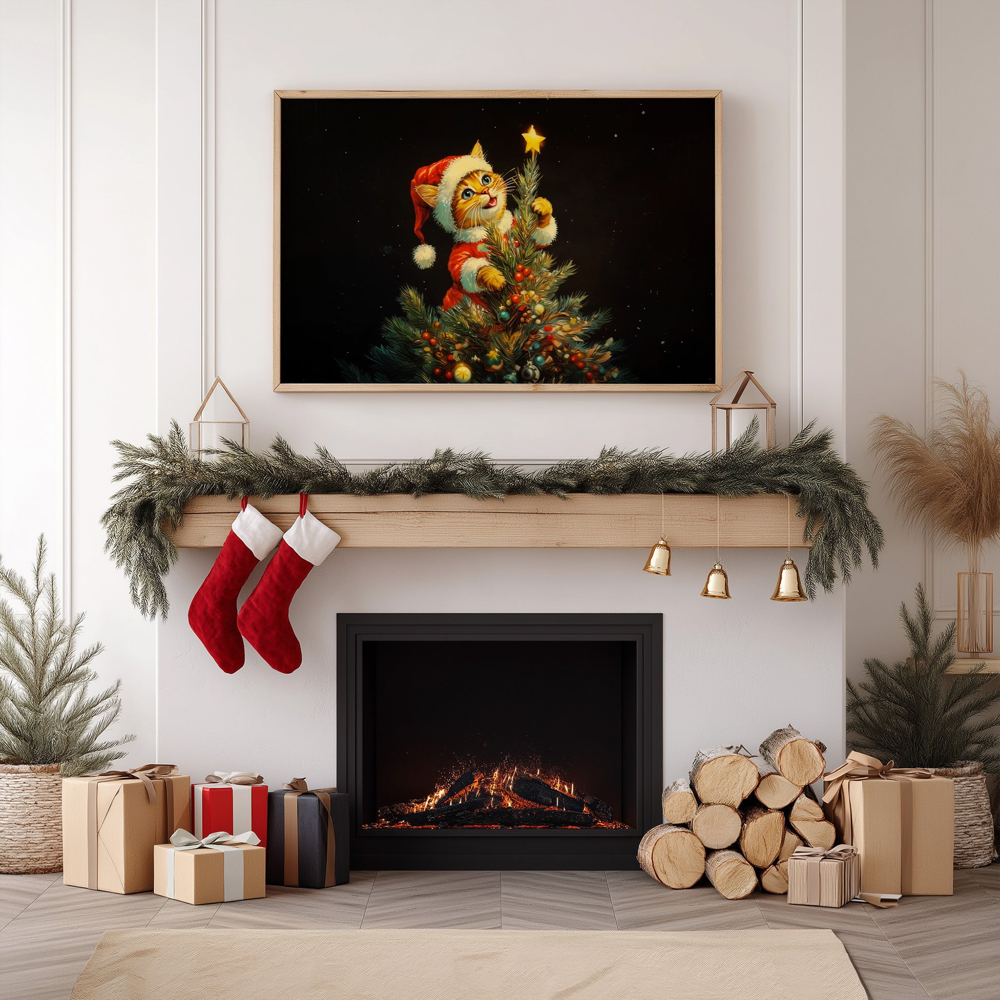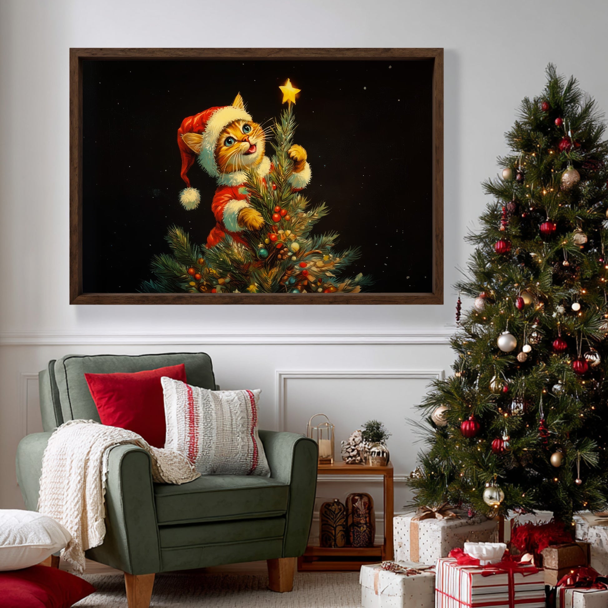 Whimsical Christmas Cat Tree Topper Art, Cute Kitten in Santa Outfit Reaching Star, Festive Holiday Wall Decor, Cozy Winter Home Print