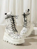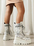 These White Spider Embroidered Thick-Soled Boots are the perfect combination of fashion and function. With a stylish high heel design and mid-calf length, these boots will elevate any outfit. The thick-soled construction provides superior comfort and stability, making these boots ideal for all-day wear. Step out with confidence and style in these must-have boots for women.