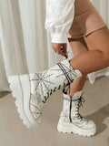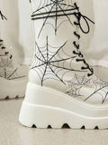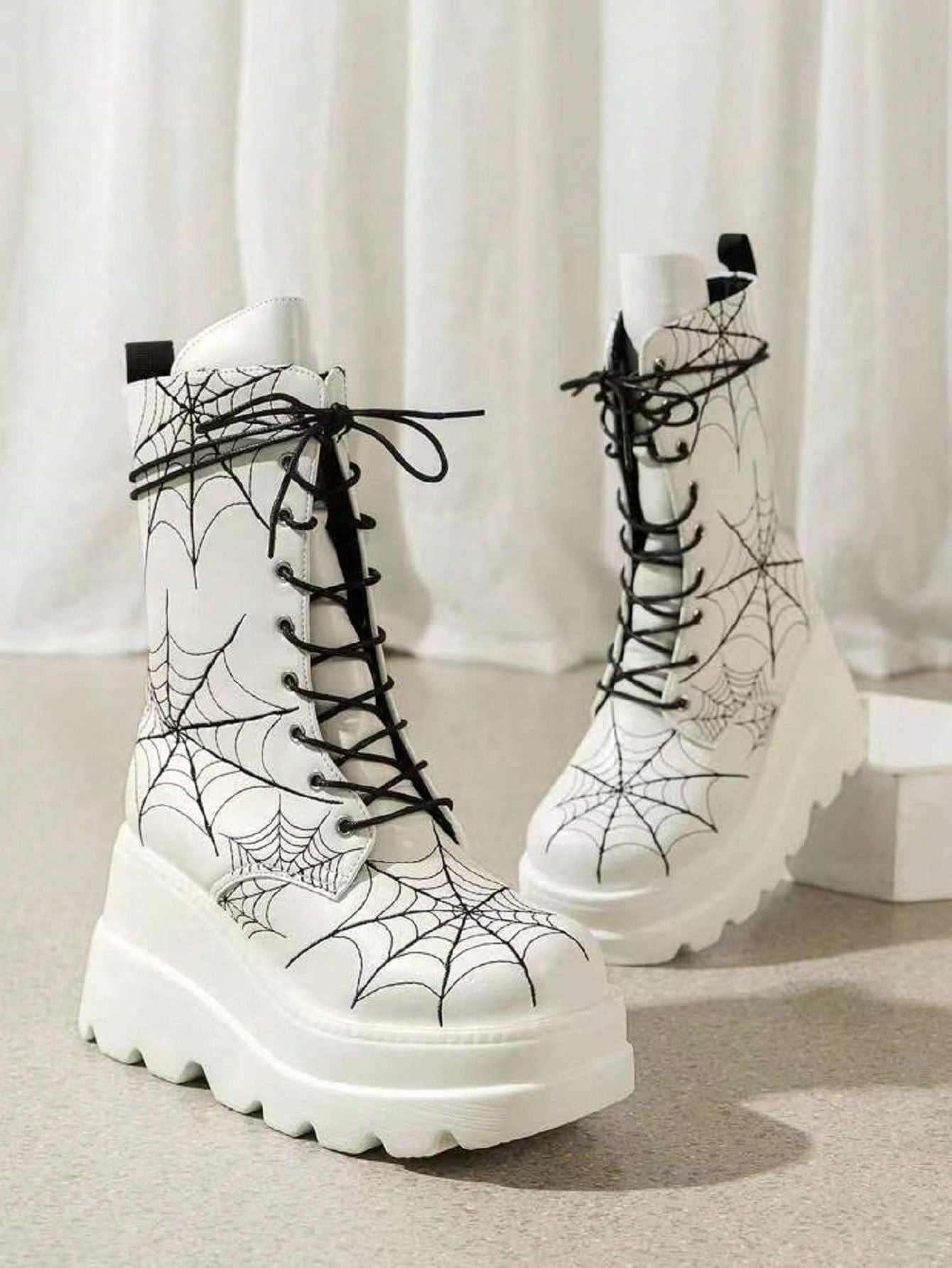 White Spider Embroidered Thick-Soled Boots: High Heel Mid-Calf Boots for Women