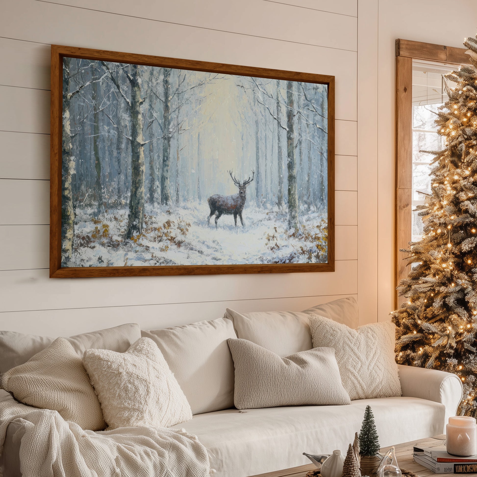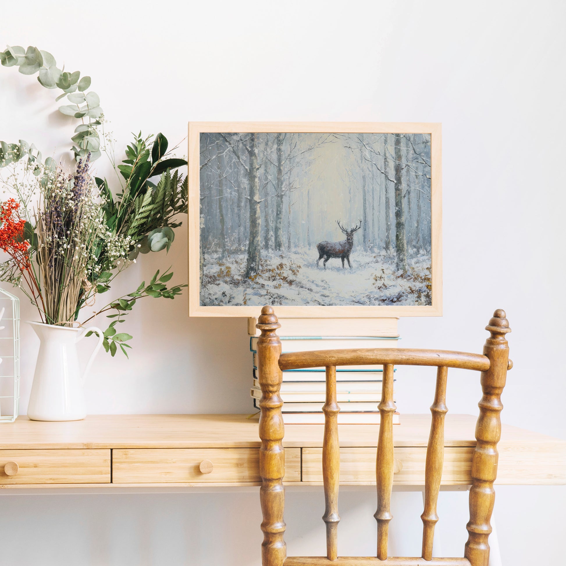 This serene winter artwork portrays a lone deer standing quietly in a snow-covered forest, surrounded by tall birch trees and a soft, misty light that illuminates the peaceful scene. The textured brushstrokes and cool color palette create a calming, atmospheric mood reminiscent of Nordic winters. Perfect for rustic cabin decor, woodland-themed interiors, or nature-inspired wall art collections, this print brings the quiet beauty of winter wildlife into your home. Ideal for living rooms, bedrooms, office spaces, and as a thoughtful gift for outdoor lovers and wildlife enthusiasts.