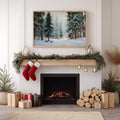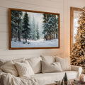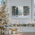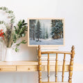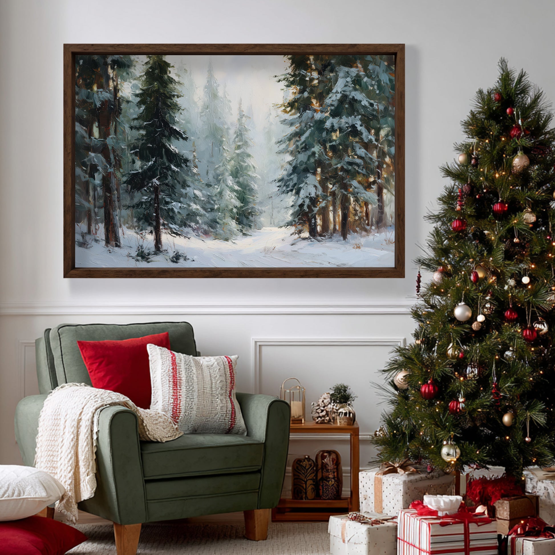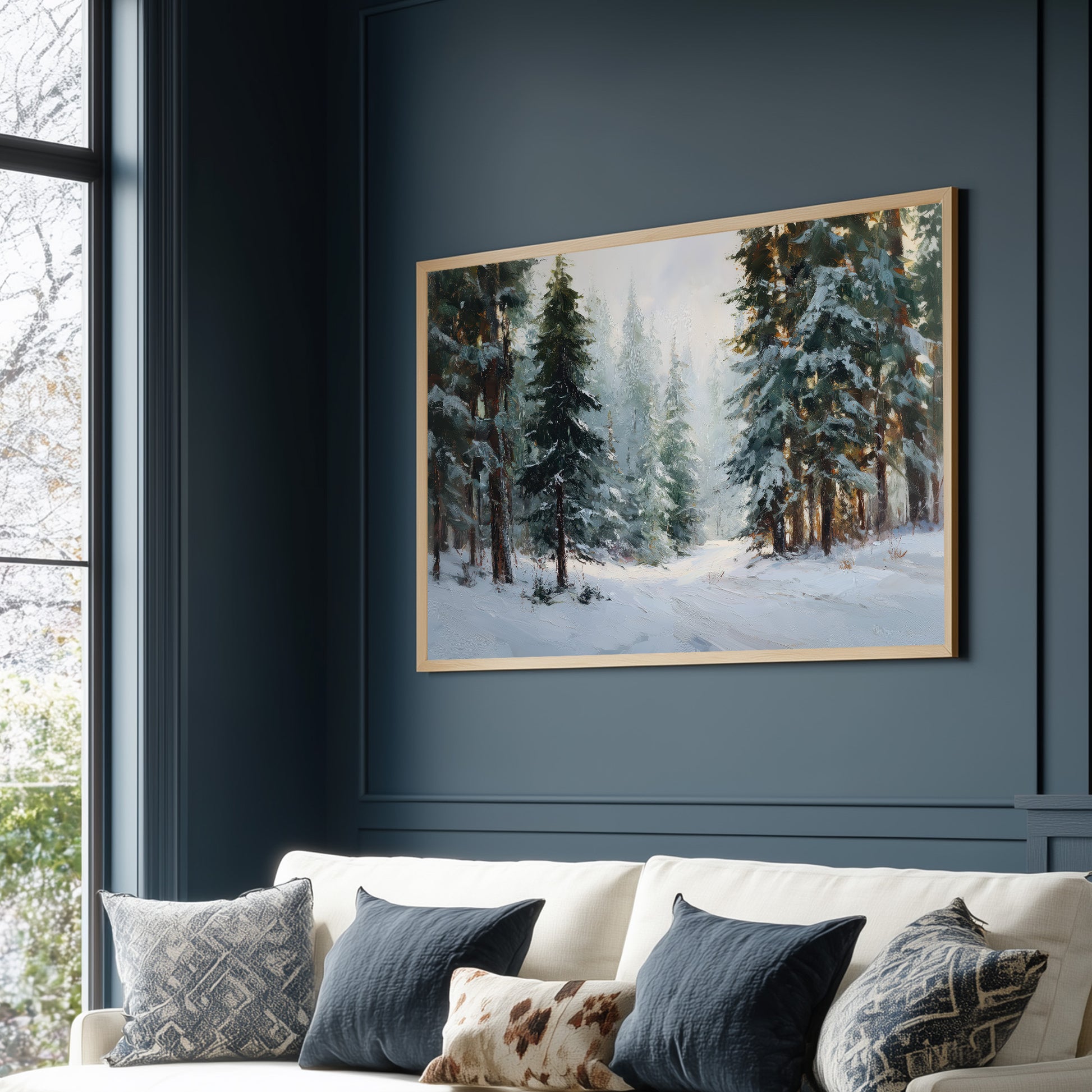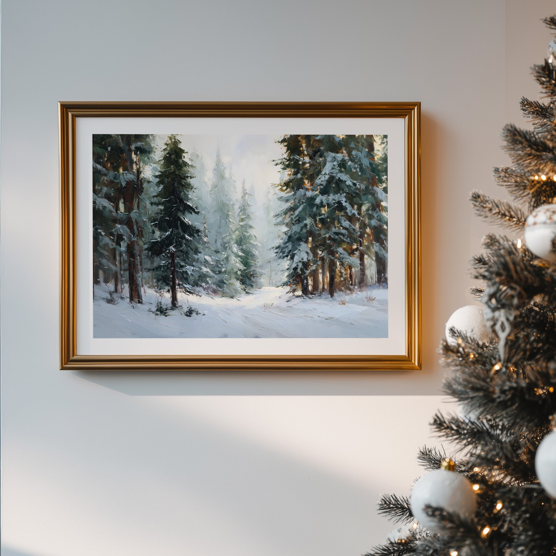 This artwork features a peaceful winter forest filled with tall snow-covered pine trees, soft morning light, and a calm woodland path. The serene atmosphere brings a sense of quiet beauty and natural winter magic to any room. Perfect for rustic home décor, Christmas decorations, cabin walls, or anyone who loves tranquil nature landscapes.