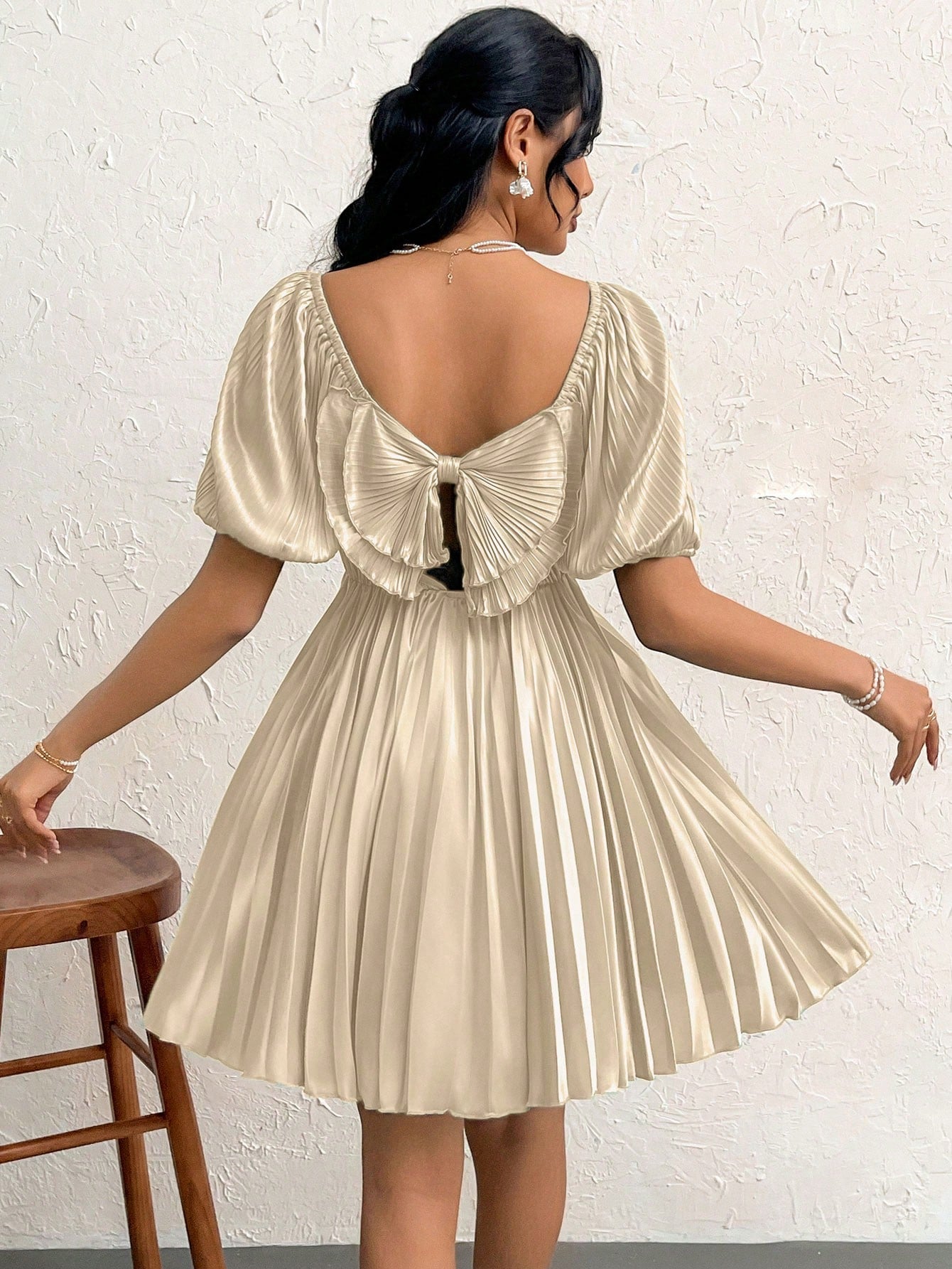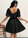 Women's Green Square Neck Vacation Dress with Back Bow Tie and Puff Sleeves