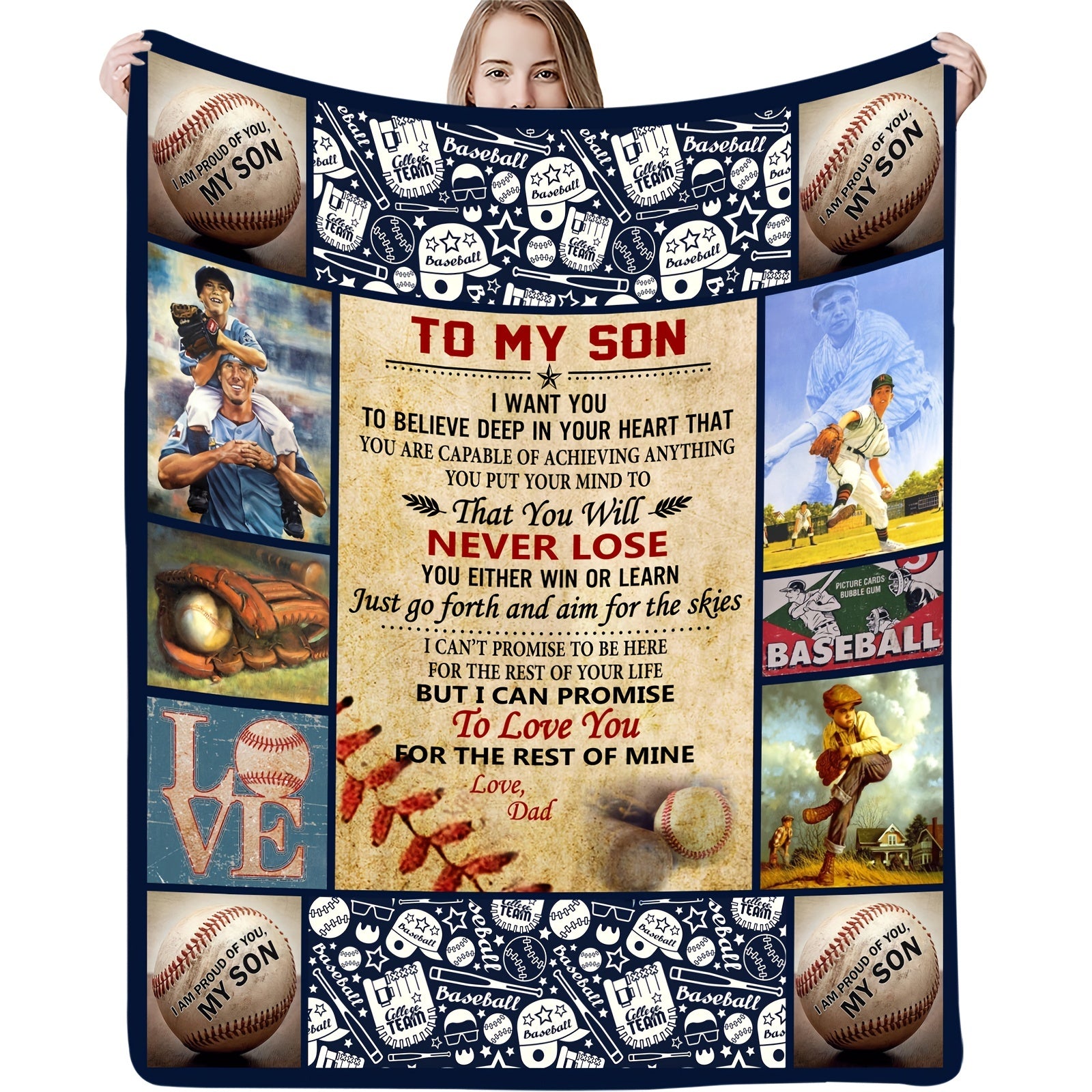 This Baseball Print Blanket features a sentimental letter from a father to his son. This heartfelt blanket is perfect for displaying and keeping cozy. Made of high quality materials, it's sure to last and be enjoyed for years to come.