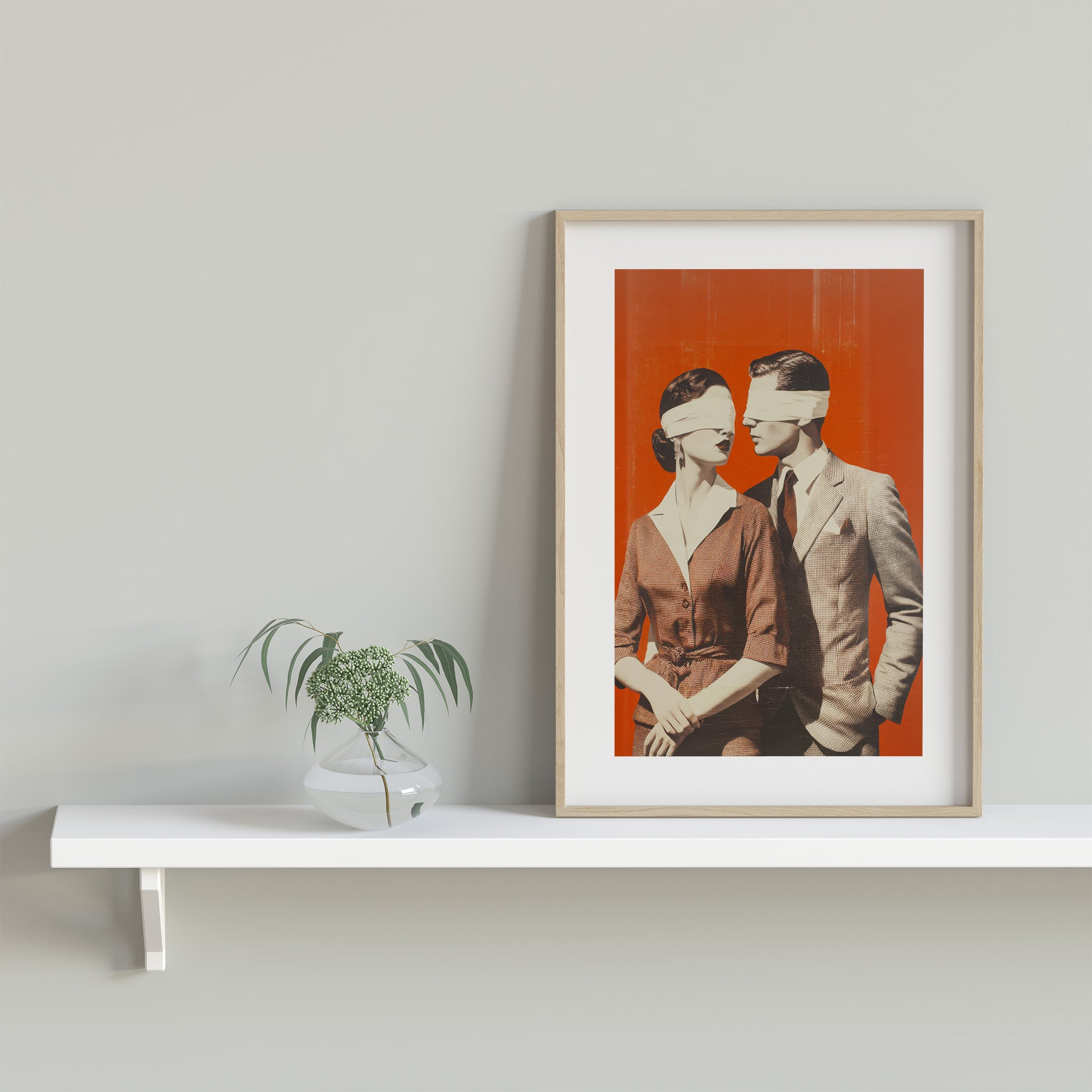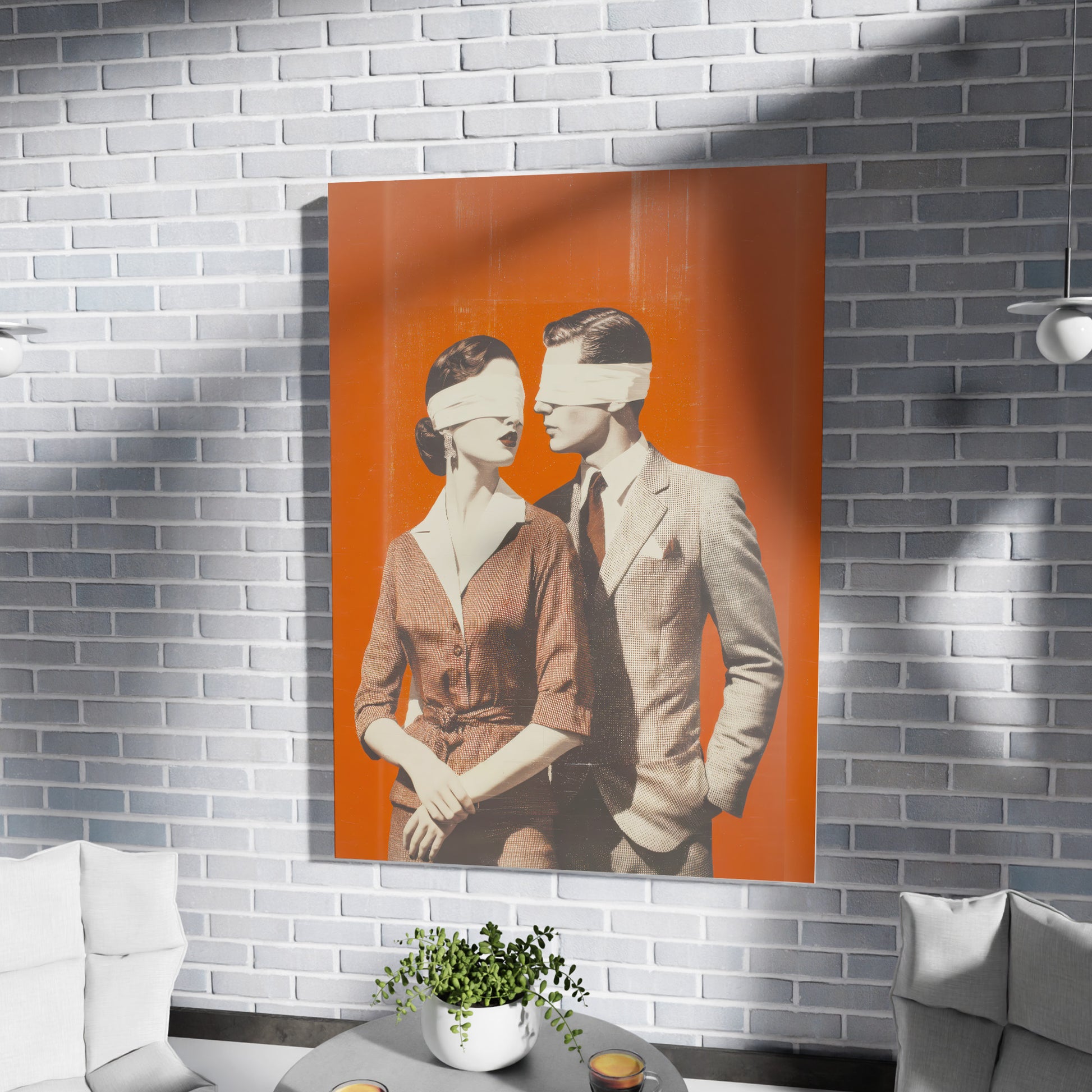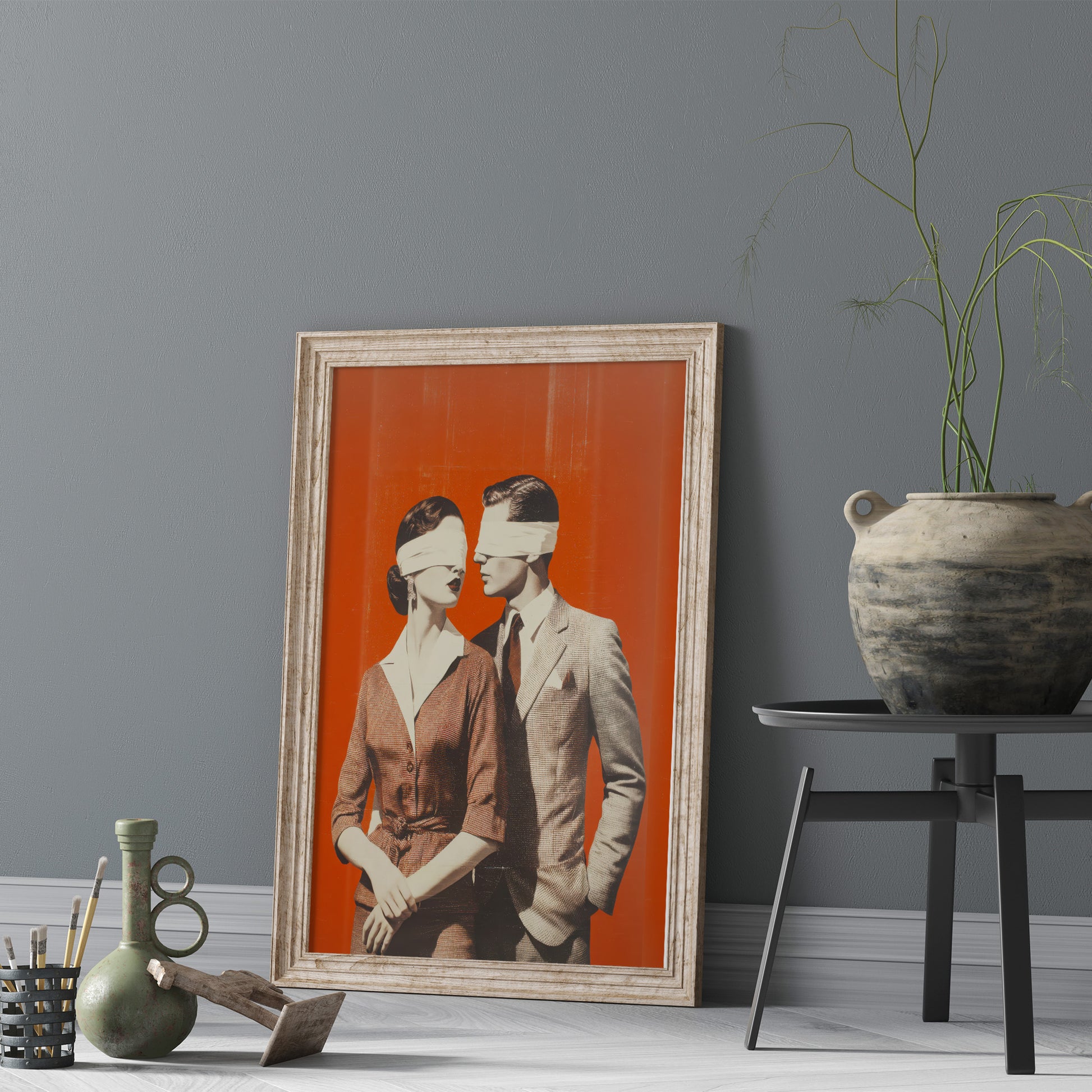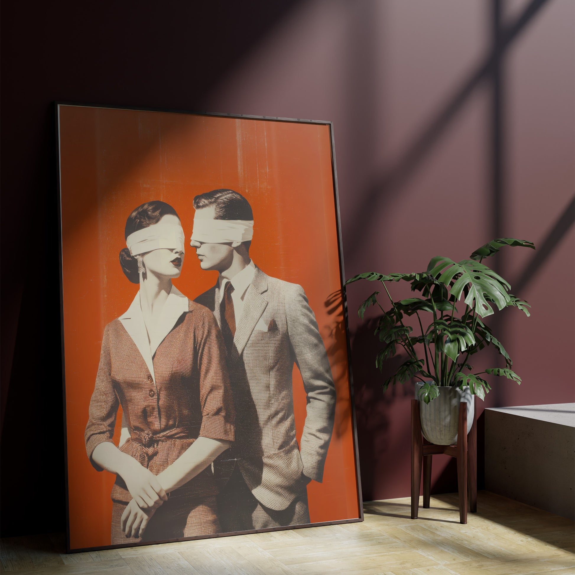 This artwork portrays a stylish vintage couple standing side by side, both blindfolded with white cloth, set against a bold orange background. The man wears a classic tailored suit with a tie, while the woman appears in an elegant mid-century dress, exuding poise and refinement. Their posture suggests confidence, closeness, and a sense of shared direction despite the absence of sight. The overall composition blends old-fashioned charm with a surreal emotional undertone.