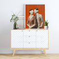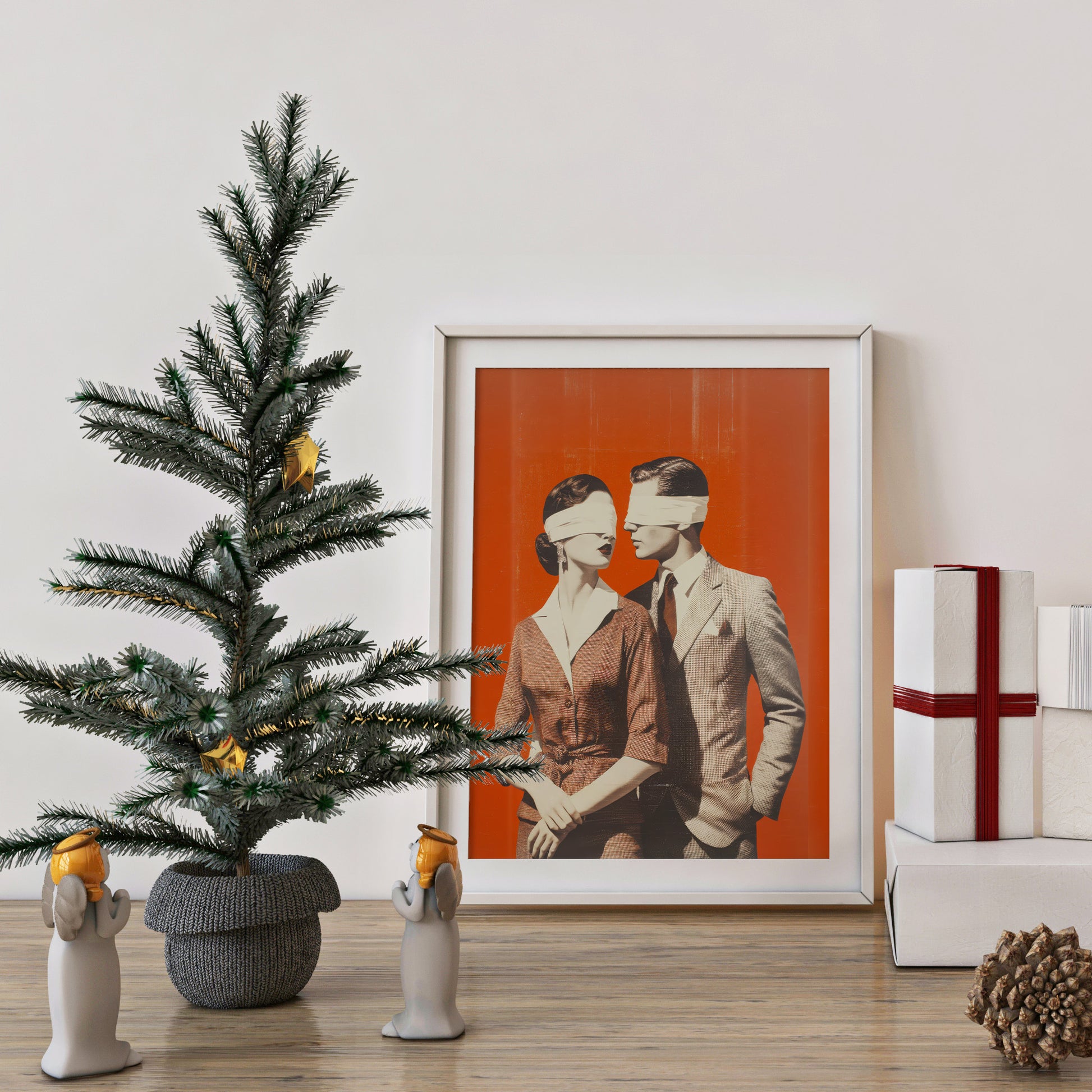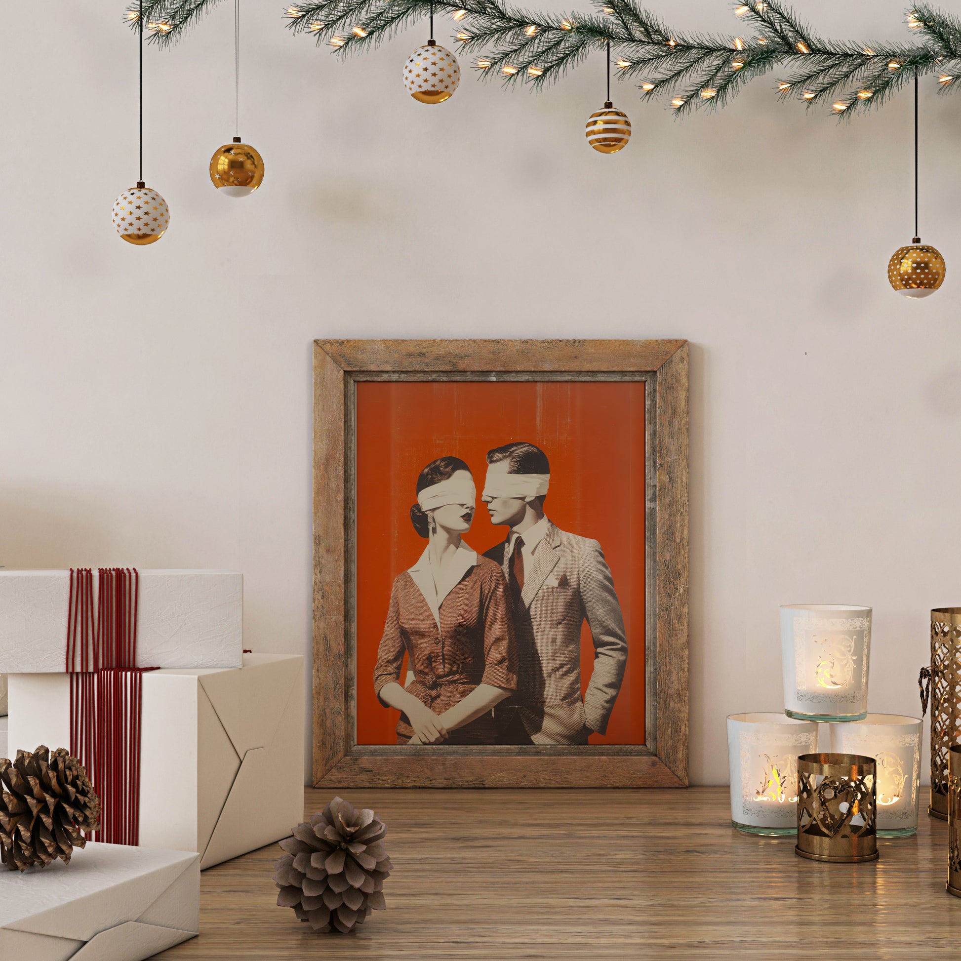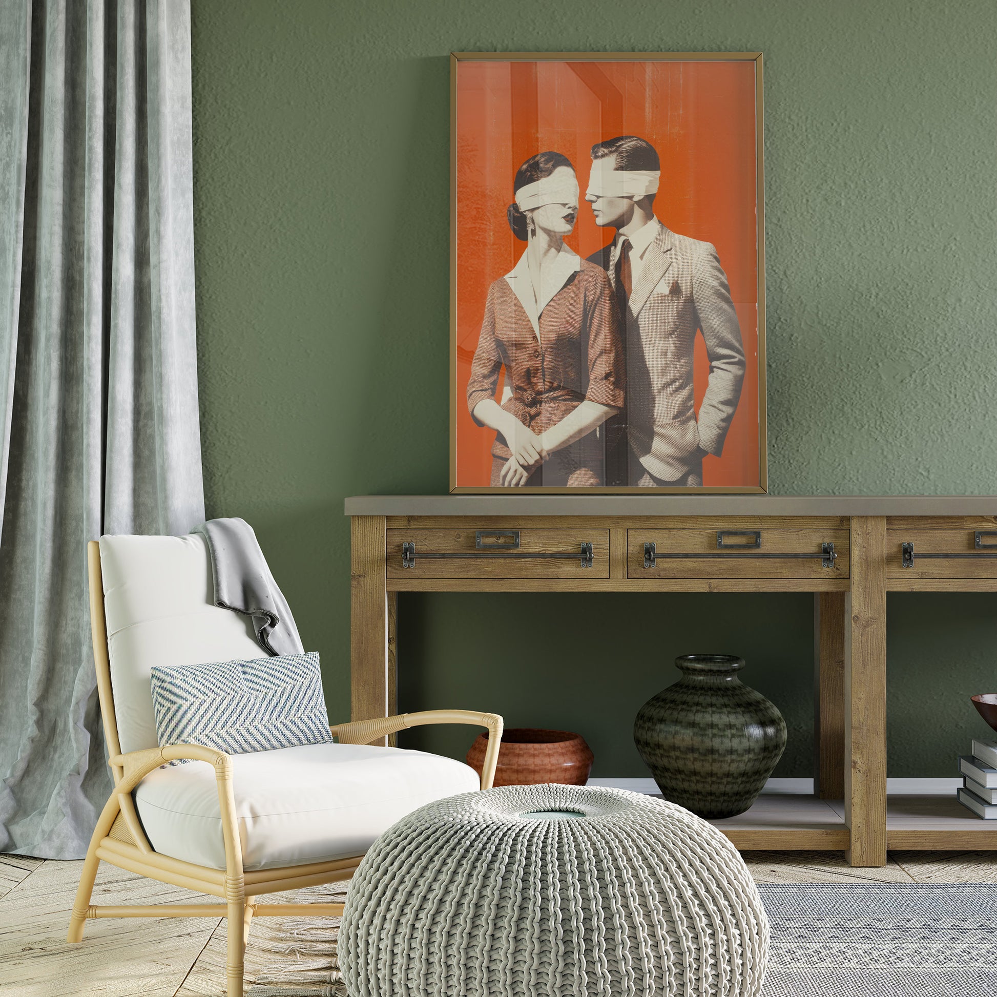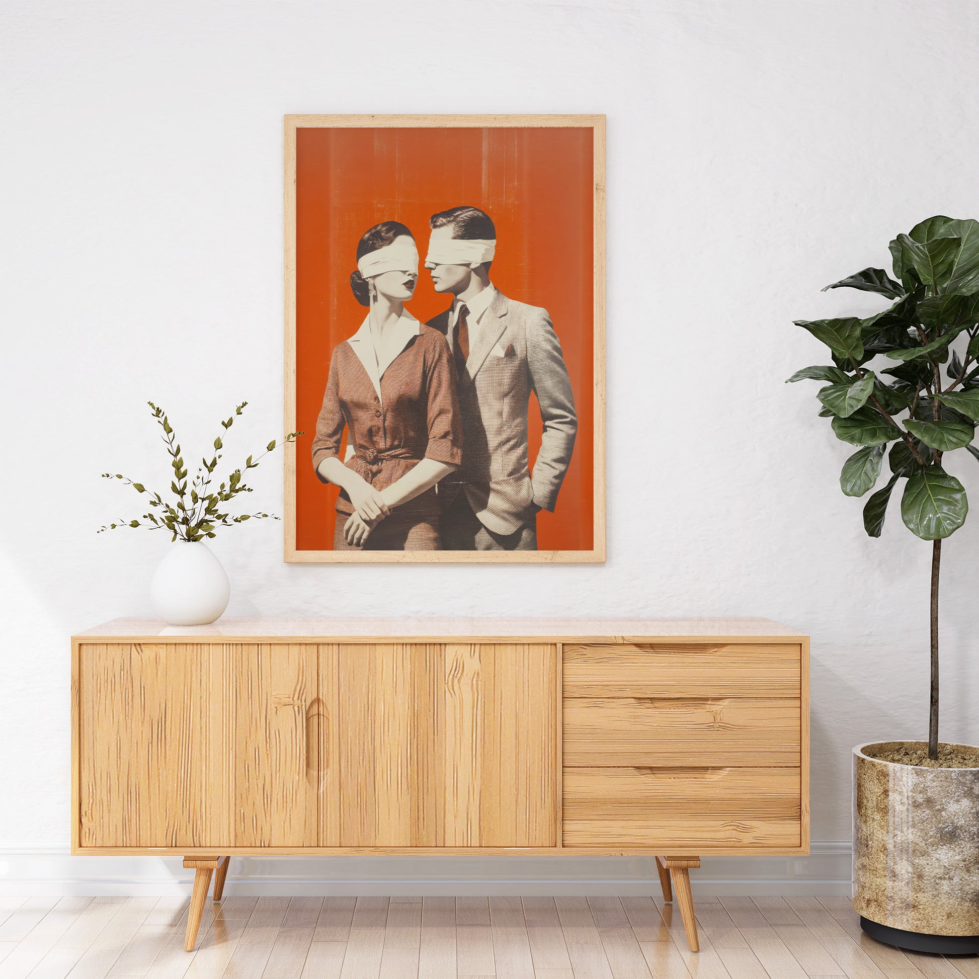 This artwork portrays a stylish vintage couple standing side by side, both blindfolded with white cloth, set against a bold orange background. The man wears a classic tailored suit with a tie, while the woman appears in an elegant mid-century dress, exuding poise and refinement. Their posture suggests confidence, closeness, and a sense of shared direction despite the absence of sight. The overall composition blends old-fashioned charm with a surreal emotional undertone.