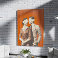 Blindfolded Vintage Couple Standing Together Against Bold Orange Backdrop In Retro Artwork Filled With Mystery, Elegance, And Timeless Style