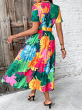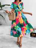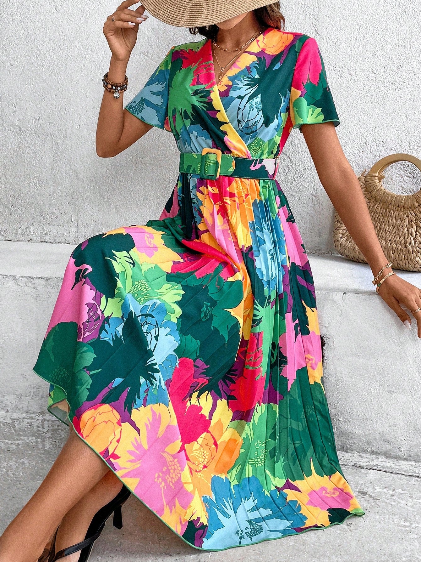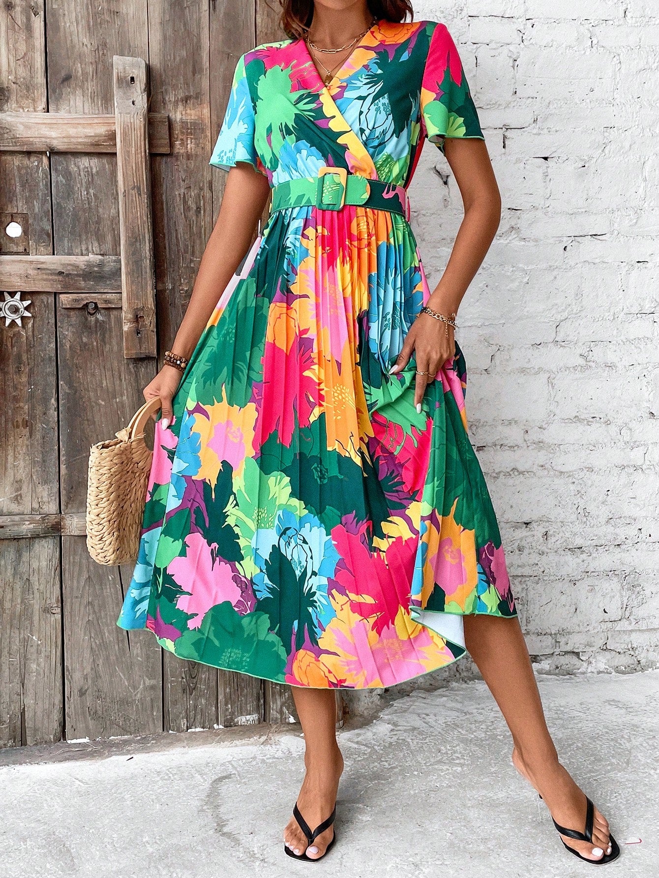Blooming Beauty: Women's Botanical Print Pleated Short Sleeve Dress