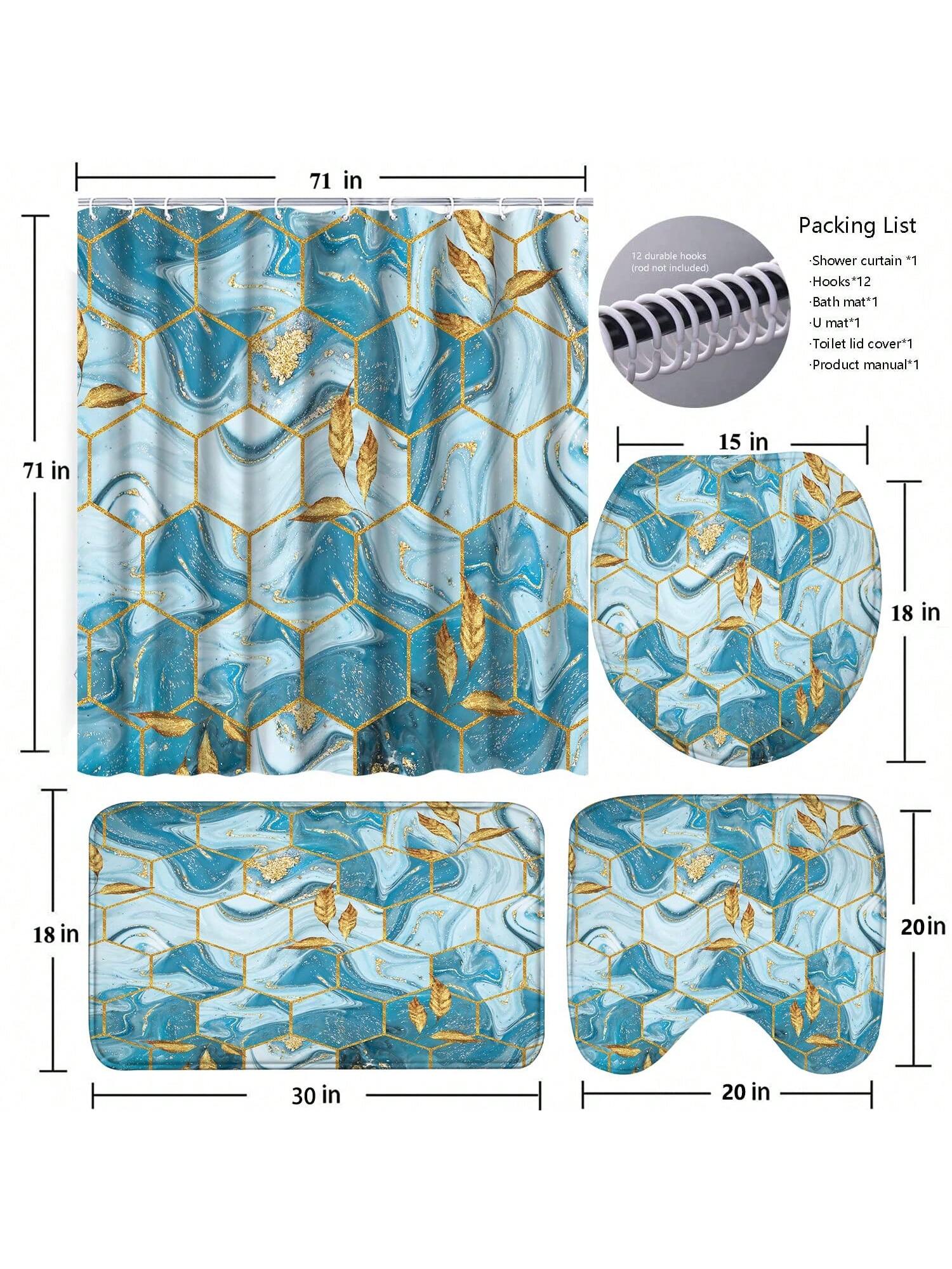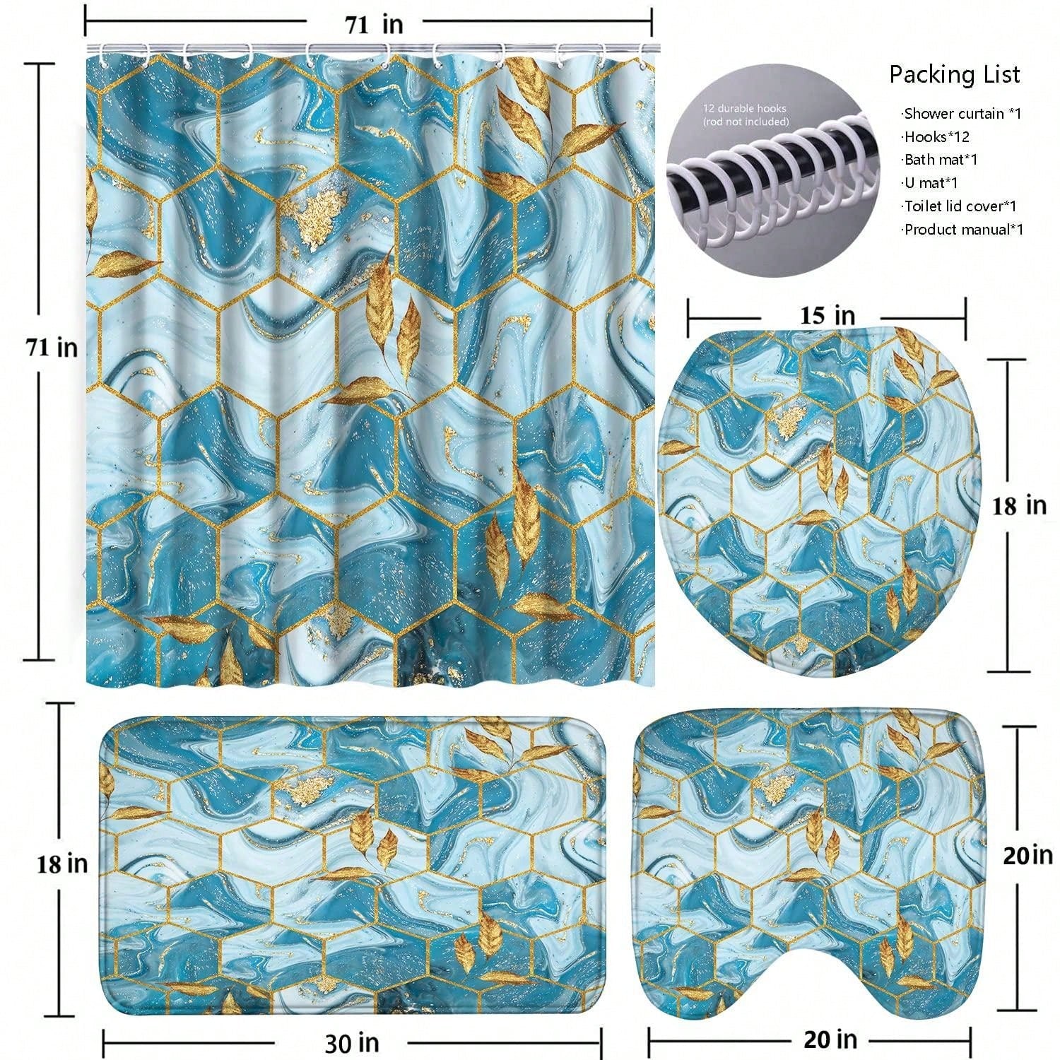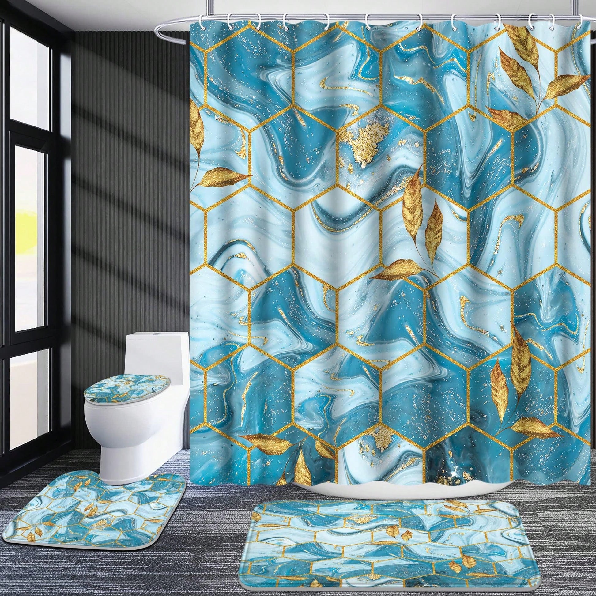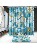 Blue and White Marble Bathroom Accessory Set with Non-Slip Rugs and Waterproof Shower Curtain