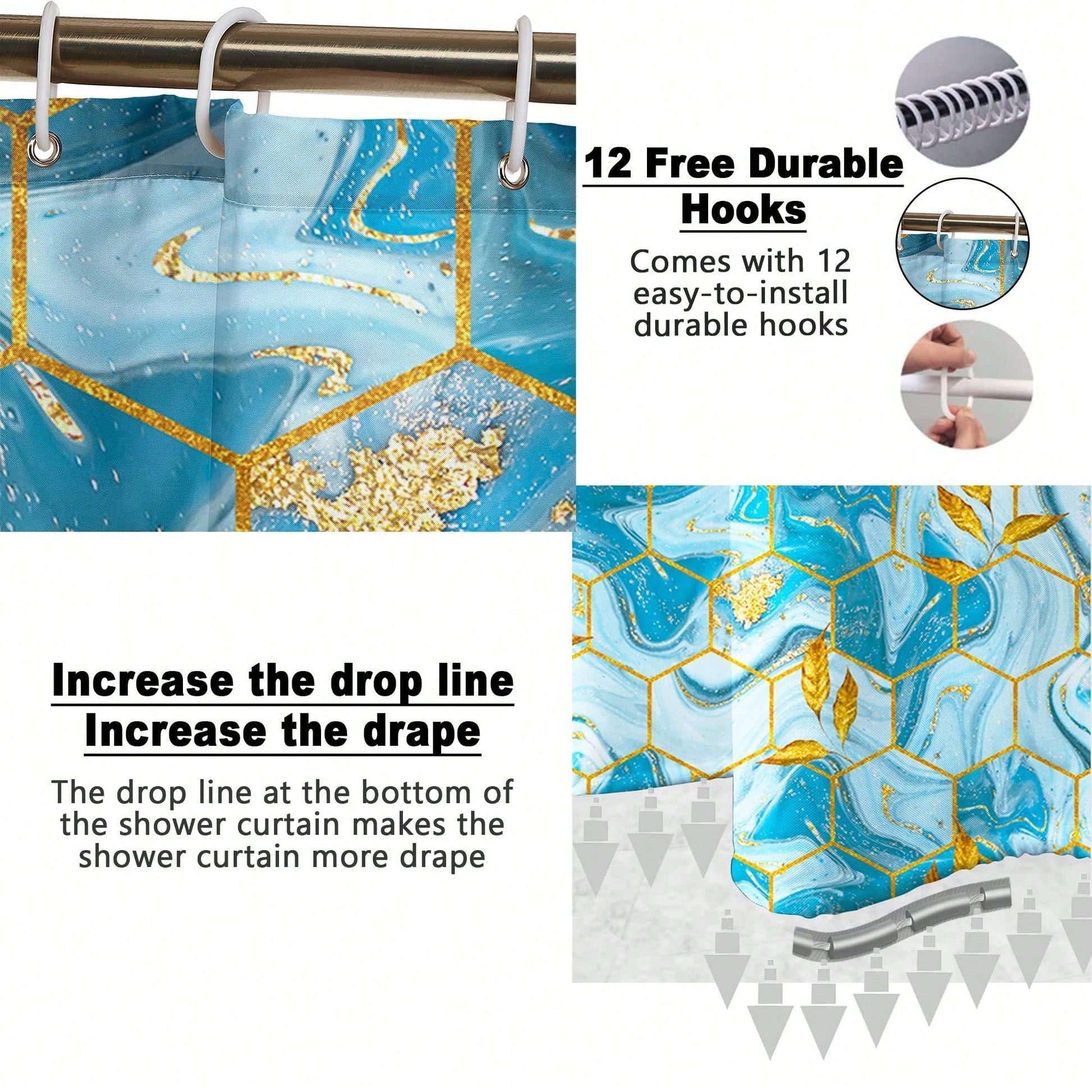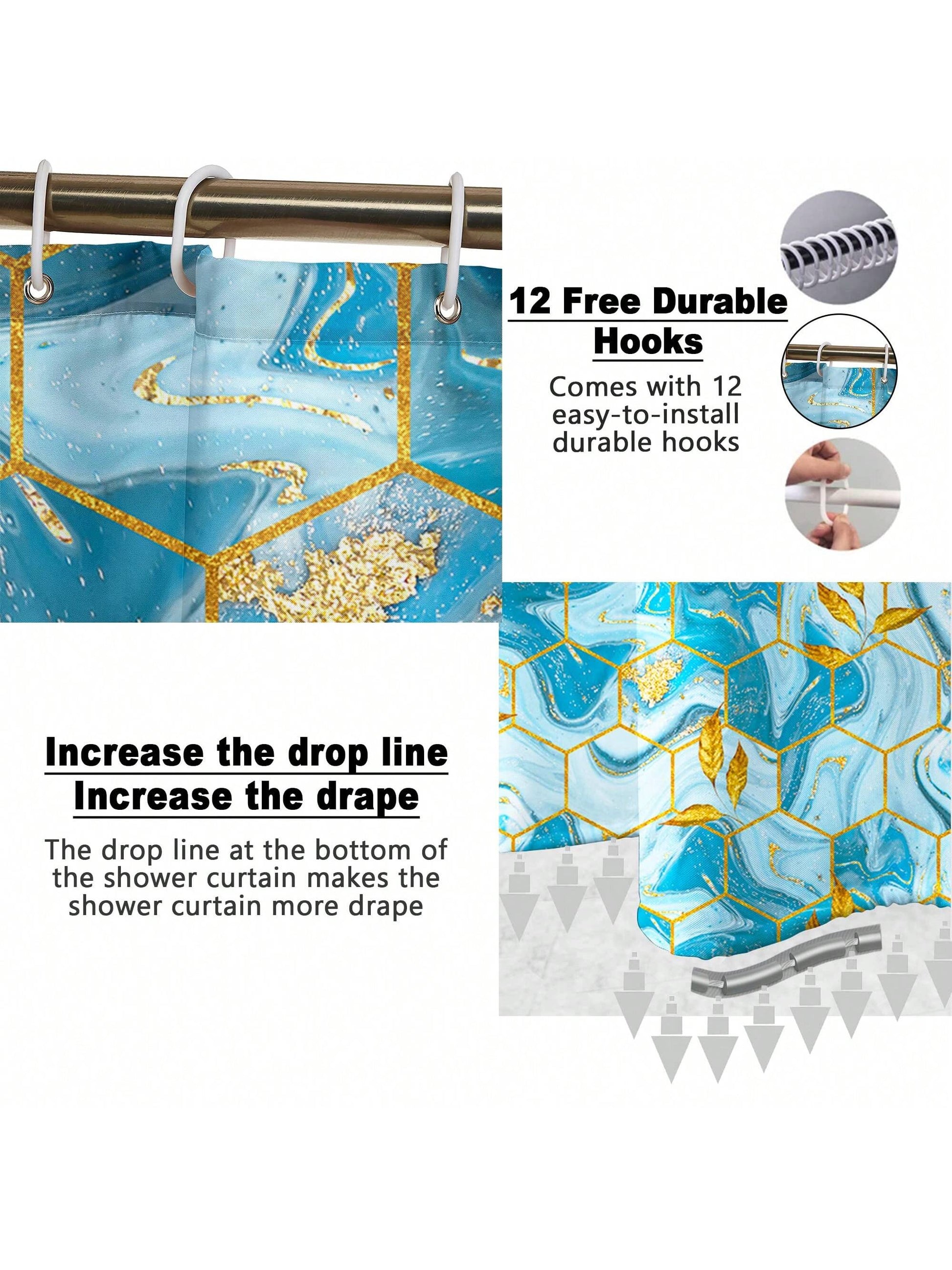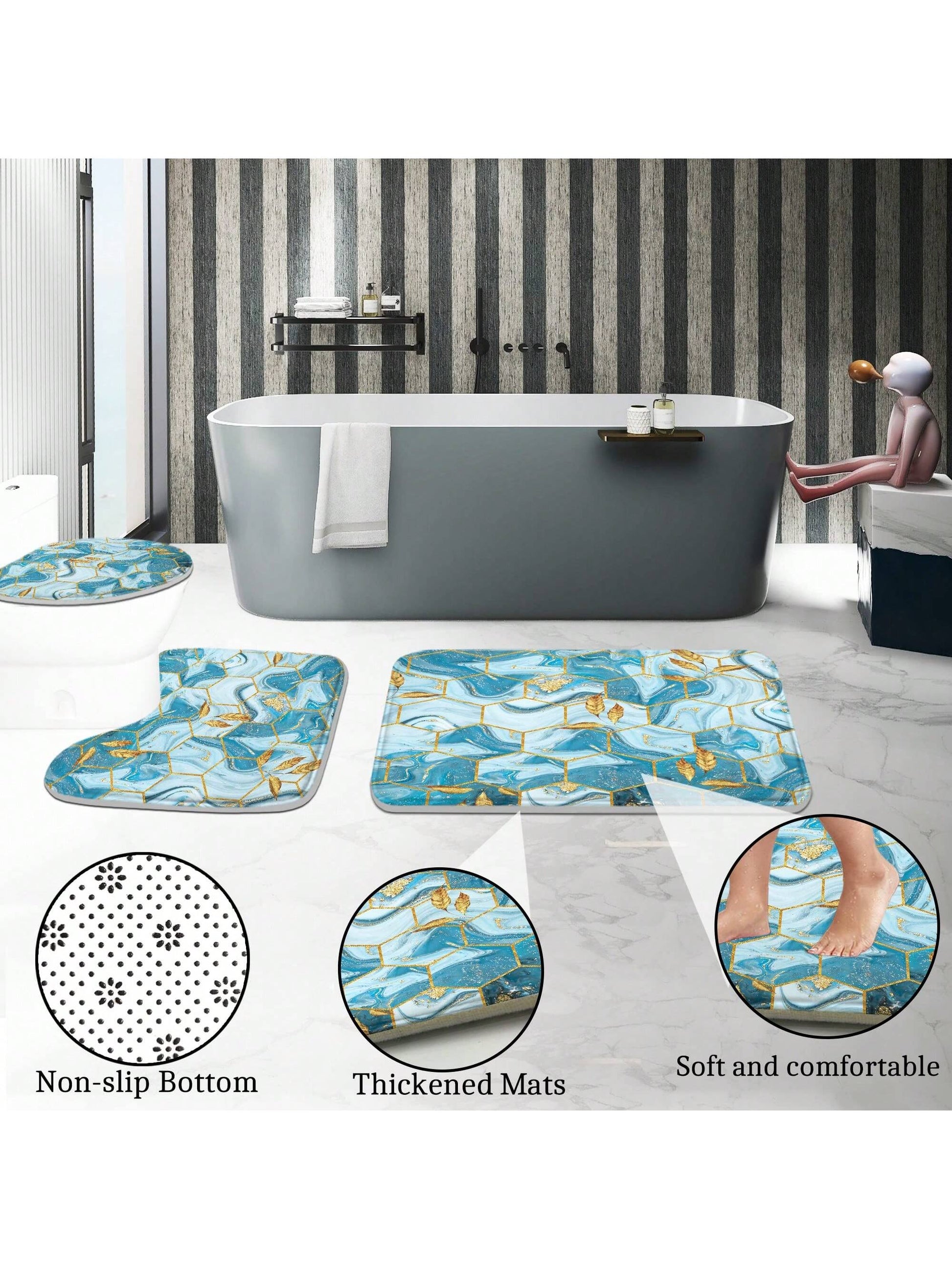 Blue and White Marble Bathroom Accessory Set with Non-Slip Rugs and Waterproof Shower Curtain