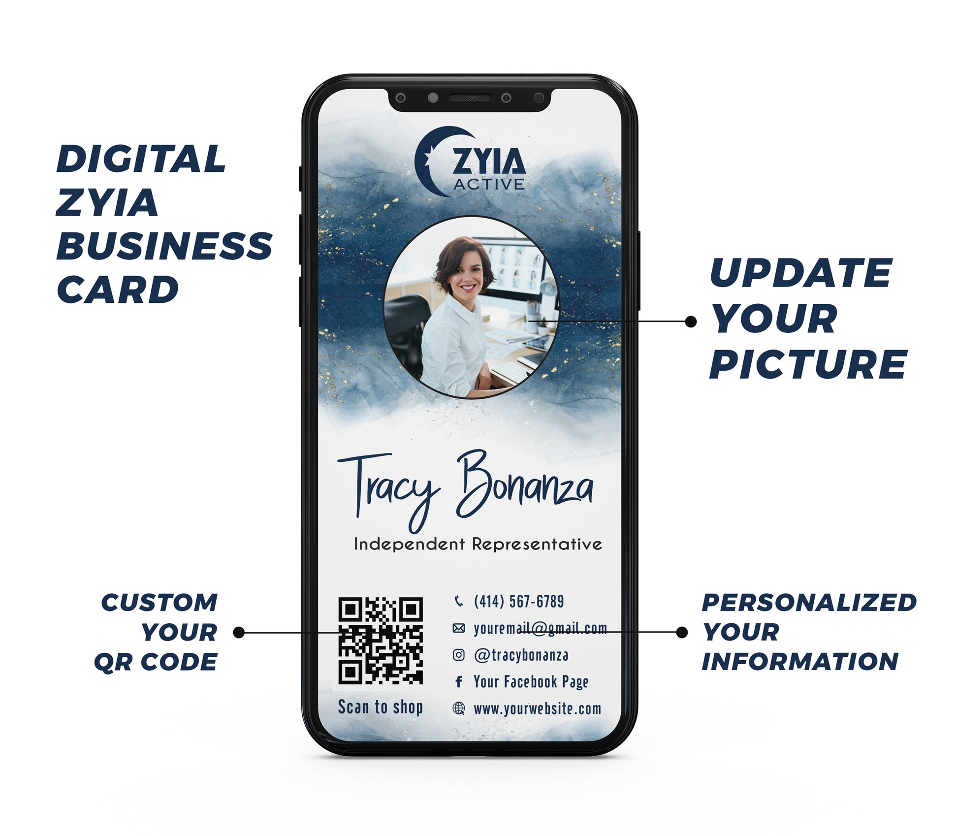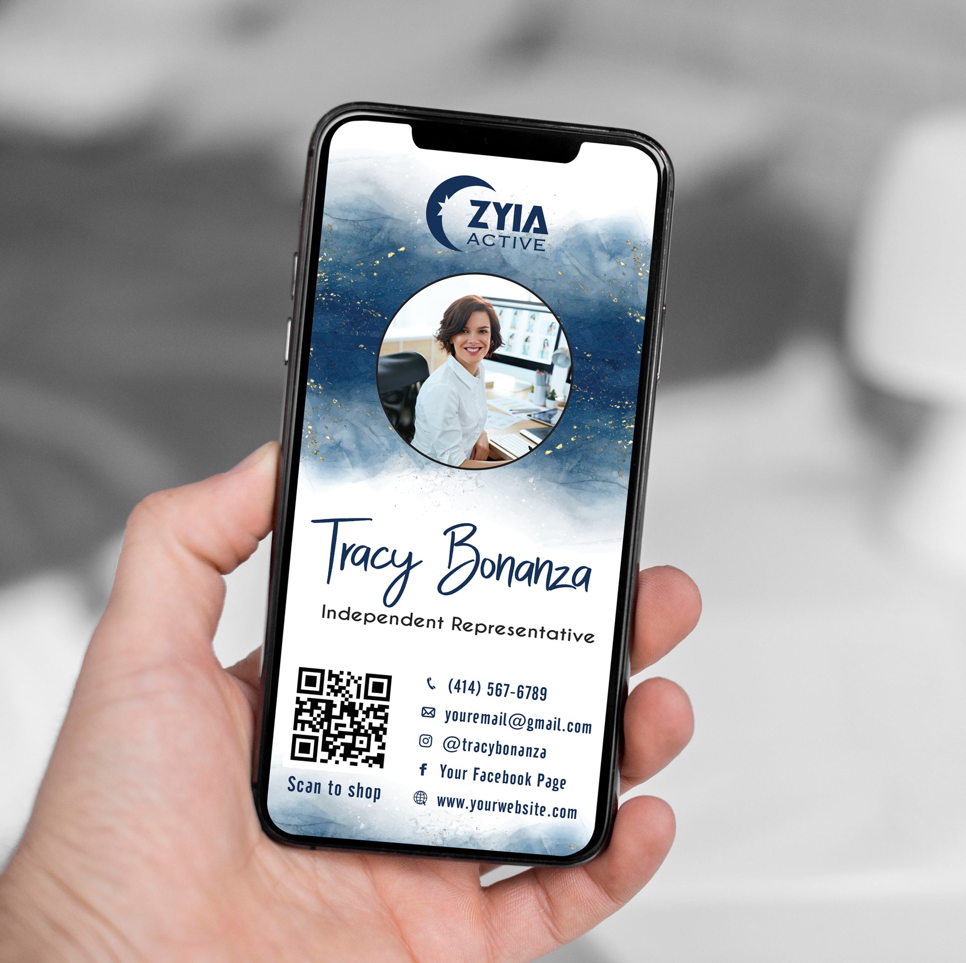 Blue Gold Digital ZYIA Business Card, Ecard Zyia Custom Qr Code, Ecard ZYIA Template, Personalized Zyia QR Code, Custom Zyia Cards ZA54