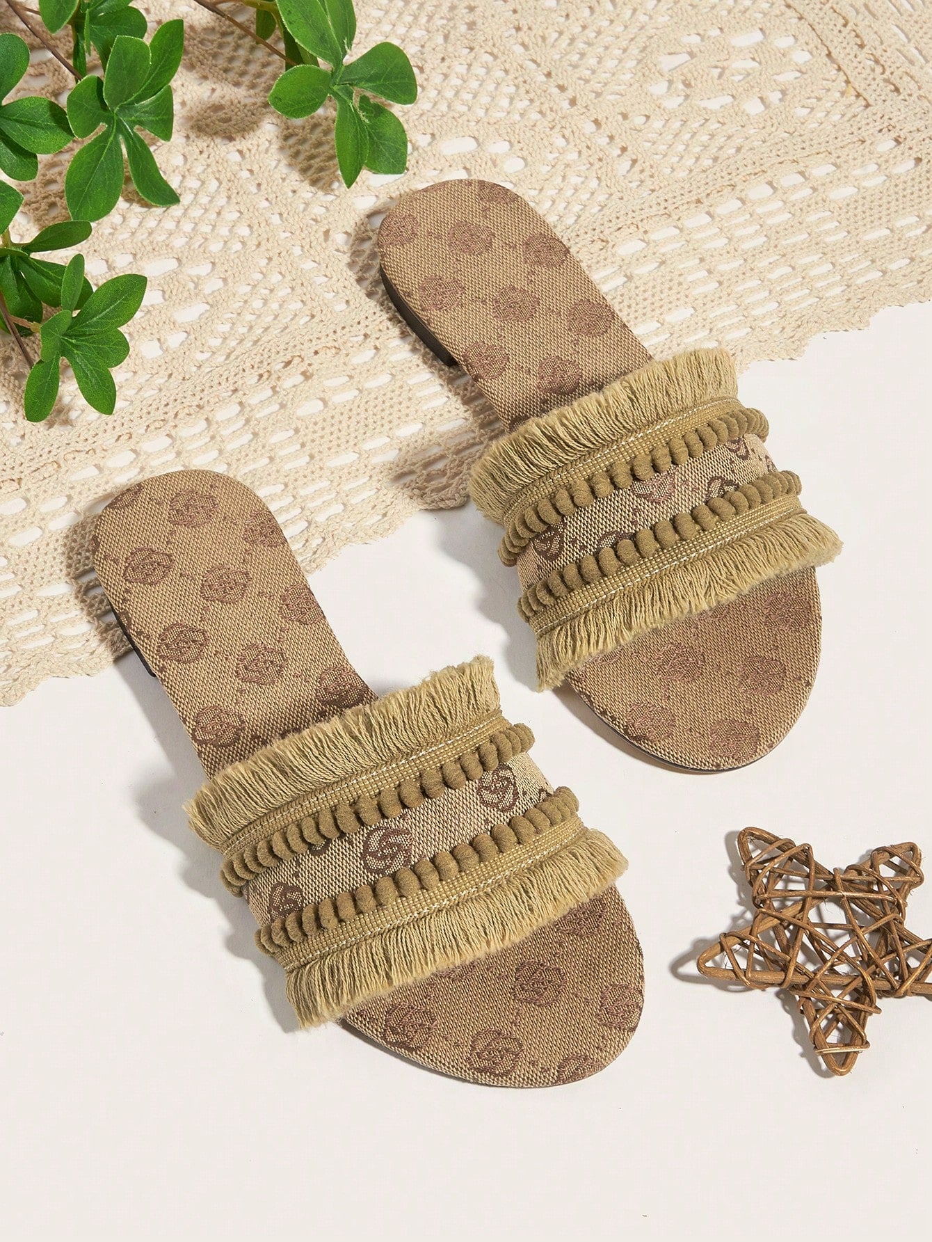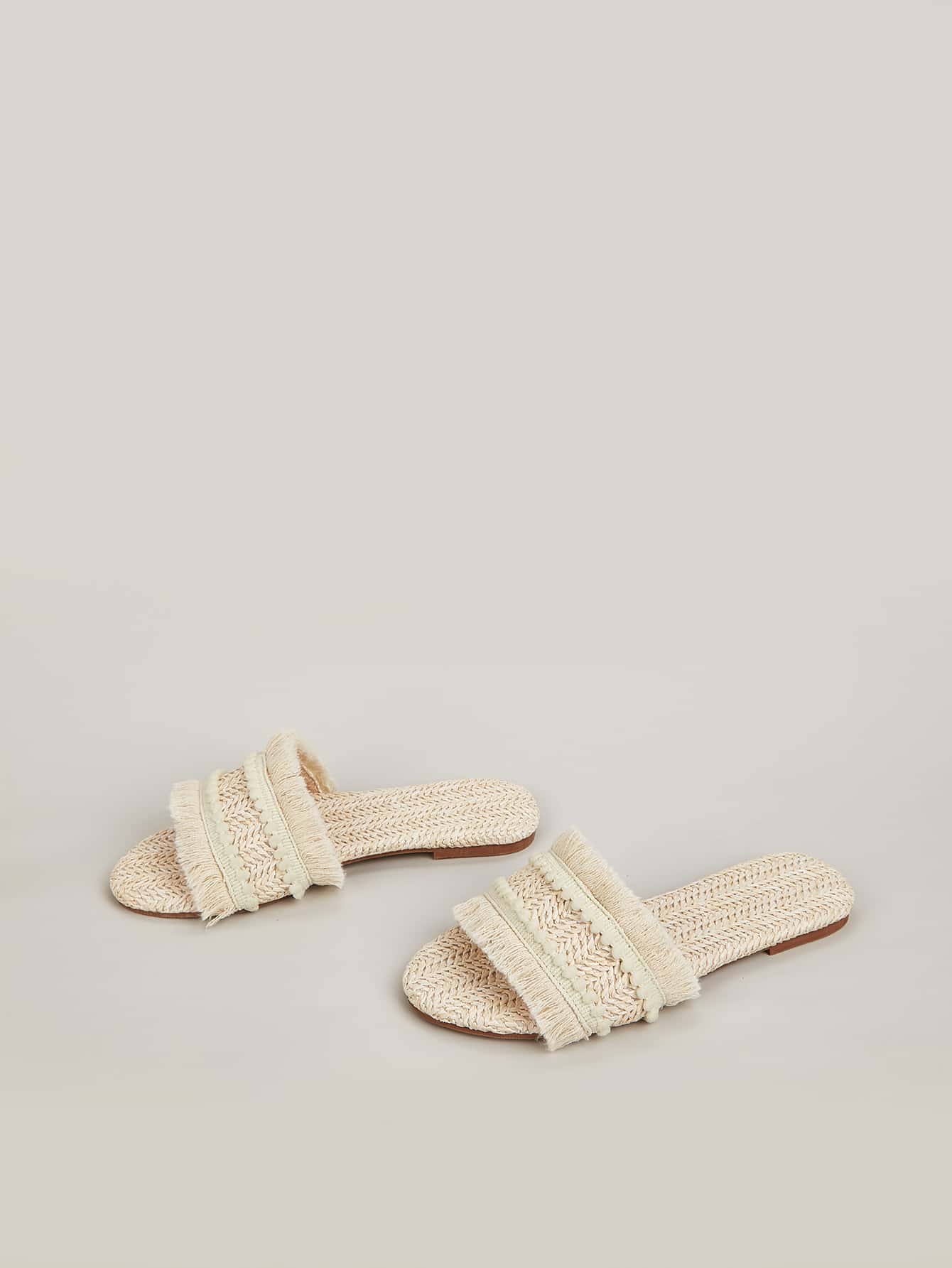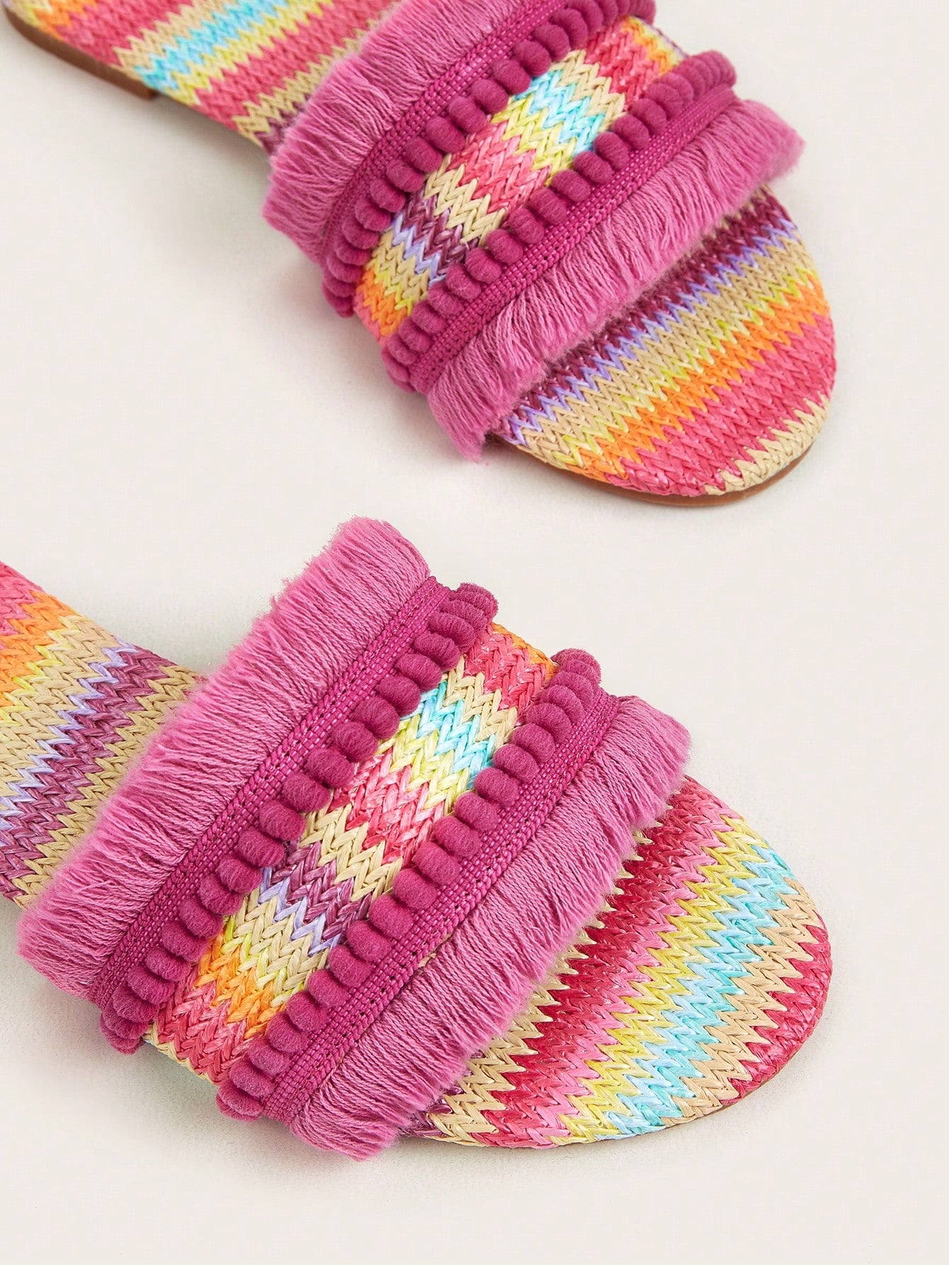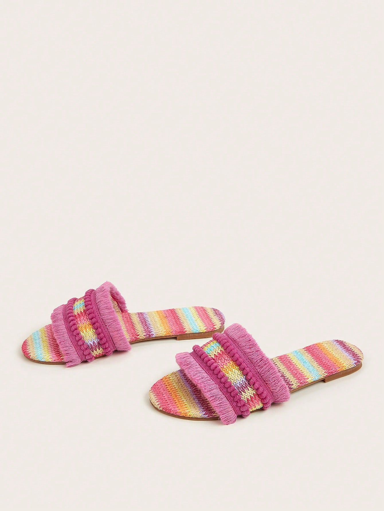 sandals. Made with multicolor woven straw and adorned with tassel accents, these sandals will add a playful touch to any outfit. With a comfortable fit and expert craftsmanship, these sandals are perfect for any bohemian fashionista."